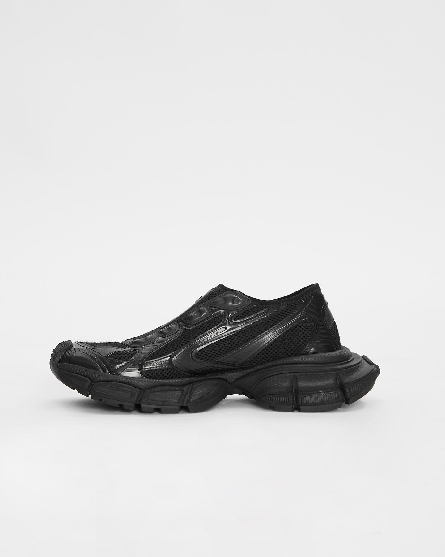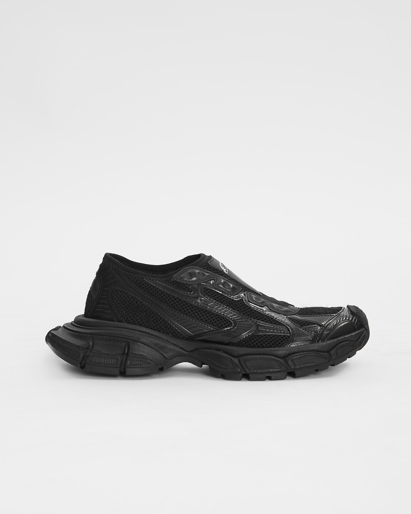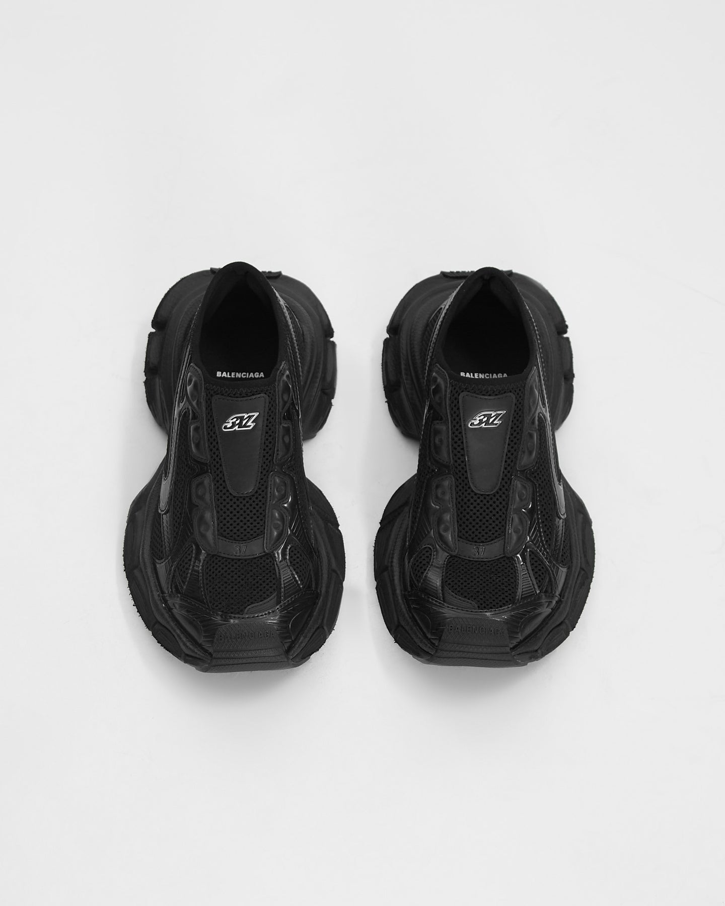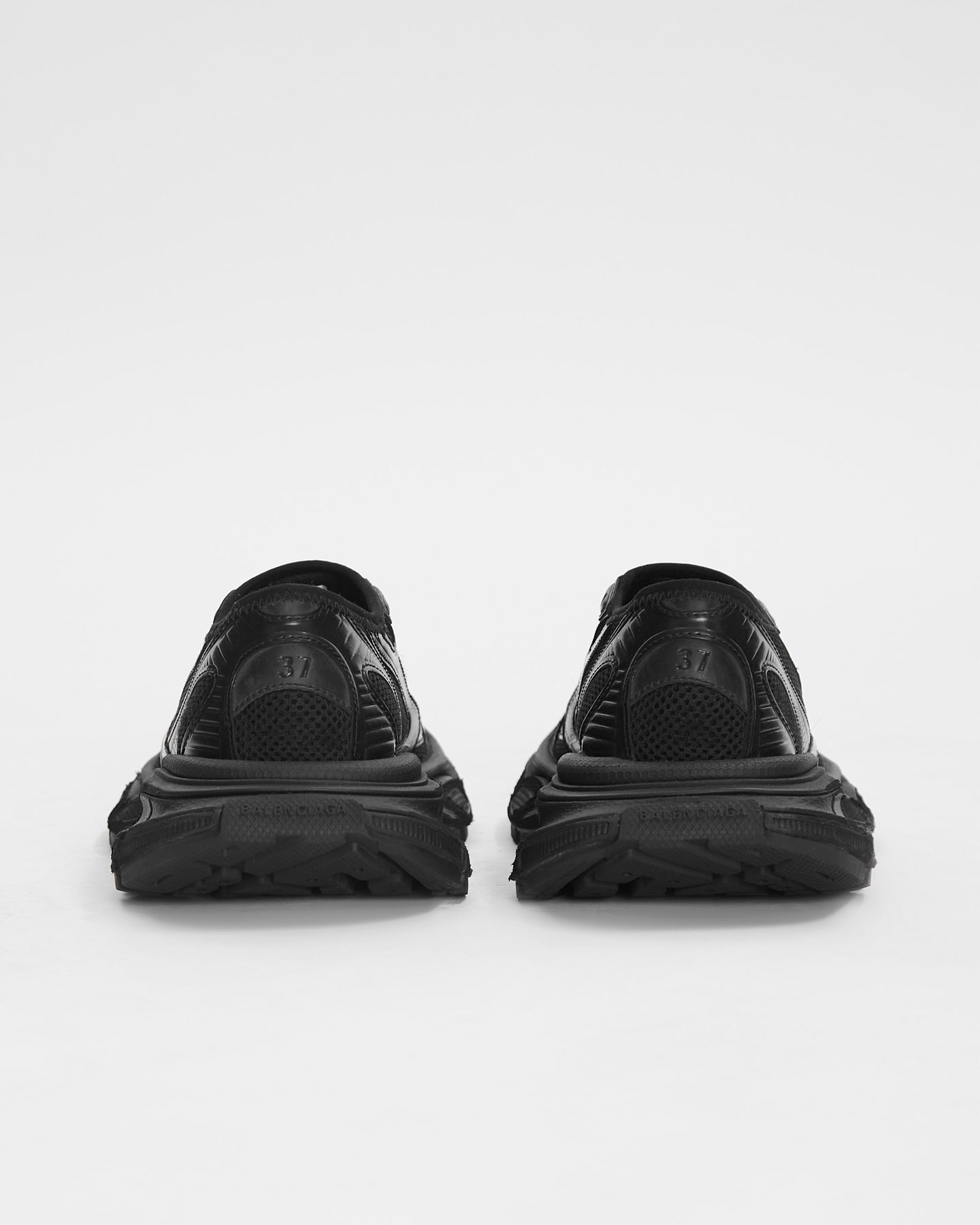 Balenciaga 3XL Slip On in black features worn-out effect, Balenciaga logo at the edge of the toe and at back and debossed size on the upper and at the back of the heel.