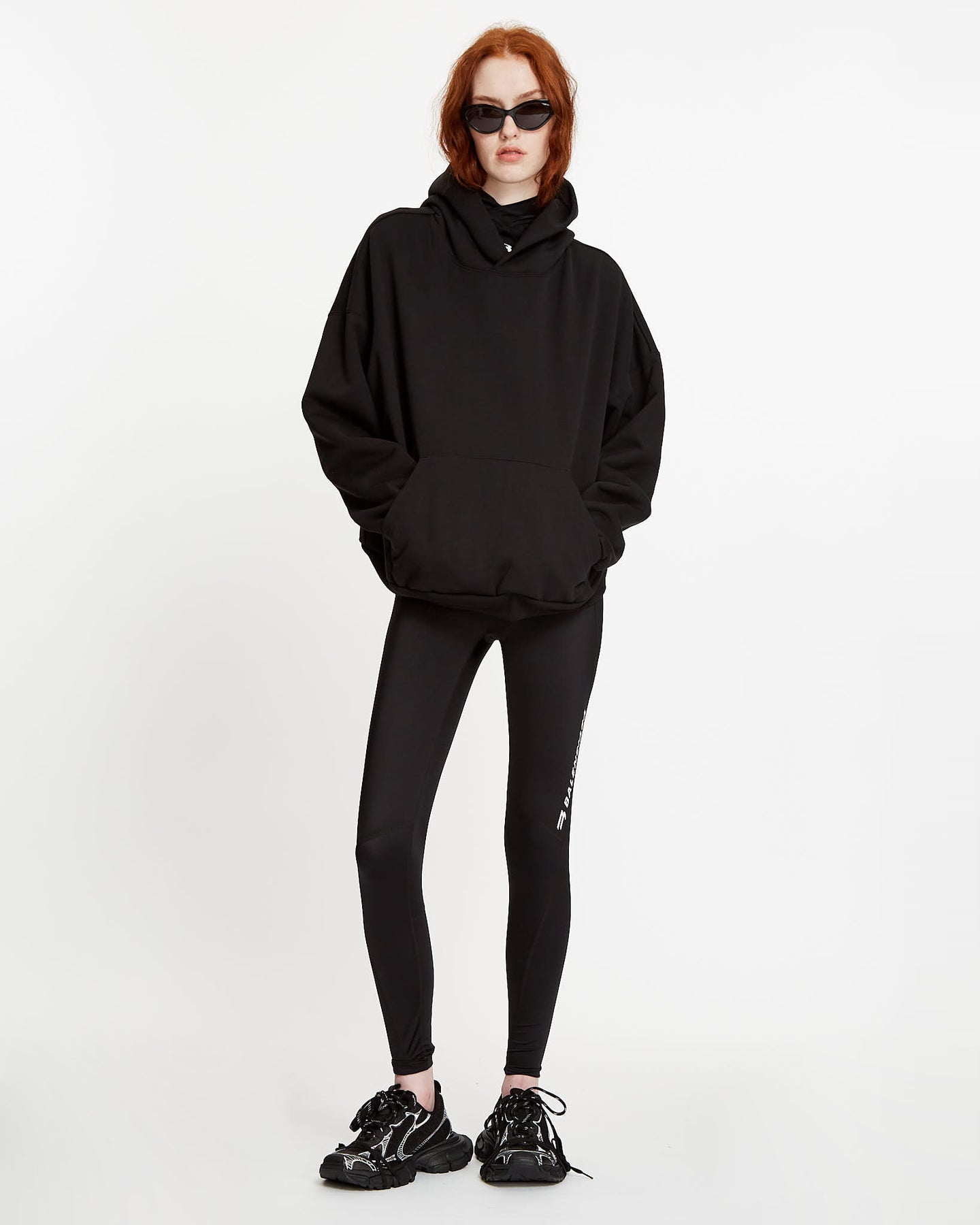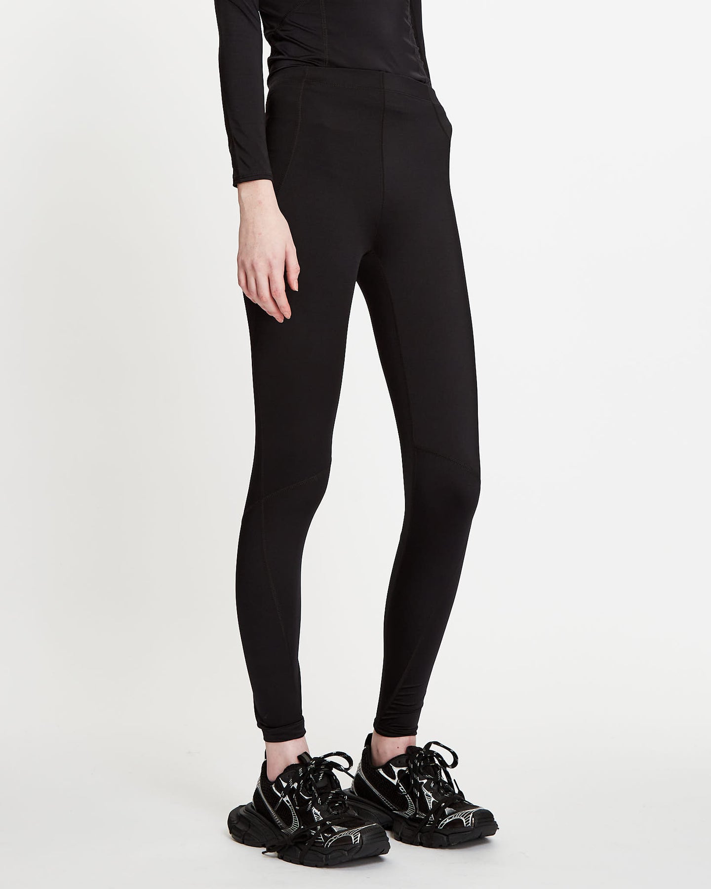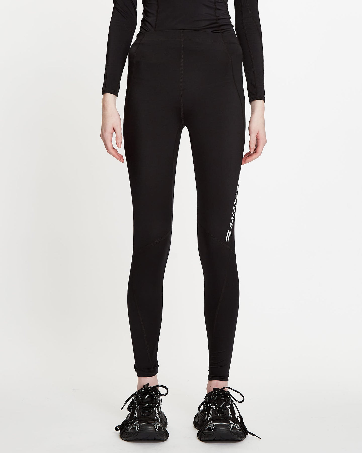 Balenciaga Activewear Leggings in black features a body con silhouette. Details include stretch spandex, all over topstitching details, mid-waist, elasticated anti-slip waistband, v-shaped at back and sporty B logo printed on left leg