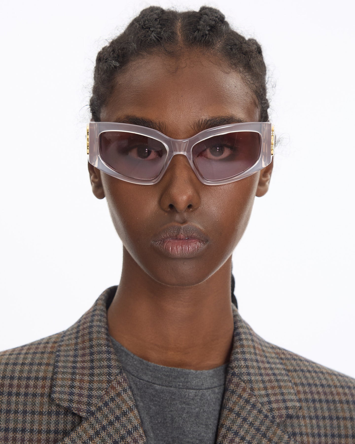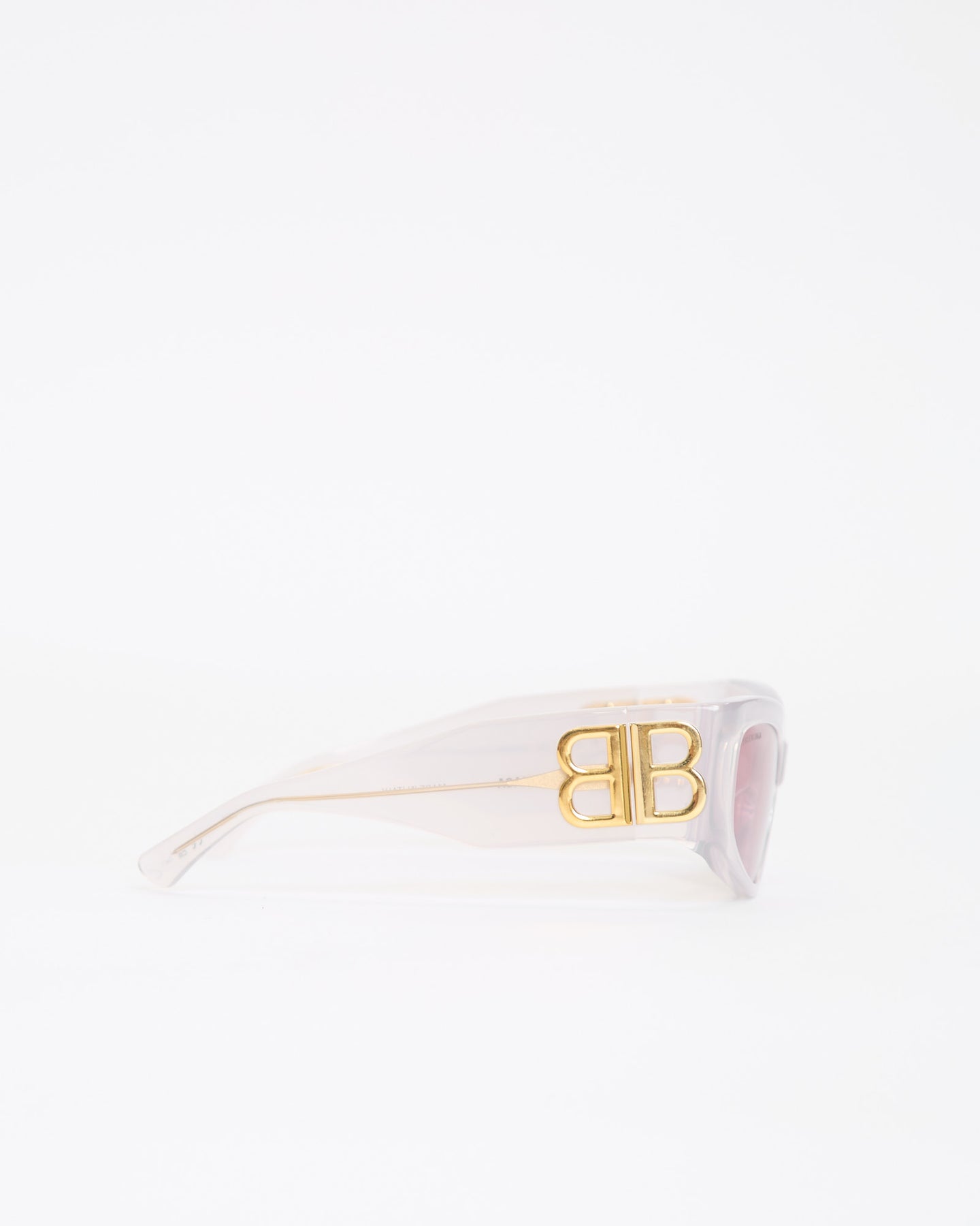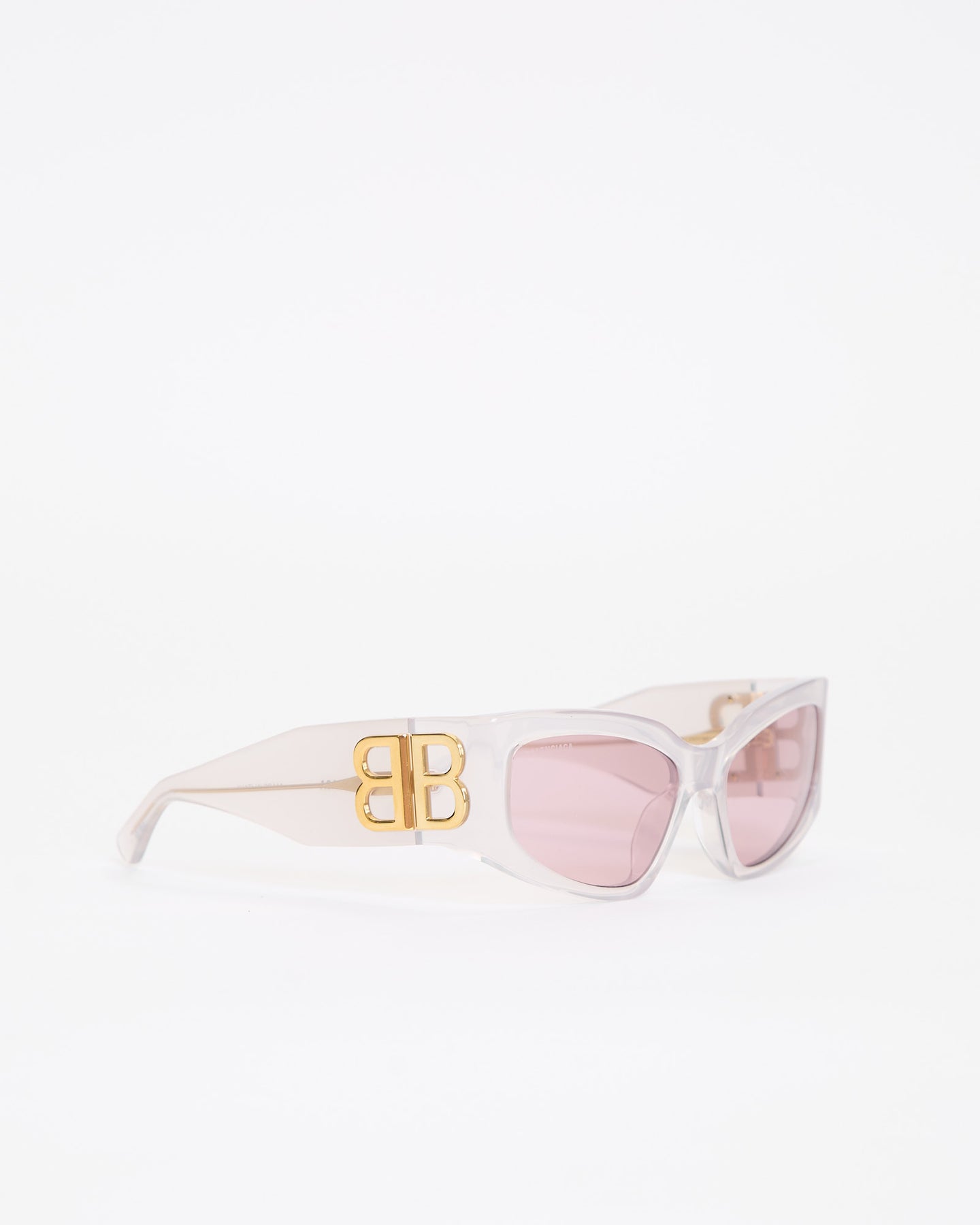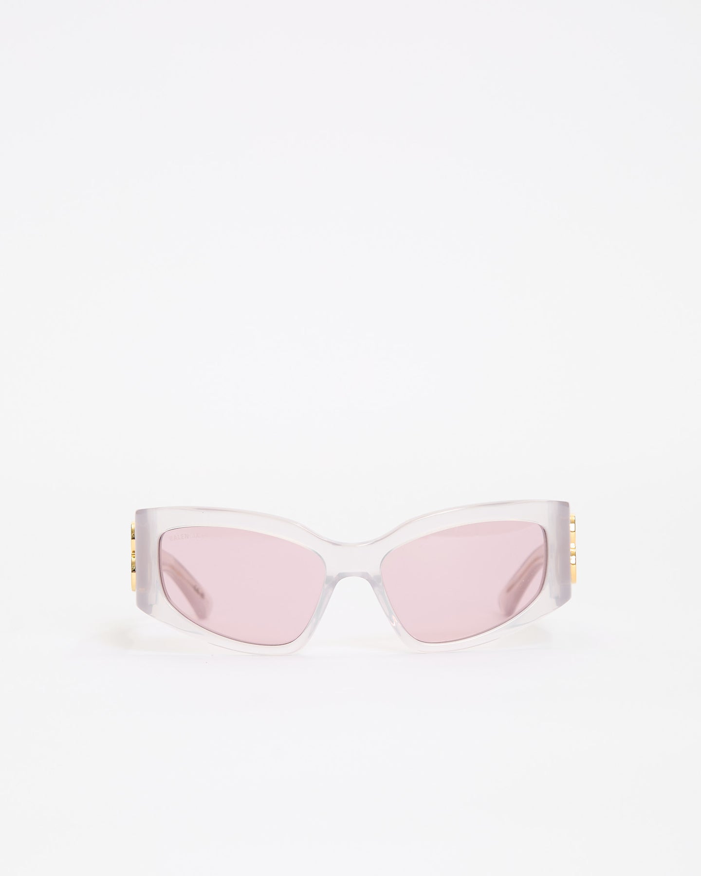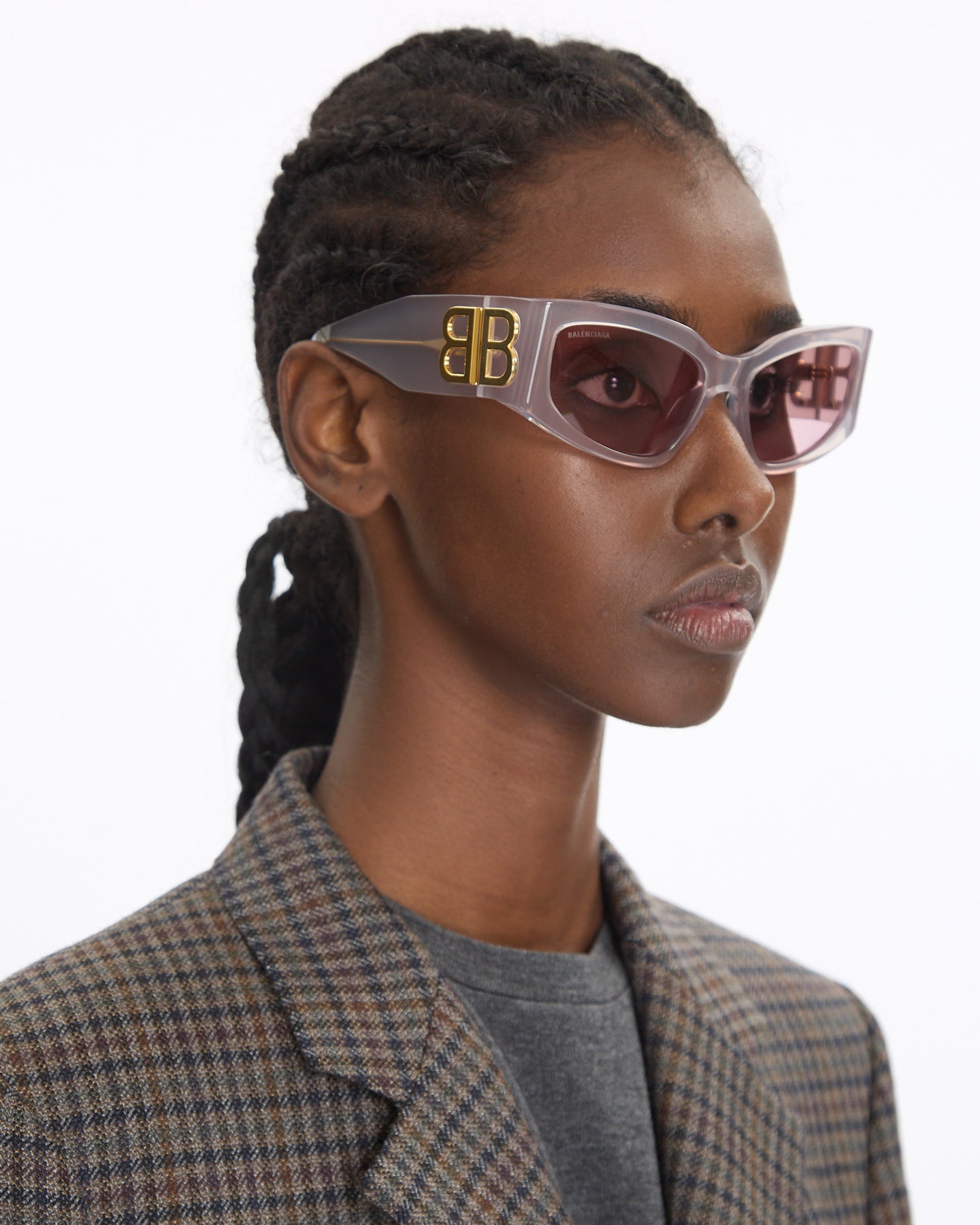 Balenciaga Bossy Cat in milky pink are composed of Eastman Acetate Renew, an acetate alternative partially made of bio-based and recycled content. Details include cat shape, standard fit, hidden hinges within the shiny gold BB logo, lasered logo on the right lens and 100% UVA/UVB protection.