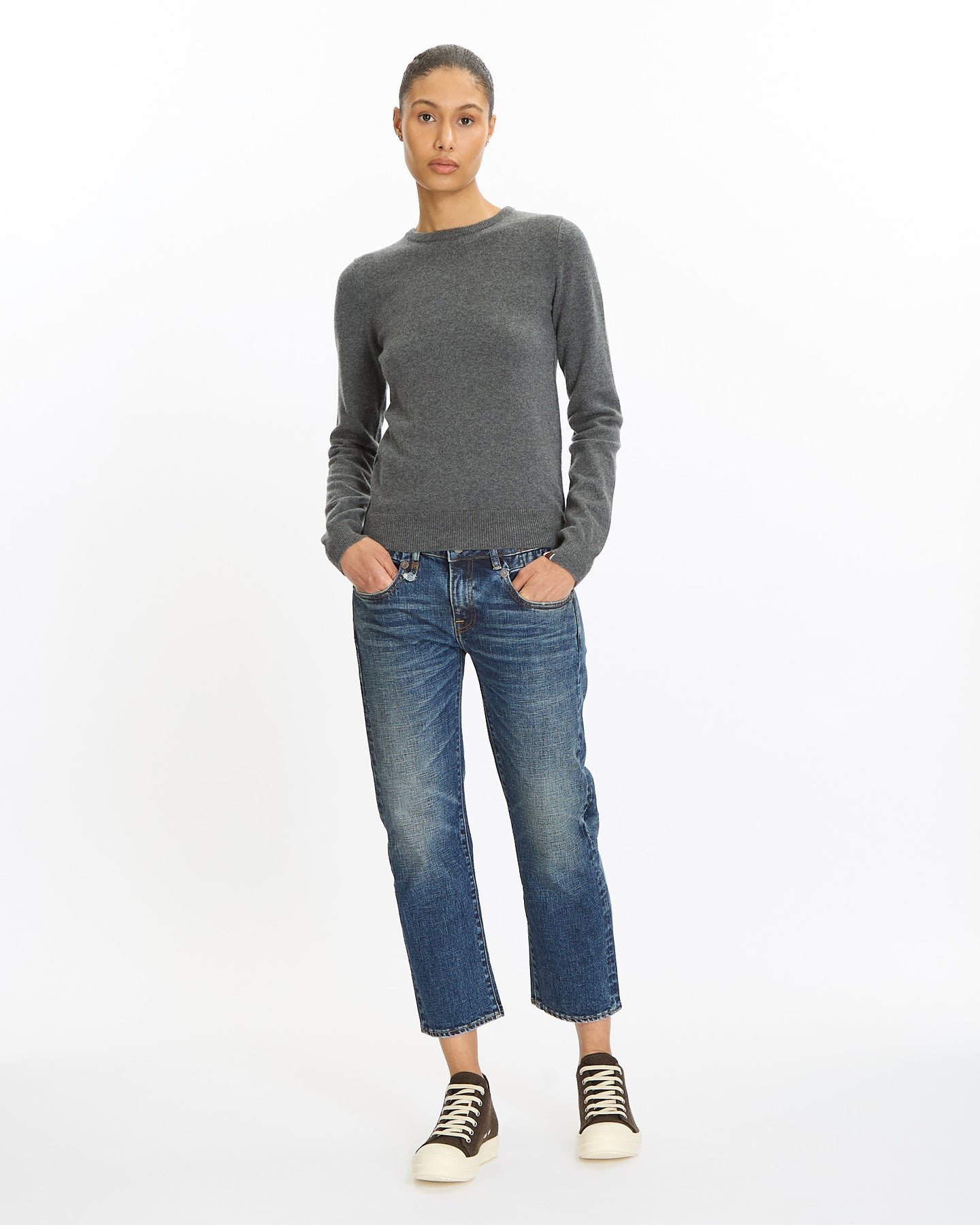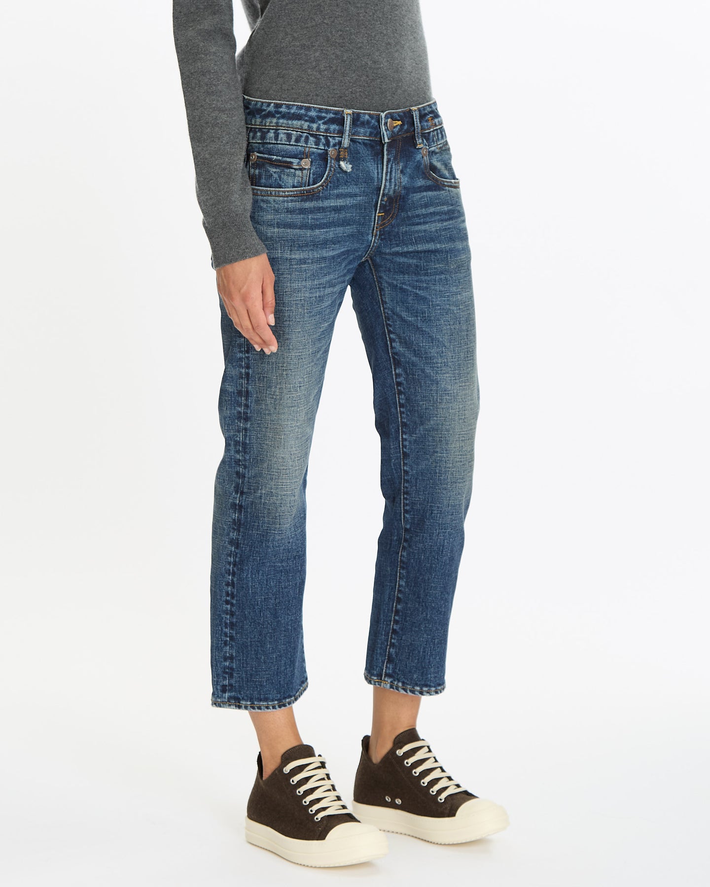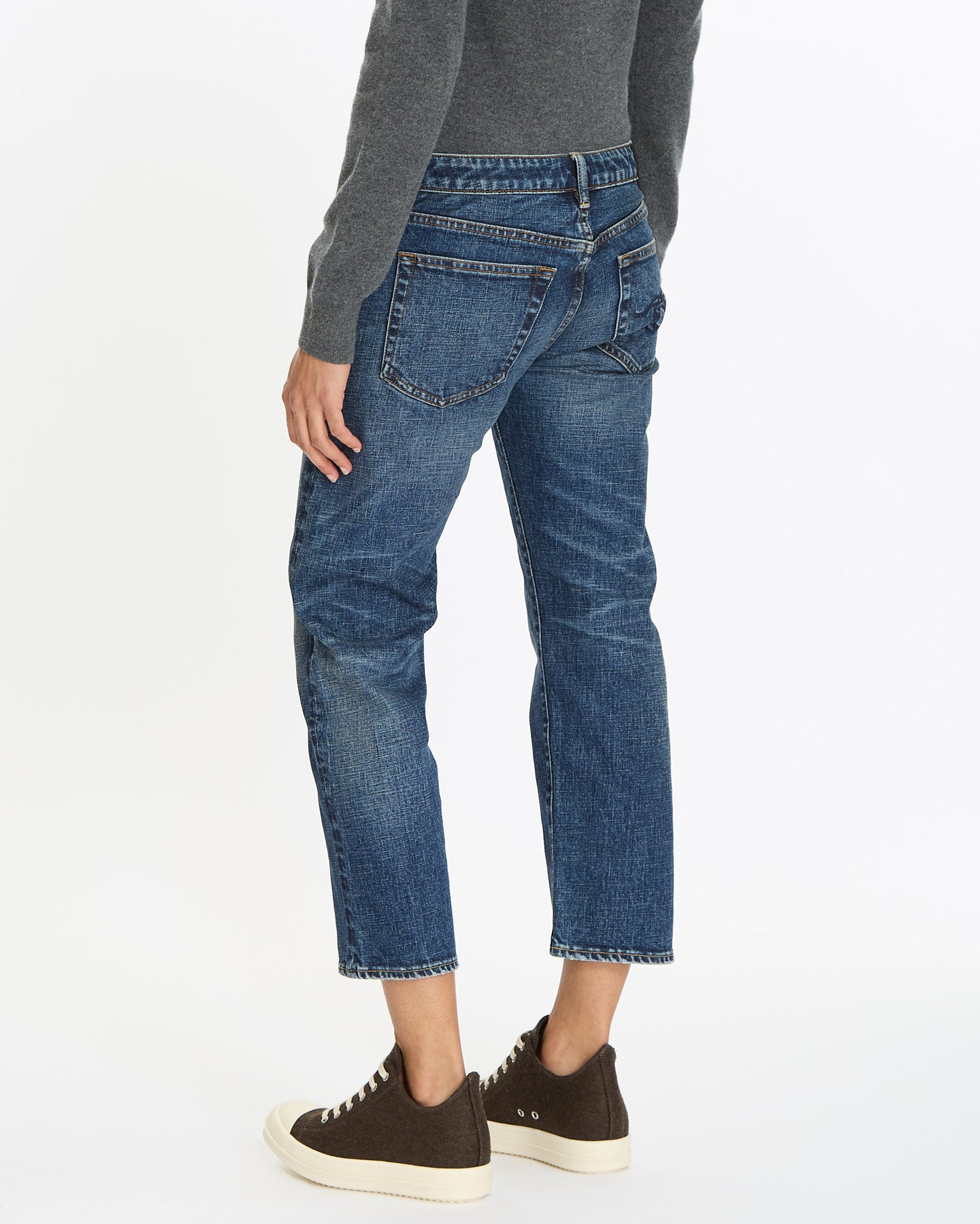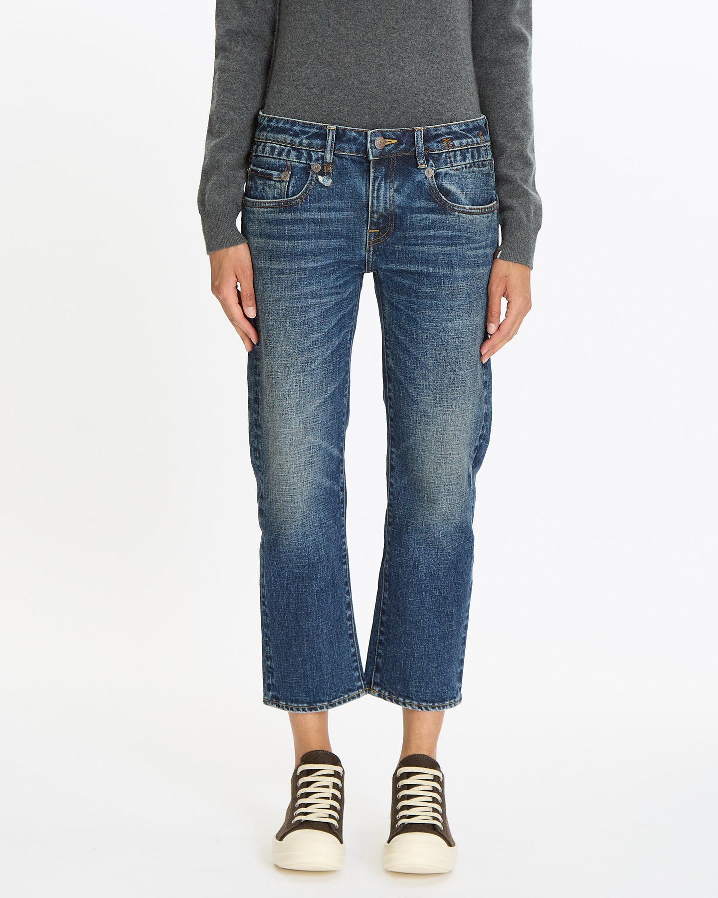 R13 Boy Straight in mire blue stretch features a slim-straight silhouette. Details include low rise, five pocket detailing, medium bleached wash and cropped leg.