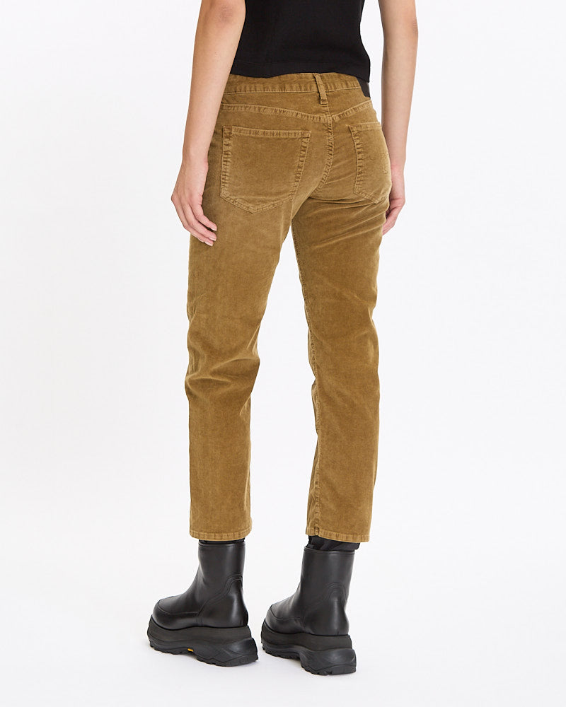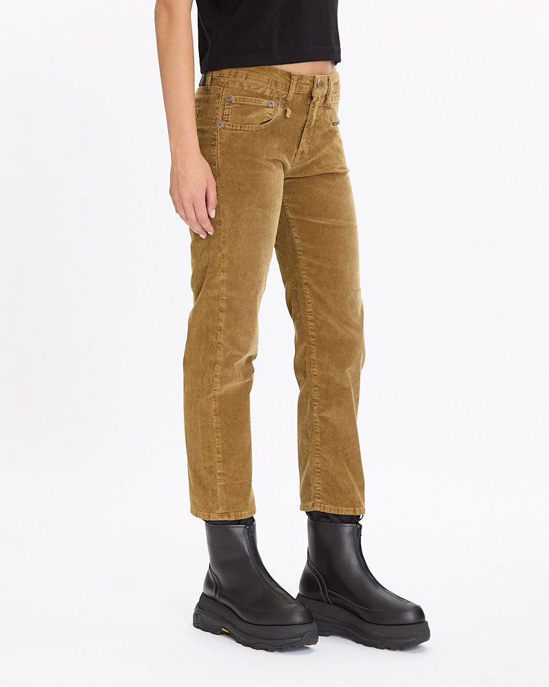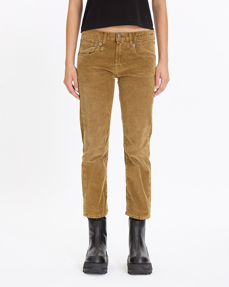 R13 Boy Straight in golden brown features a slim-straight silhouette. Details include low rise, five pocket detailing and cropped leg.