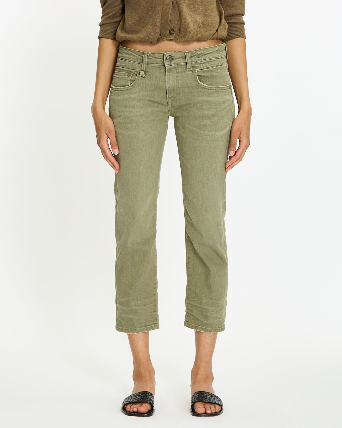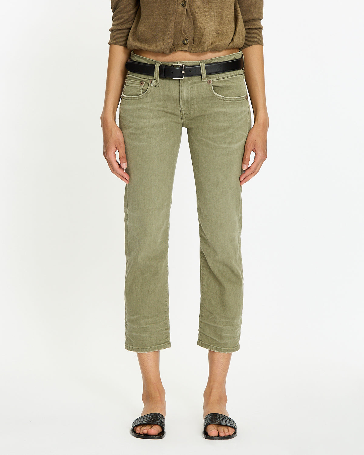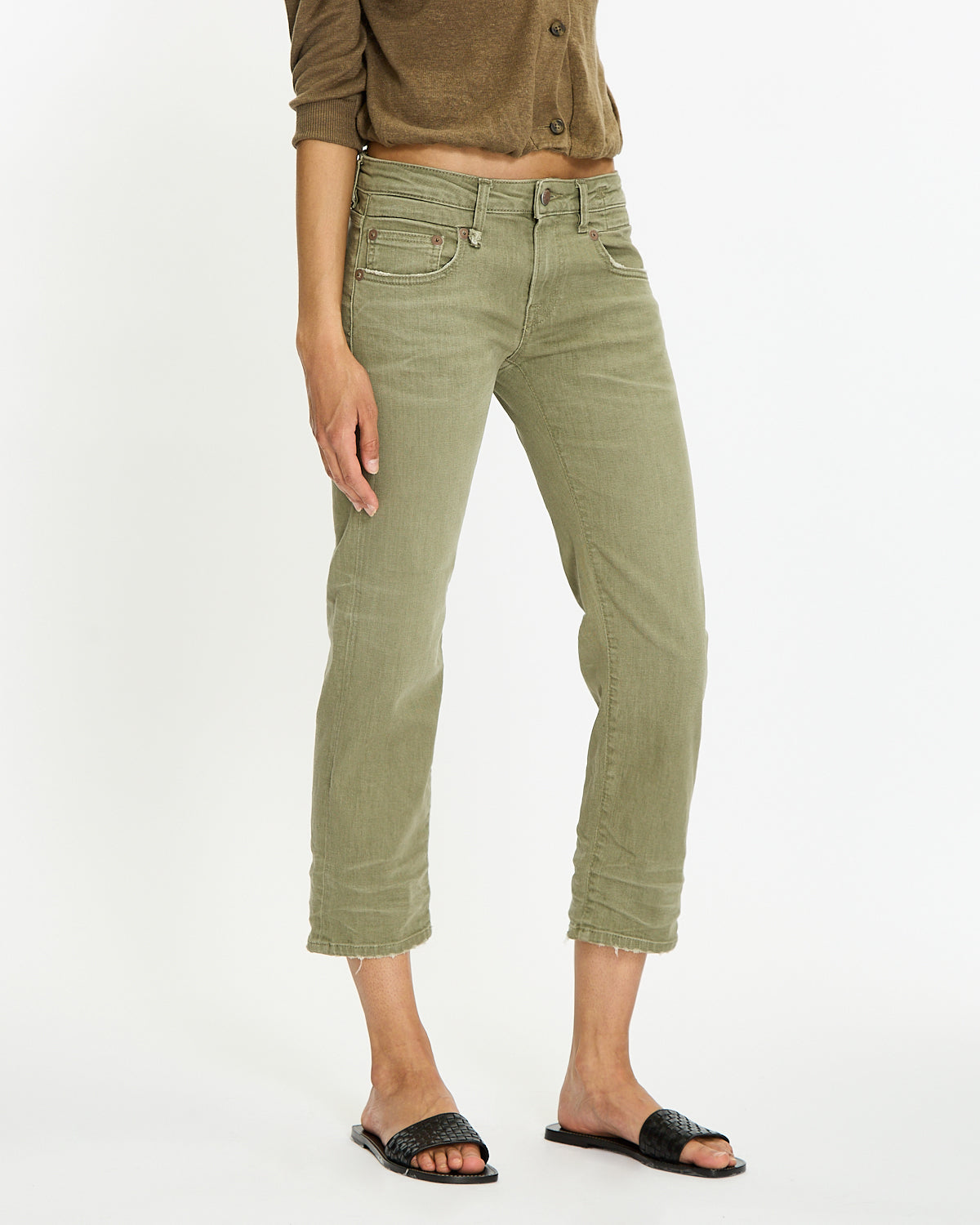 R13 Boy Straight in olive green features a slim straight fit. Details include classic five pocket styling, all over distressing and comfort stretch denim.