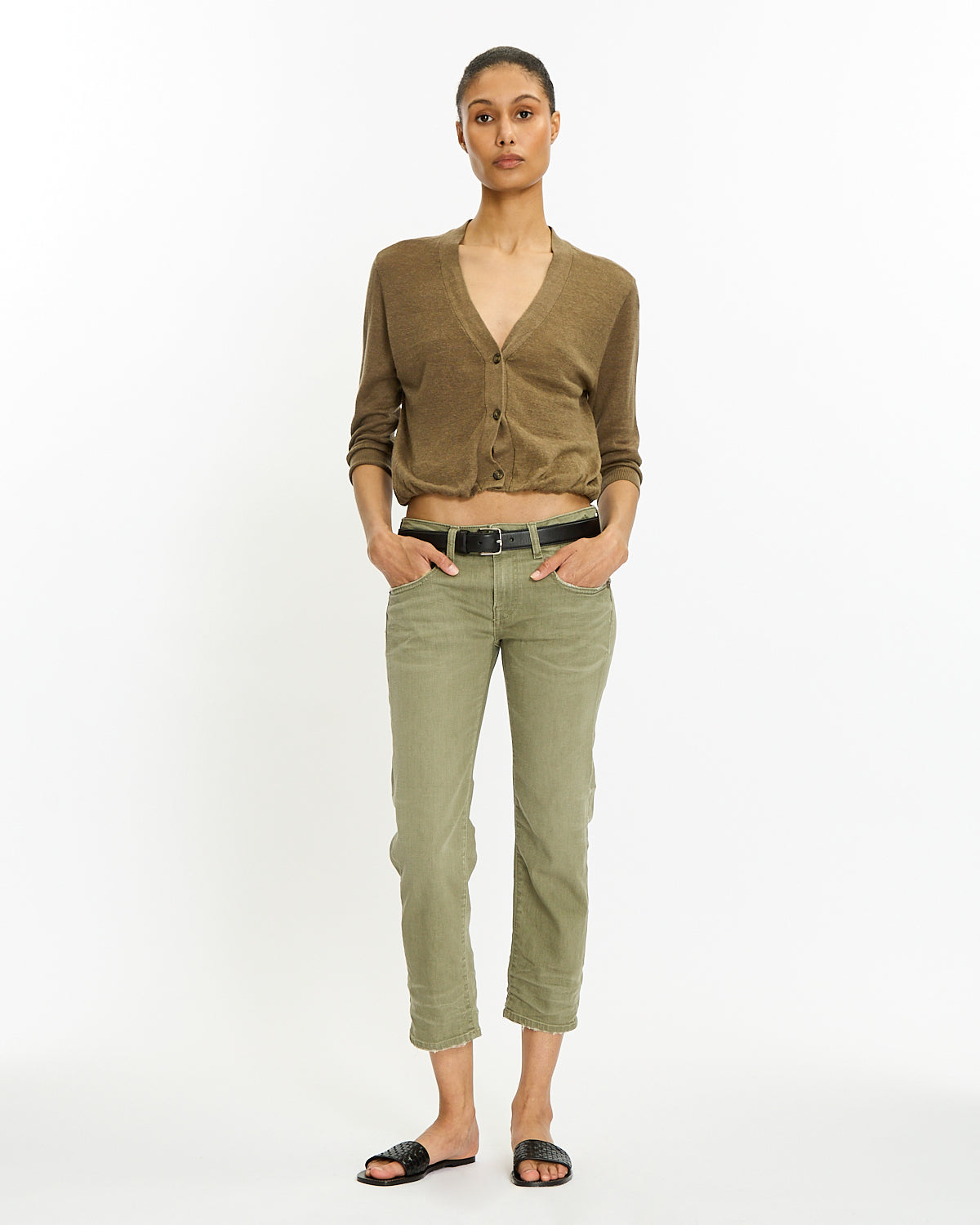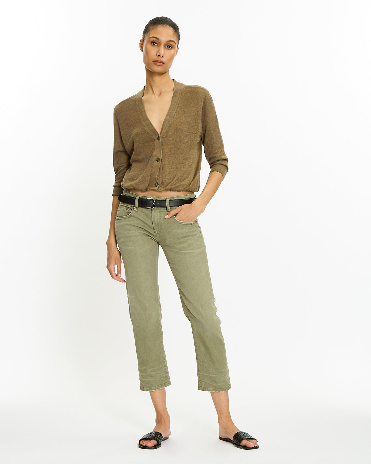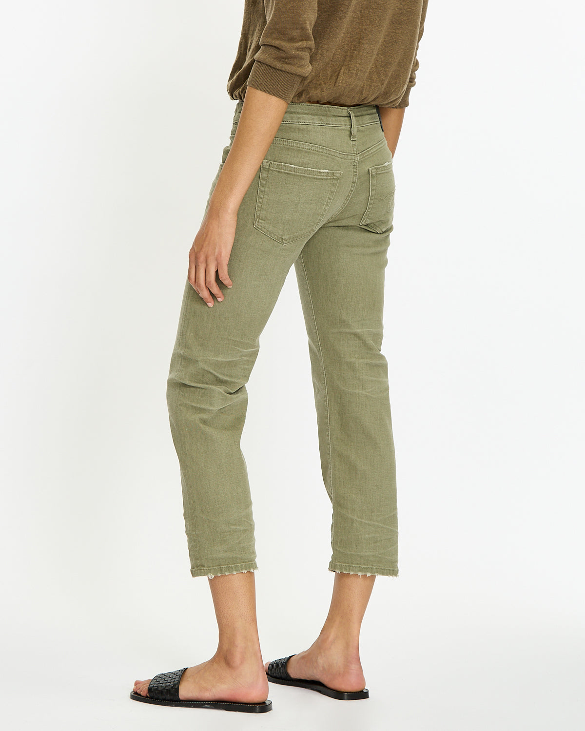 R13 Boy Straight in olive green features a slim straight fit. Details include classic five pocket styling, all over distressing and comfort stretch denim.