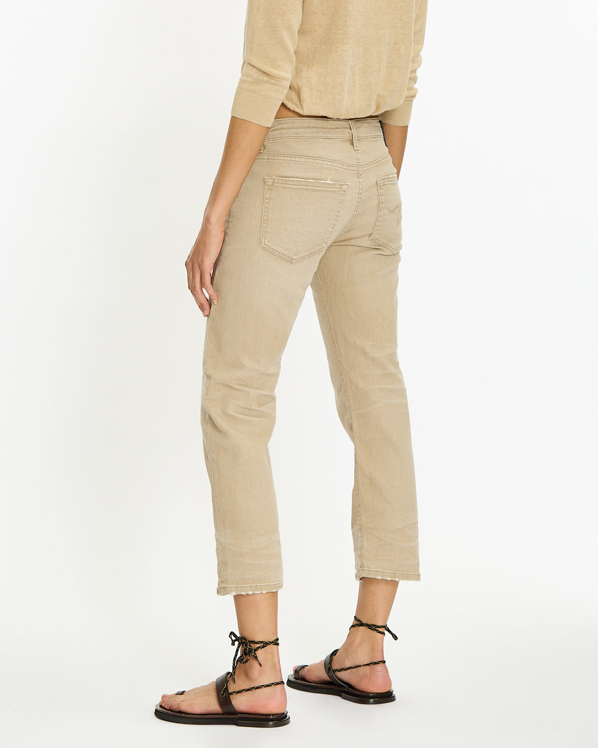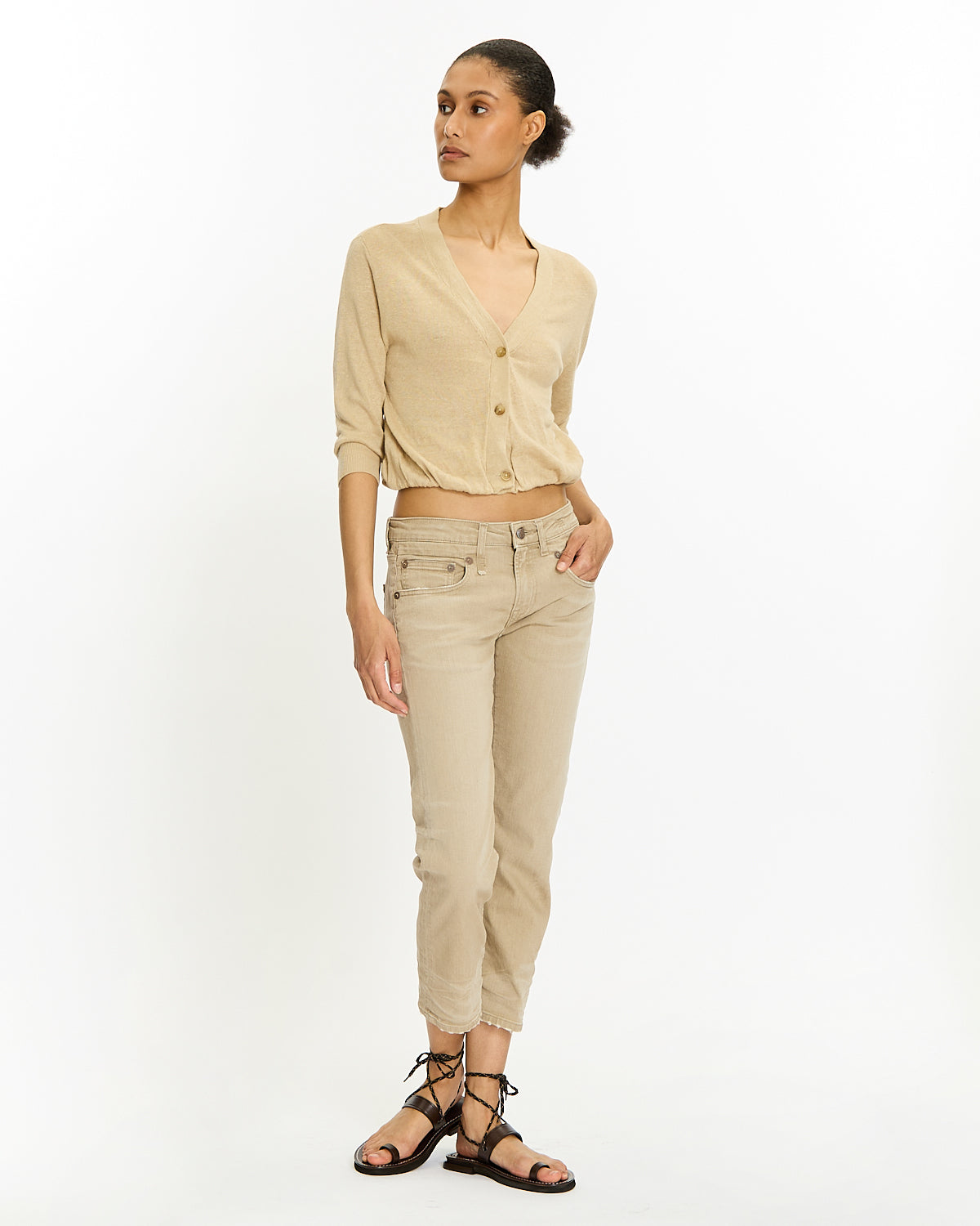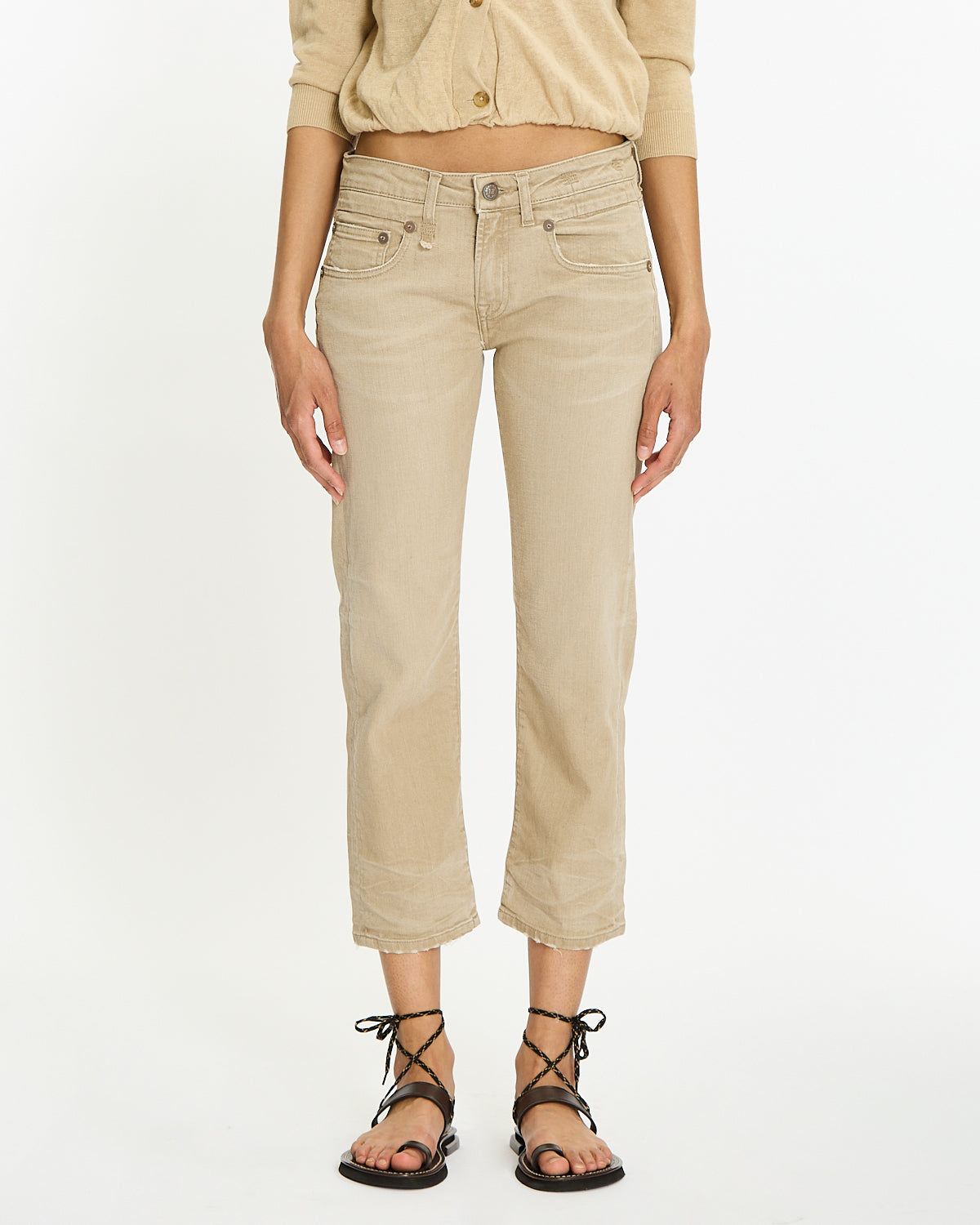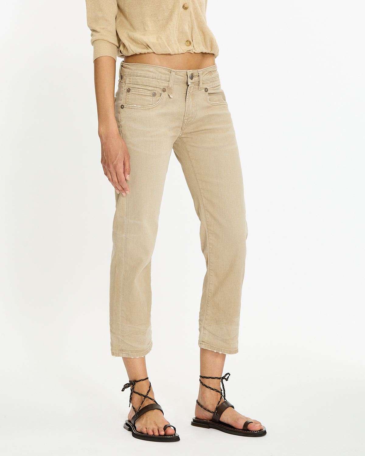 R13 Boy Straight in sand stretch features a slim straight fit. Details include classic five pocket styling, all over distressing and comfort stretch denim.