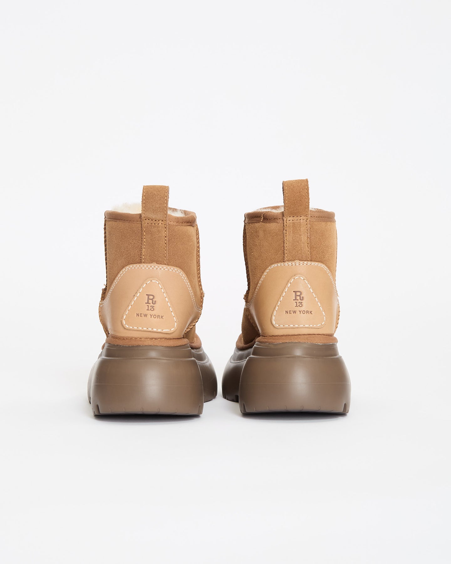 R13 Chunky Shearling Boot in light brown features an ankle length with an R13 pull tab at the back and lined with sheep shearling.
