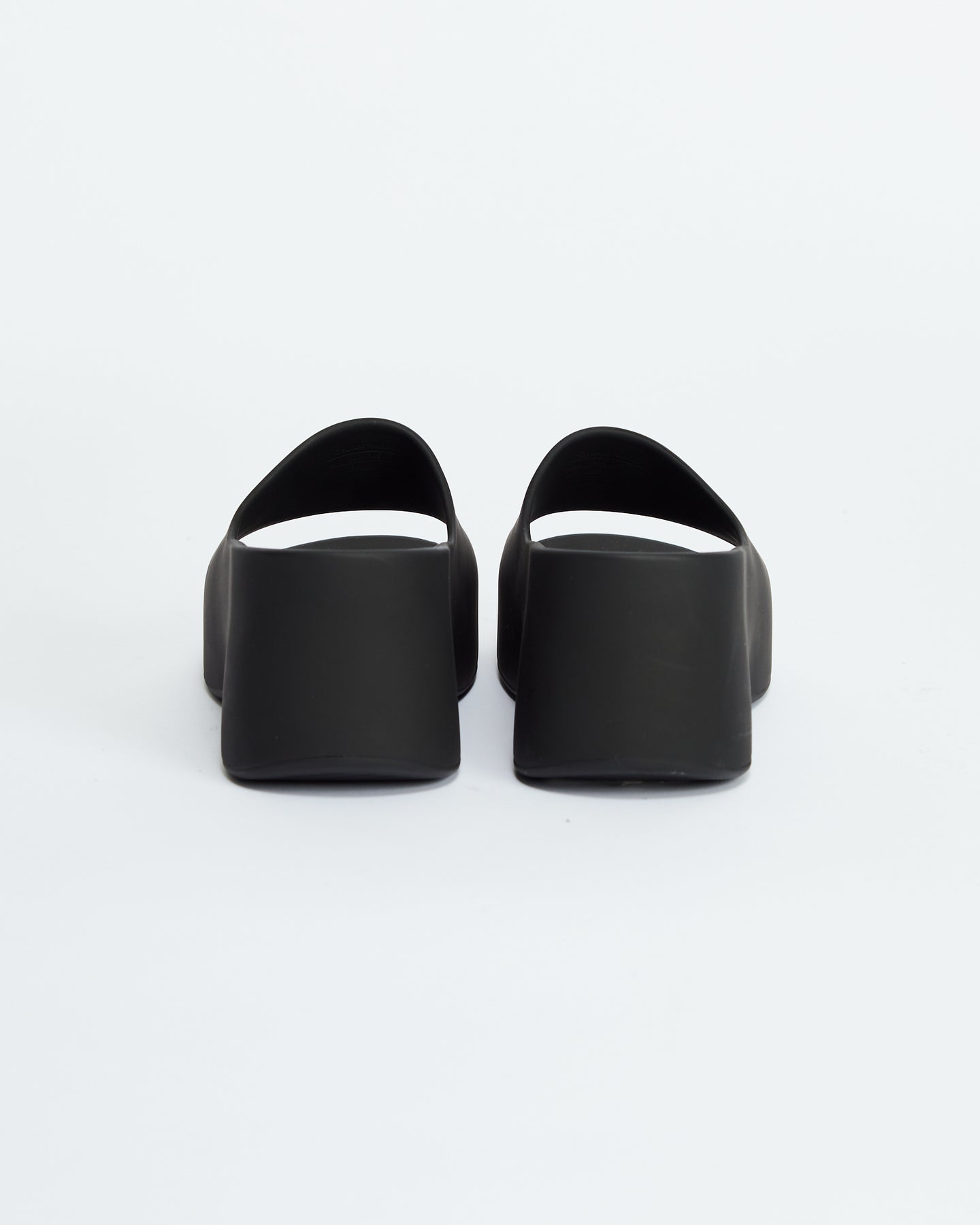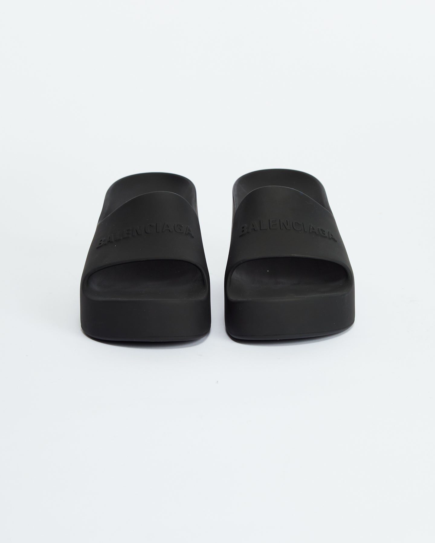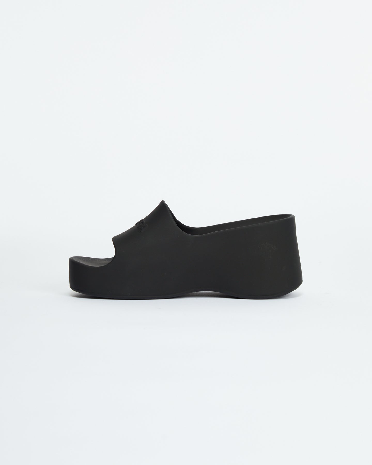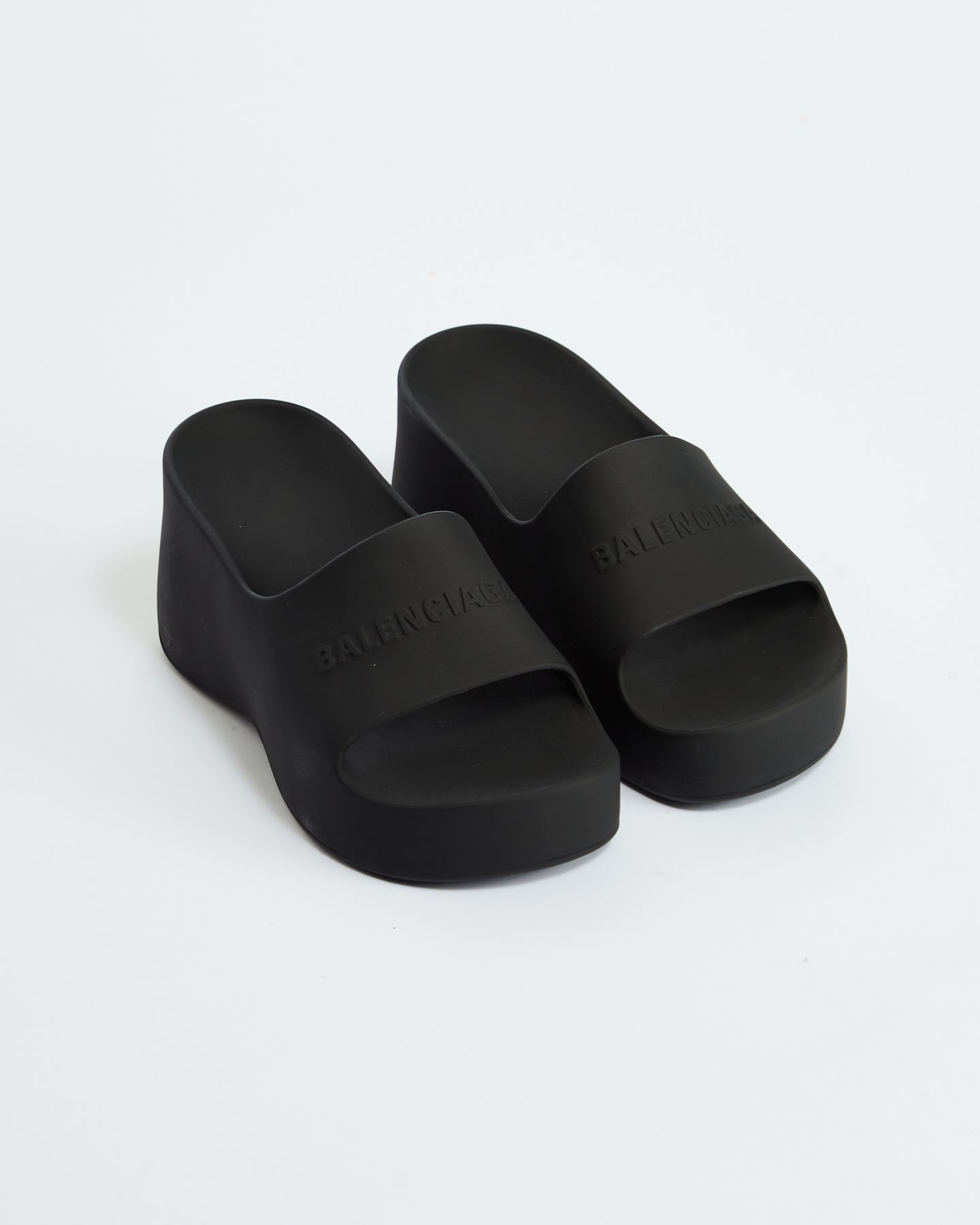 Balenciaga Chunky Wedge in black features molded rubber footbeds, 3D Balenciaga logo on the strap and embossed Balenciaga logo at back.