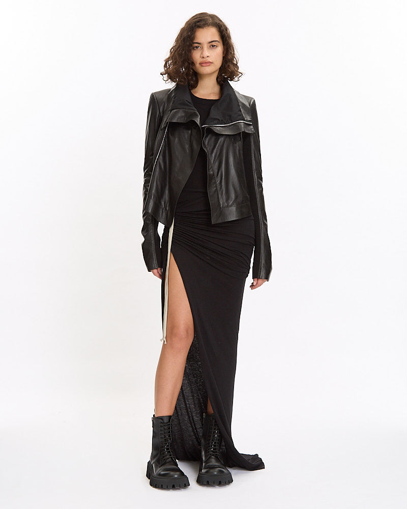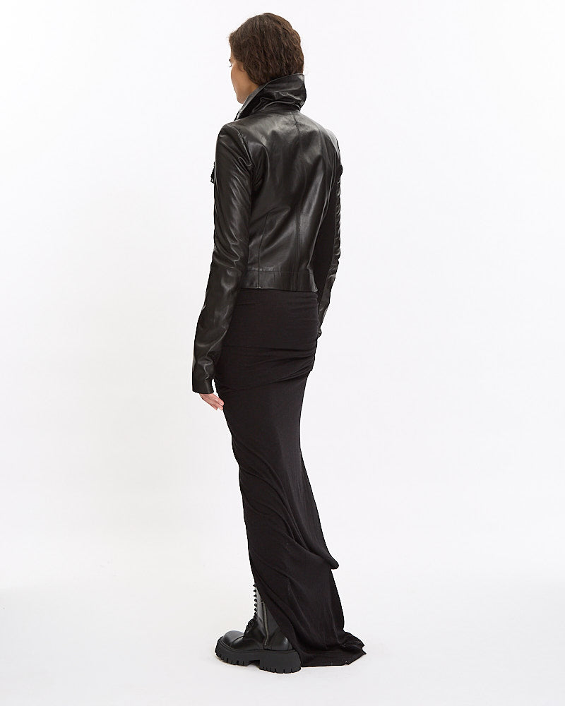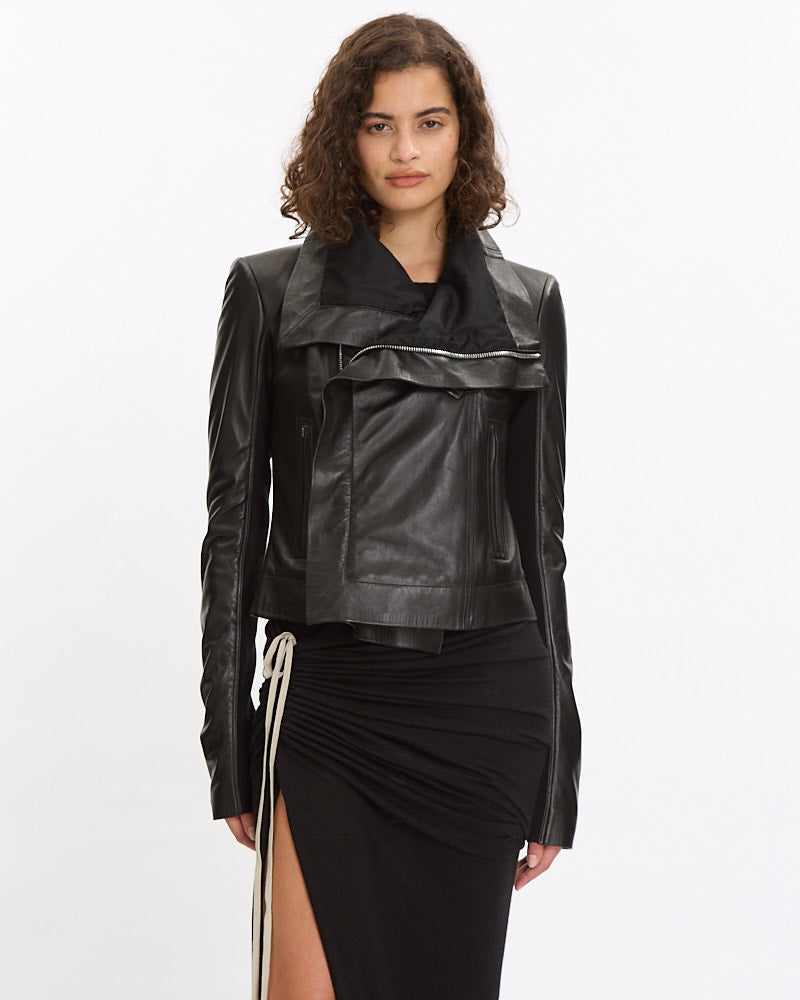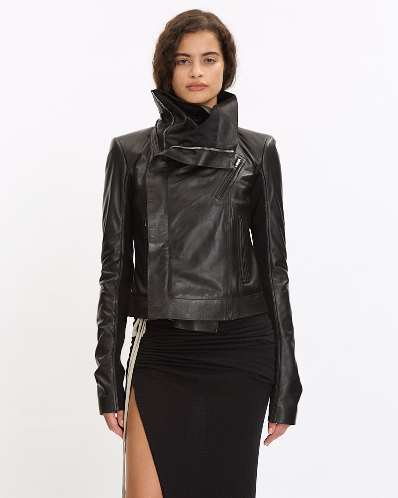Rick Owens Classic Biker Jacket in black features a slim lightweight jacket in a lambskin leather fabrication. Details include funnel collar neckline, offset zip closure, shoulder pads, rib knit paneling and front welt pockets.
