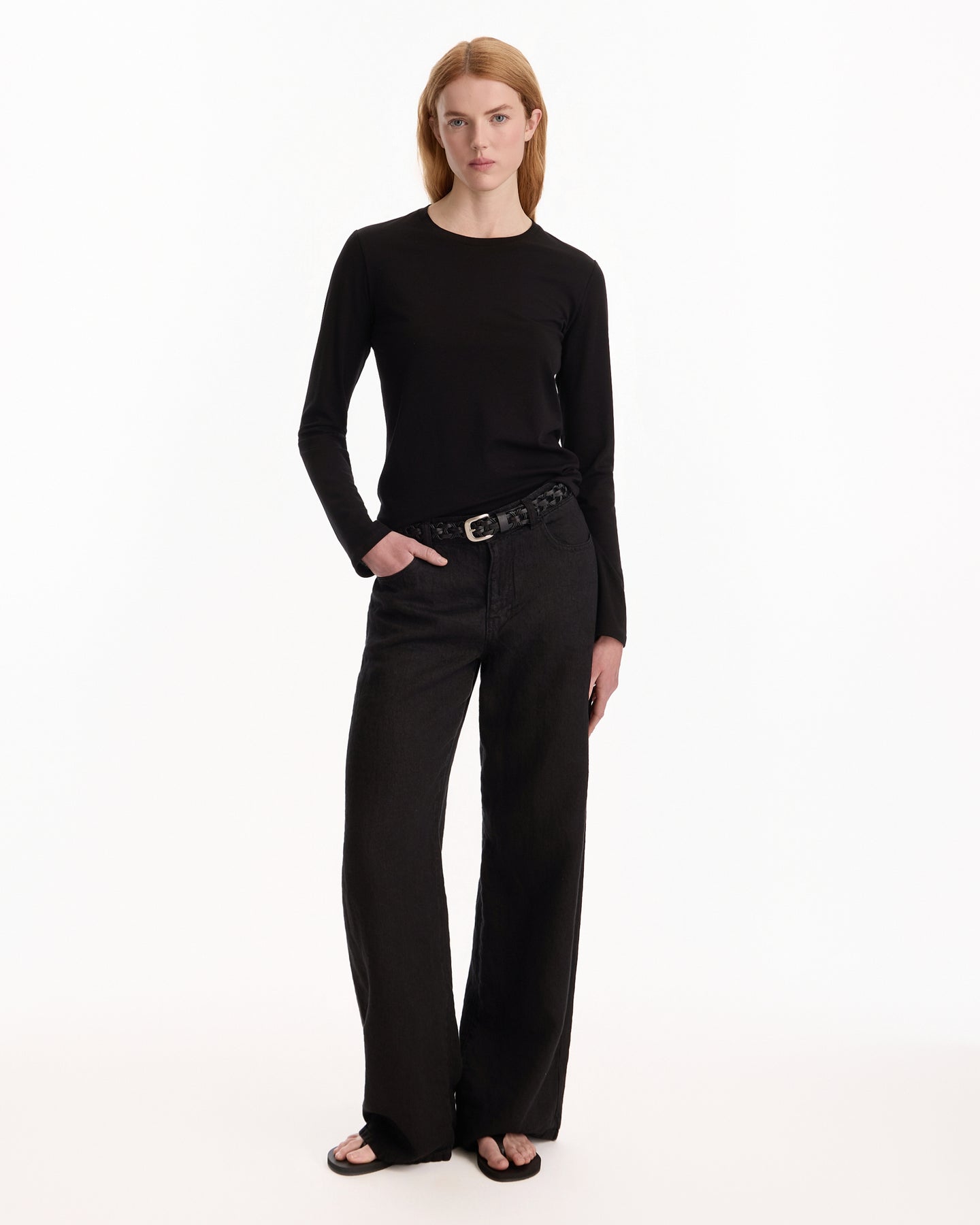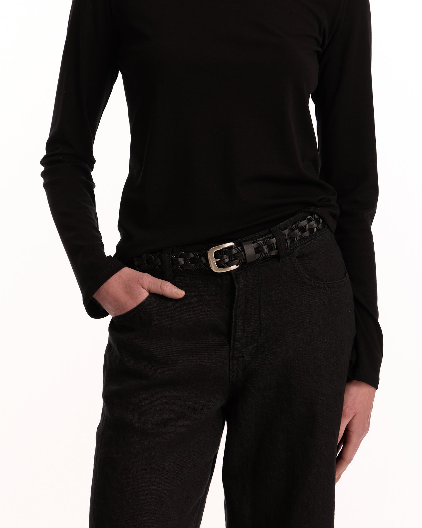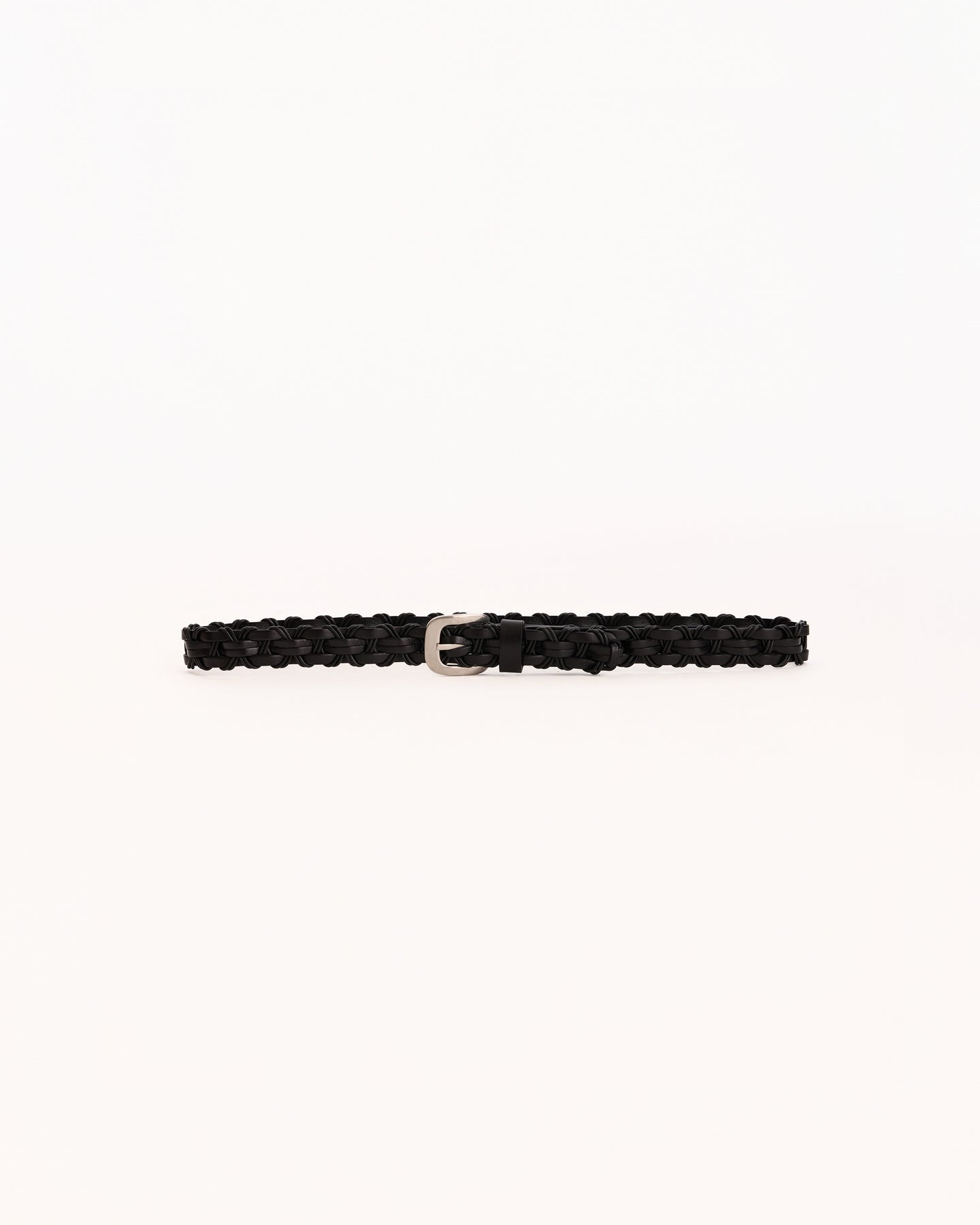 The Row Cord Belt in black features a braided belt in a vegetable tanned calfskin leather fabrication. Details include metal buckle and leather strap loop.