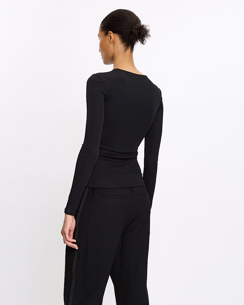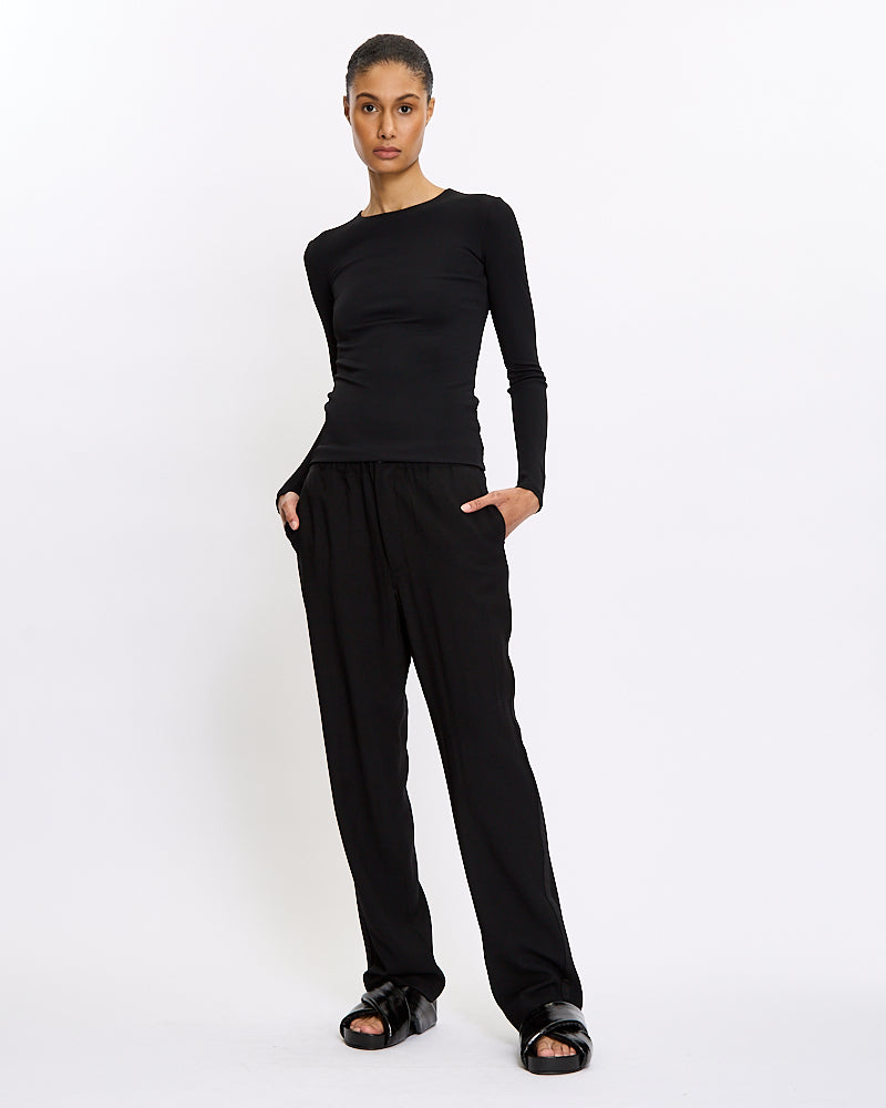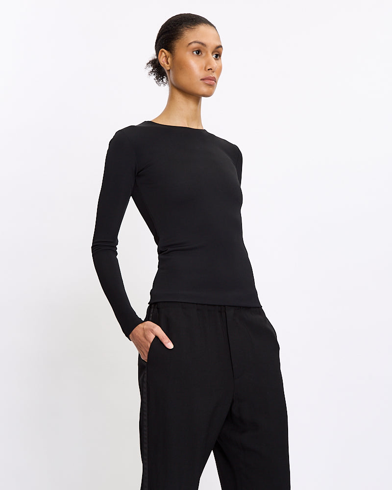 Jil Sander Crepe Fluid Shirt in black features a fitted design. Details include clean finished crew neckline, fluid crepe fabrication with slight stretch, and long fitted sleeves.