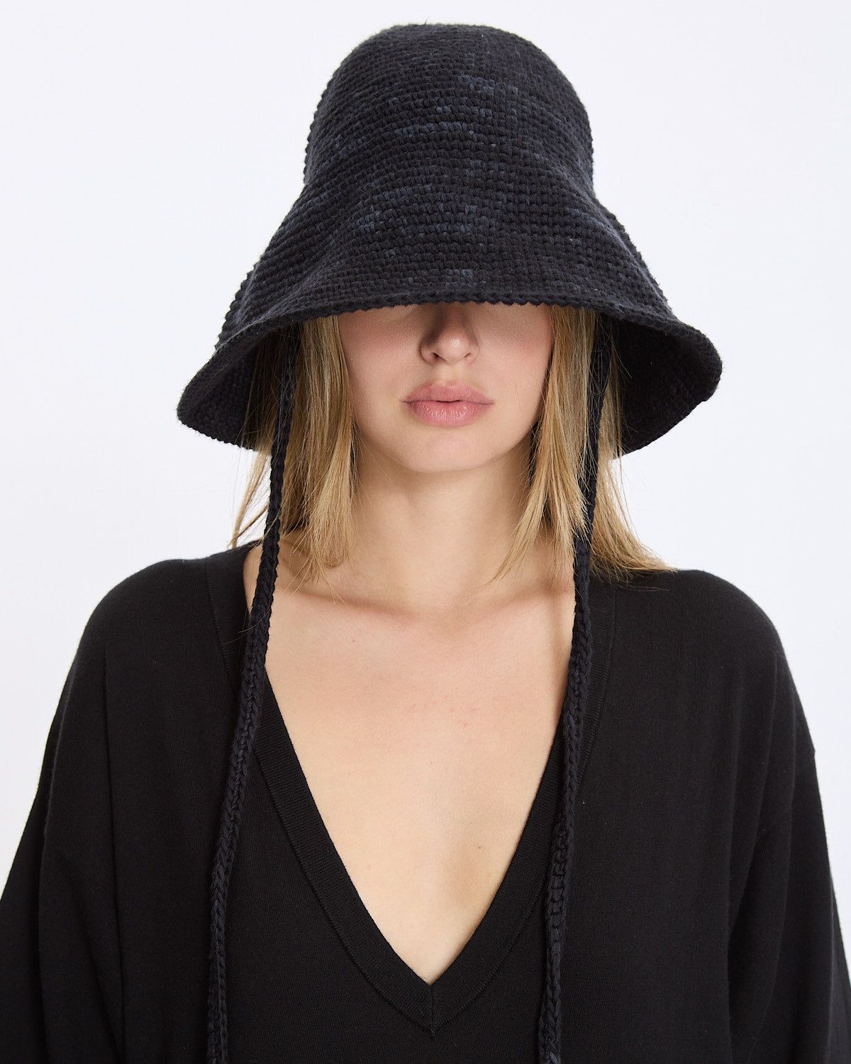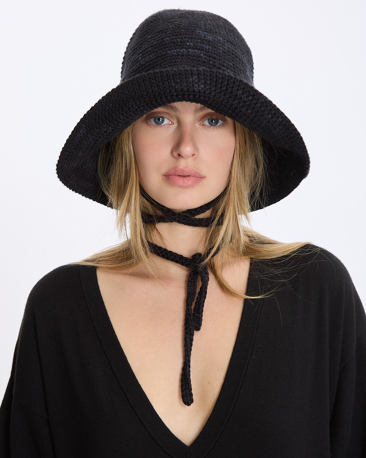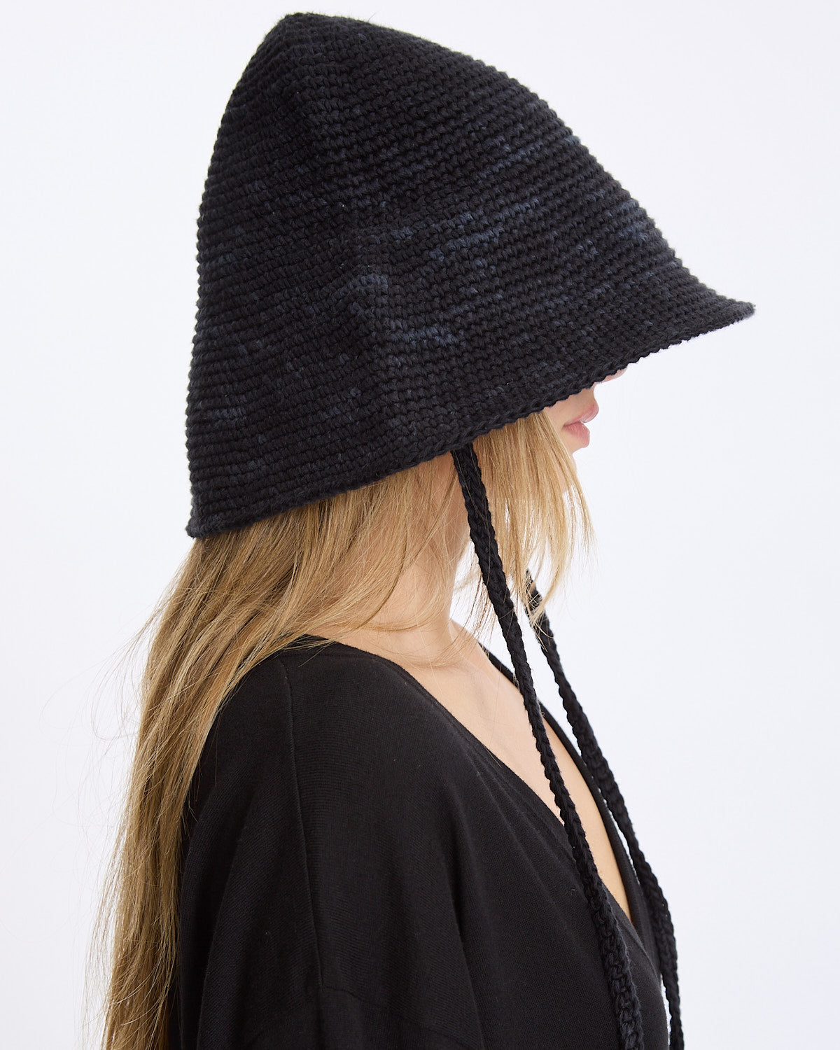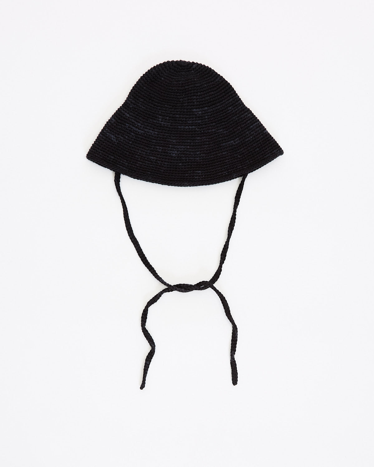 Lauren Manoogian Crochet Sun Hat in black features a classic sun hat silhouette in a circular construction. Details include chin ties in a breathable, lightweight fabrication.