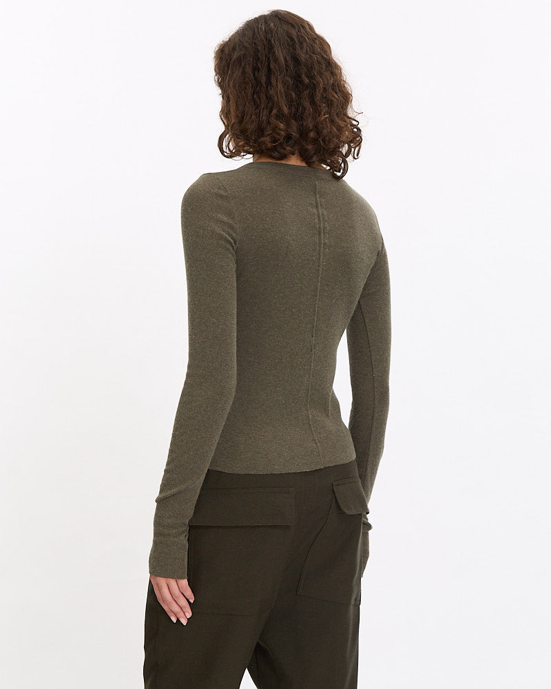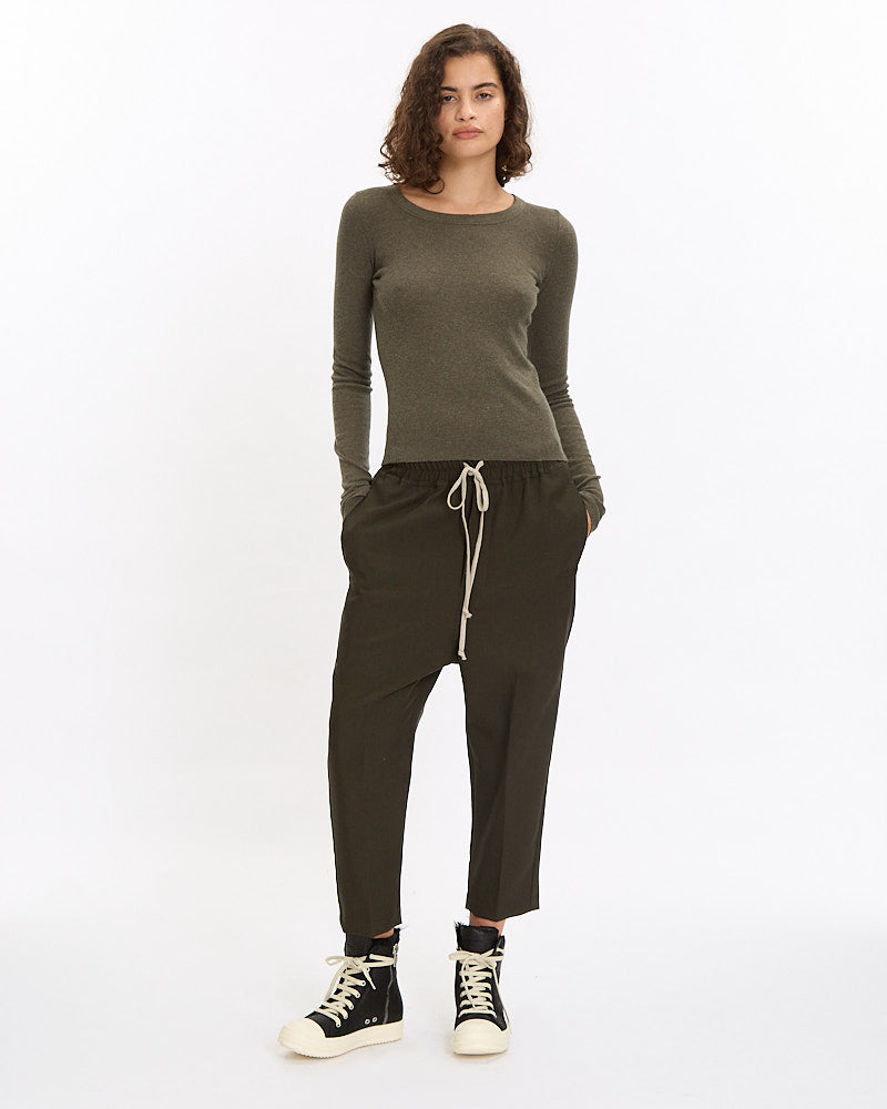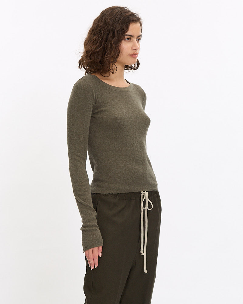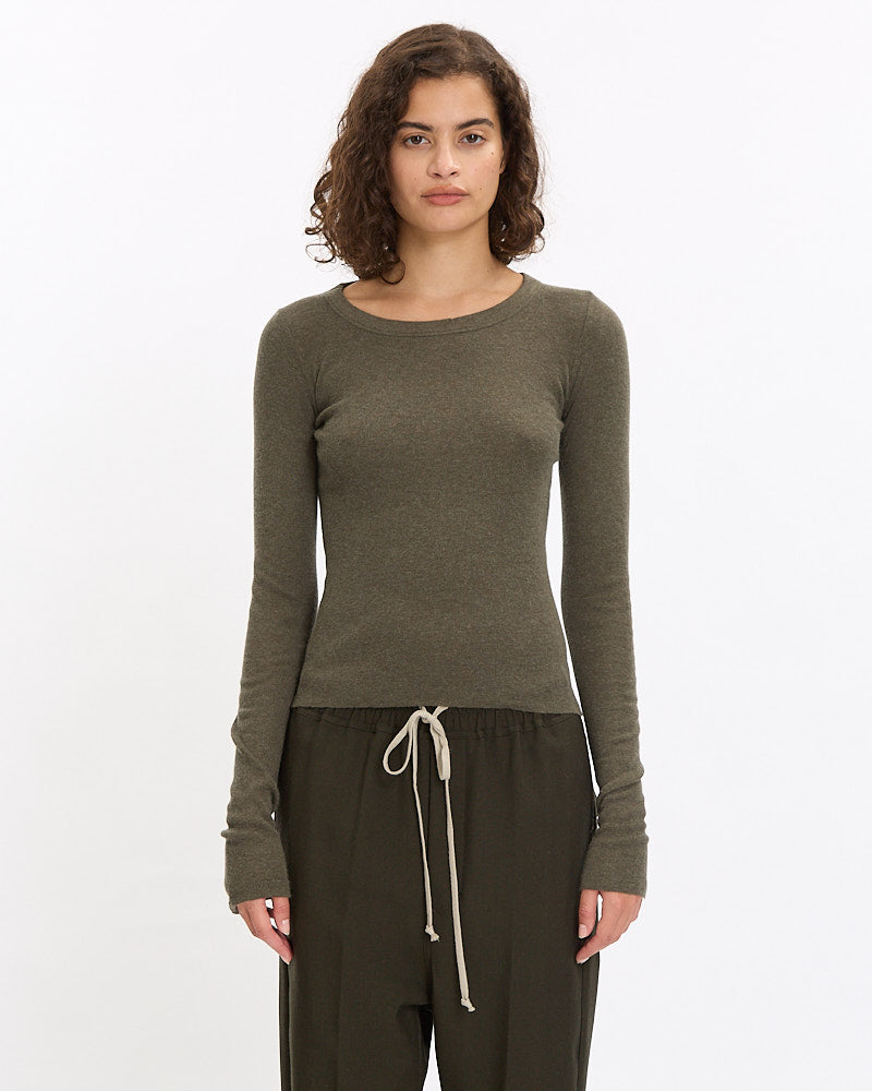 Rick Owens Crop Rib LS T-Shirt in bosco features a slim fit in a ribbed jersey fabrication. Details include crew neckline, raw hem edges, cropped hem and central back seam.