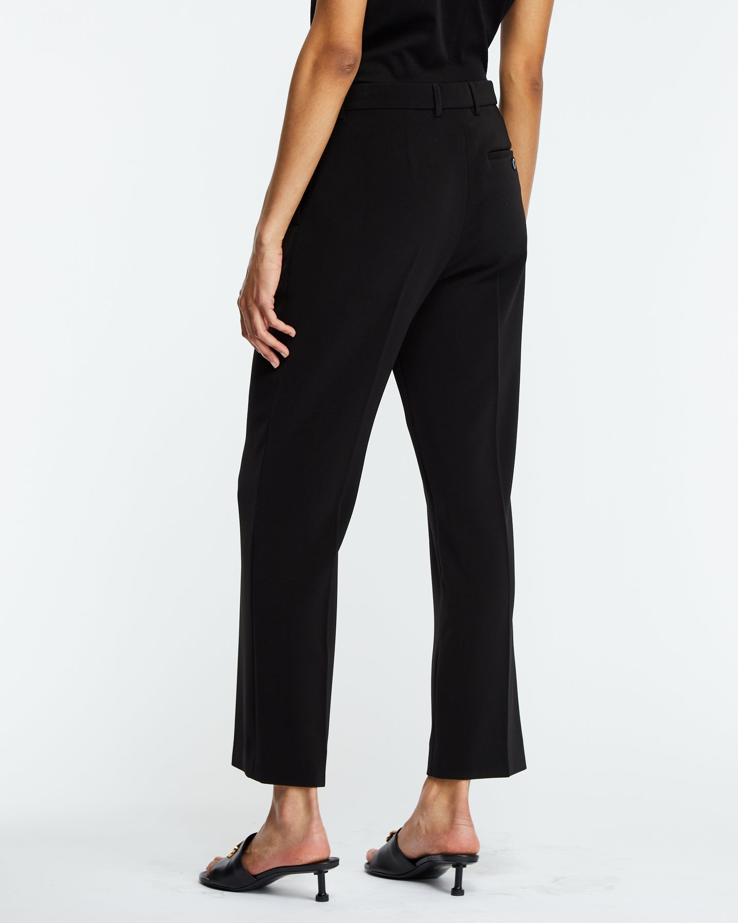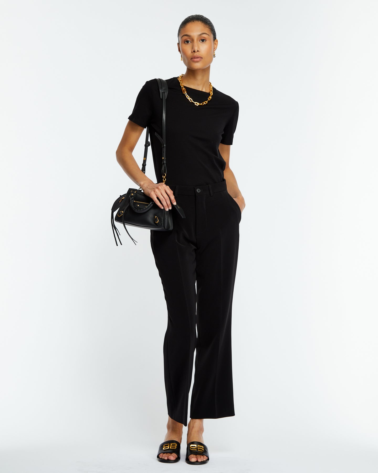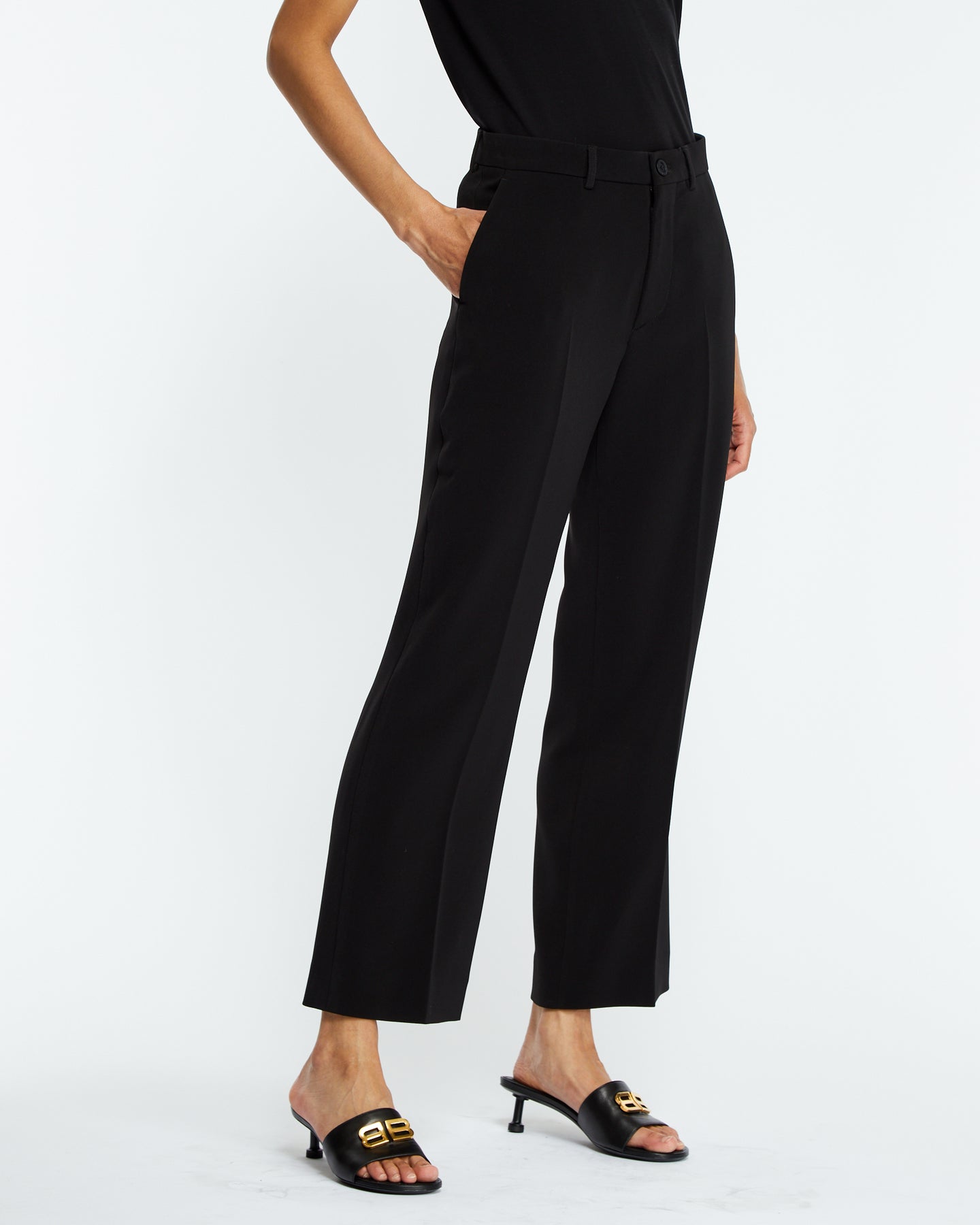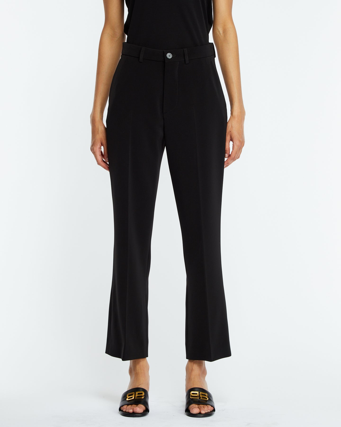 Balenciaga Cropped Pant in black features a flared fit silhouette. Details include front button closure with zip fly, relaxed fit through hip and slight flare at ankle.