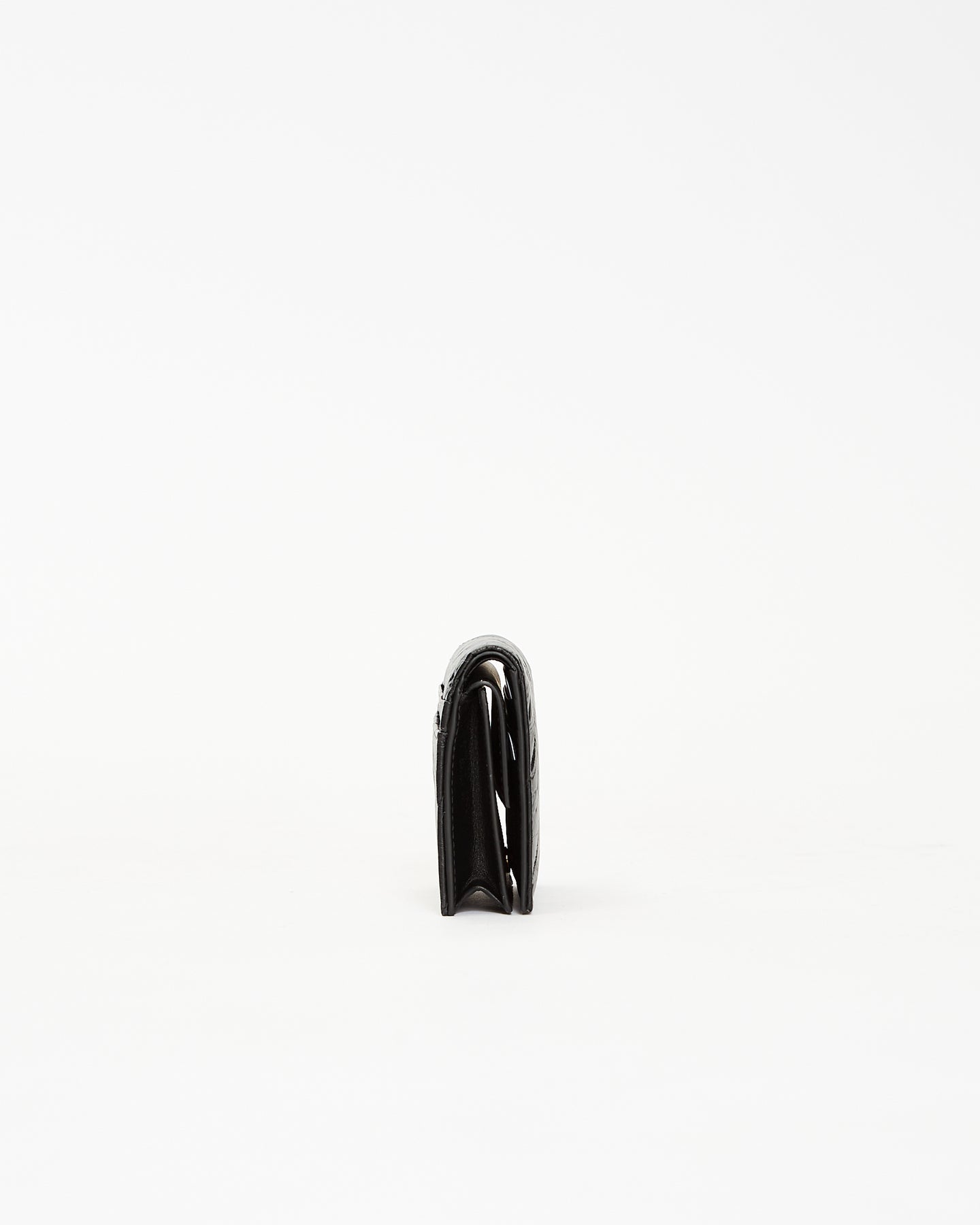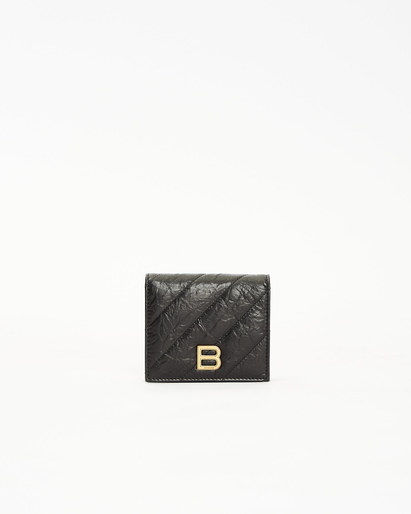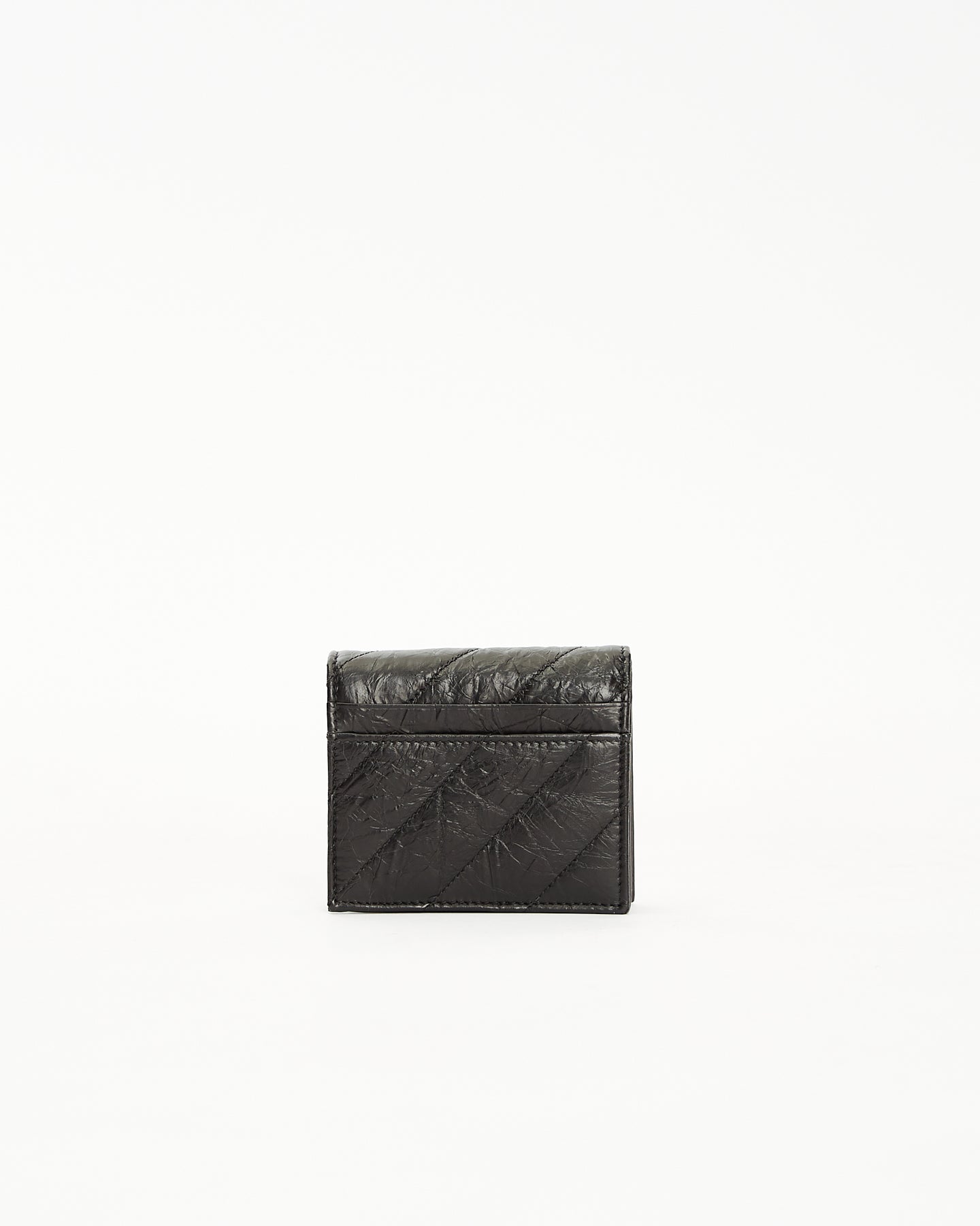Balenciaga Crush Card Holder in black features flap coin pocket, aged-gold B logo hardware, snapped closure, 1 bill pocket, 4 card slots and 2 card slots at back.