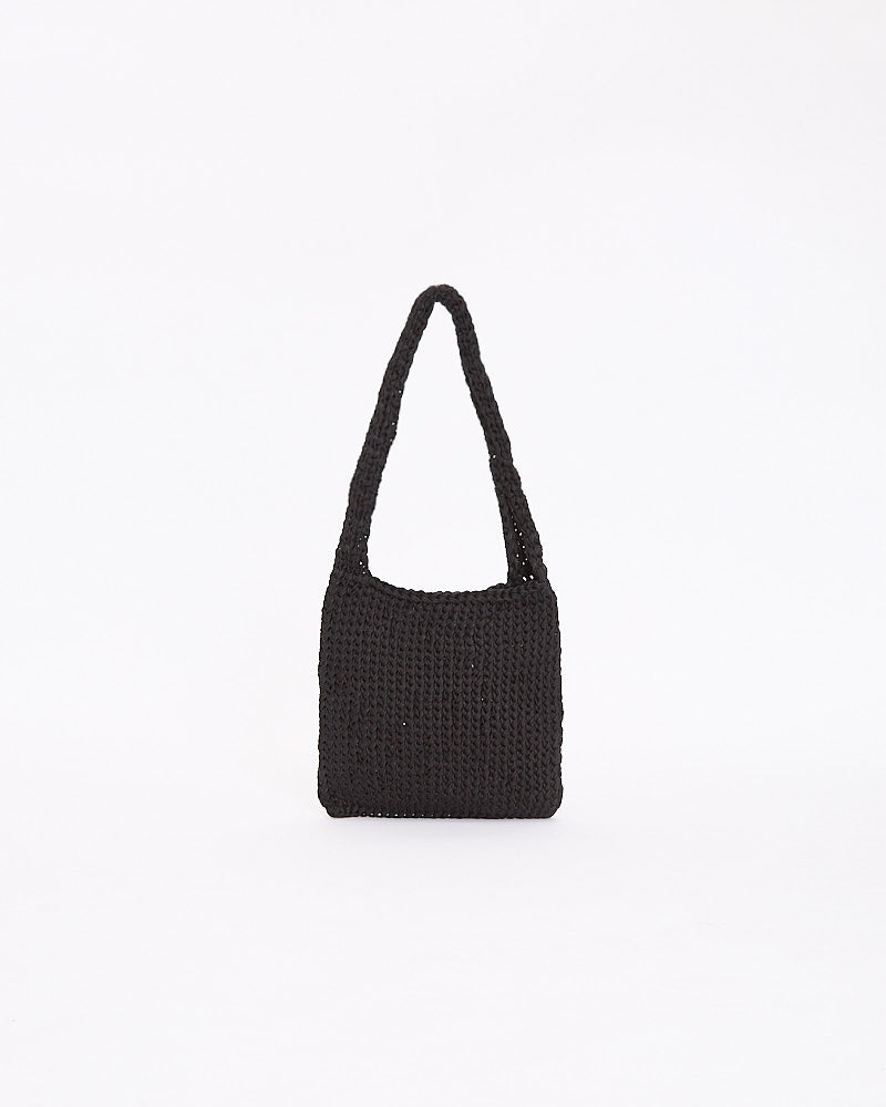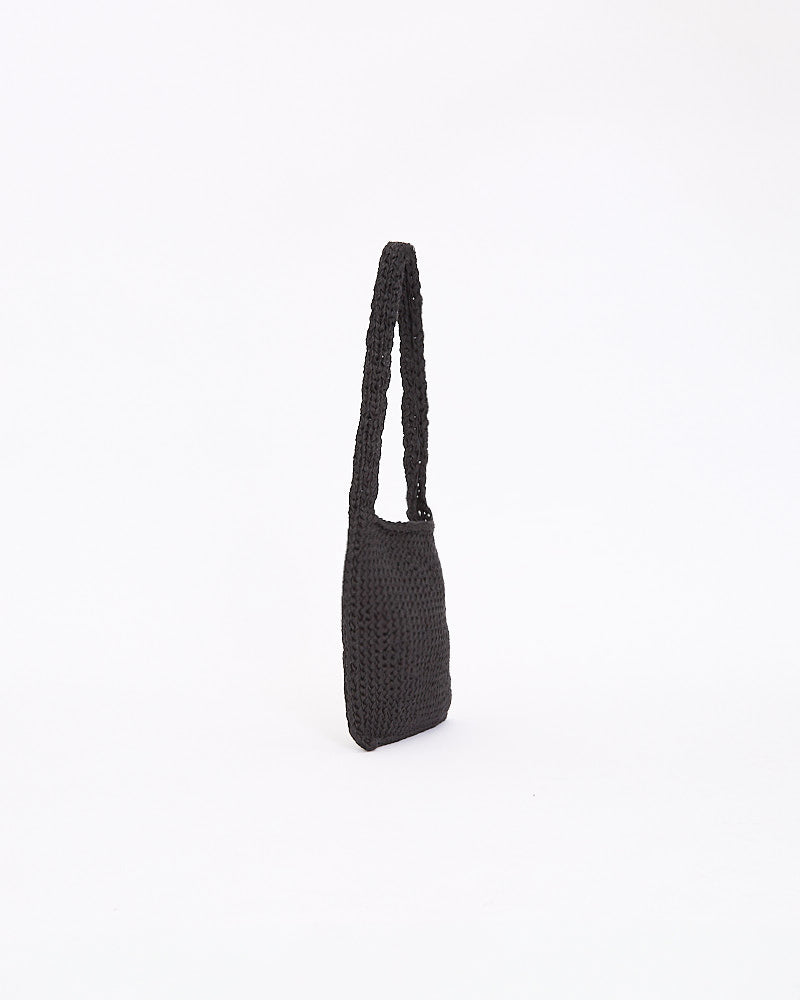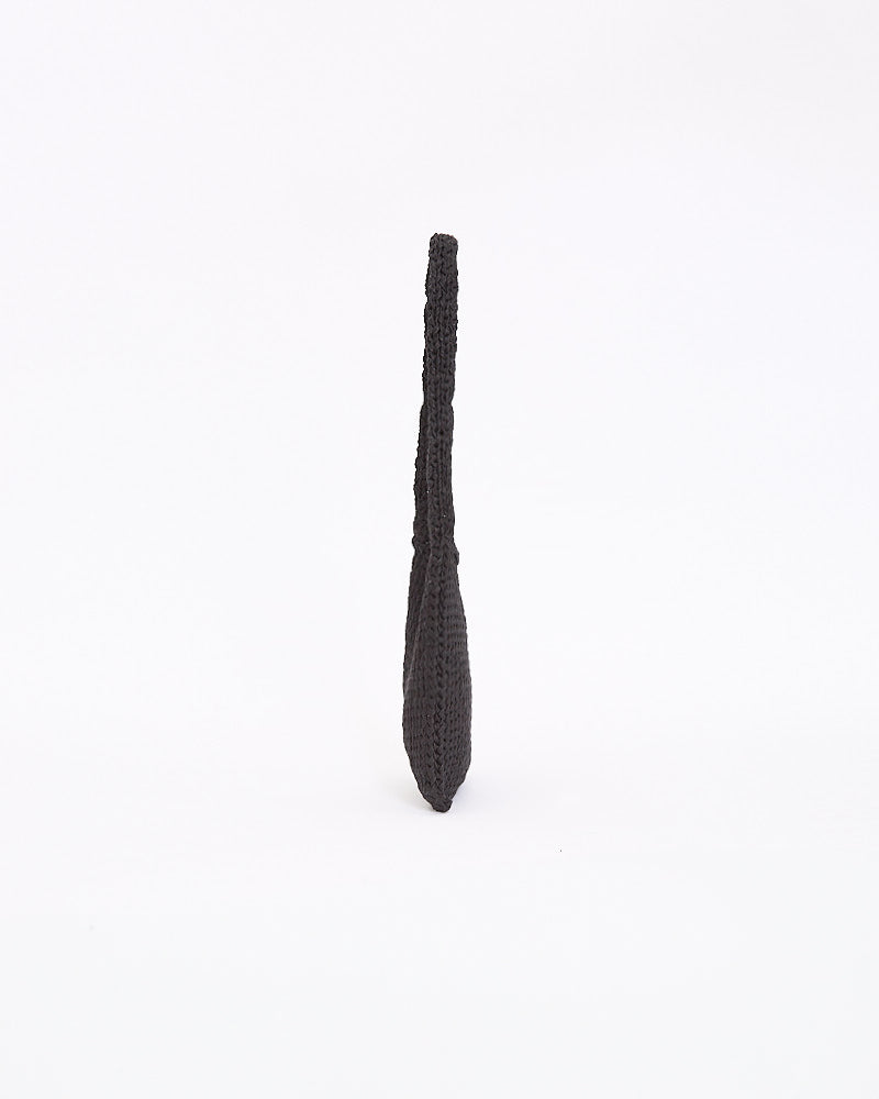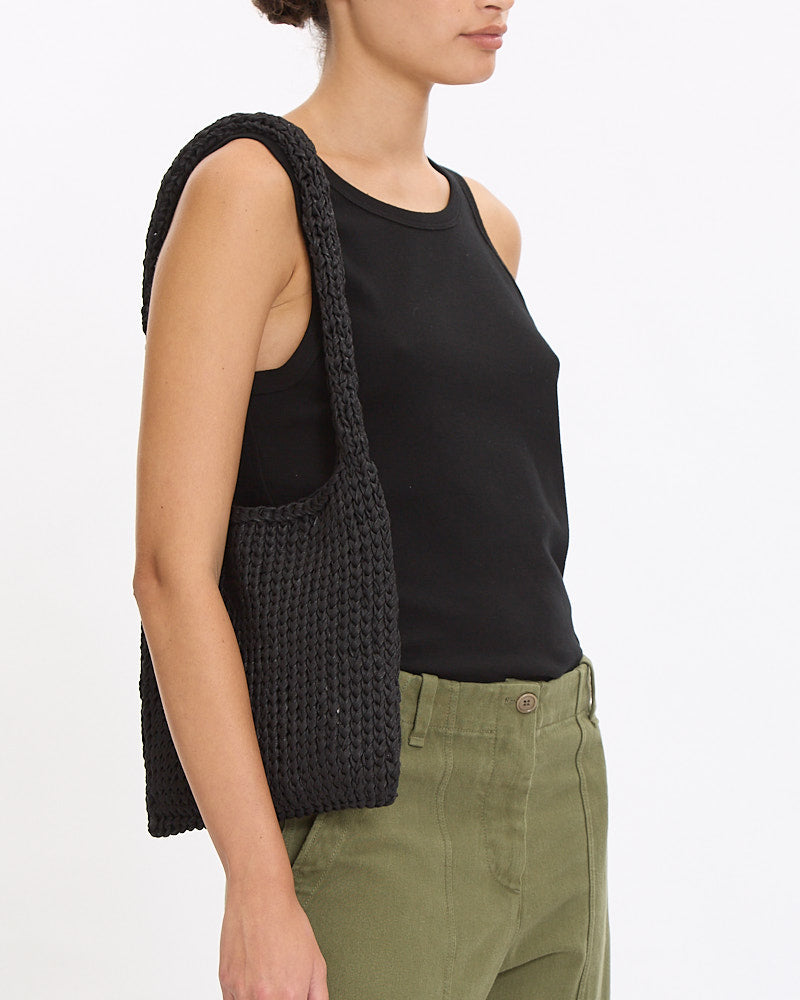 The Row Didon Shoulder Bag in black features a relaxed silhouette in a hand woven waxed cord fabrication. Details include rolled top opening and single interior pocket.