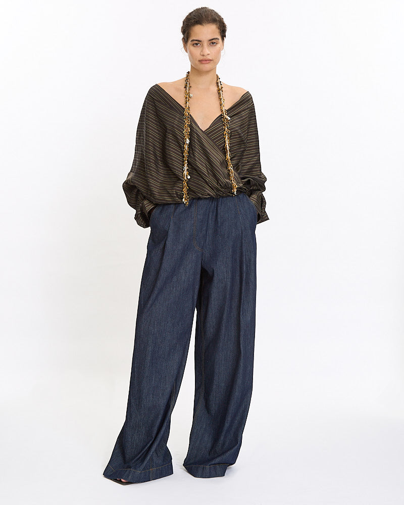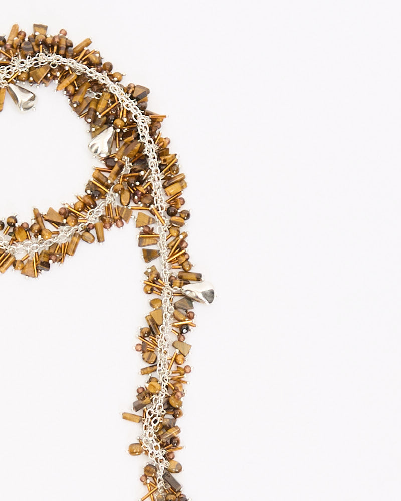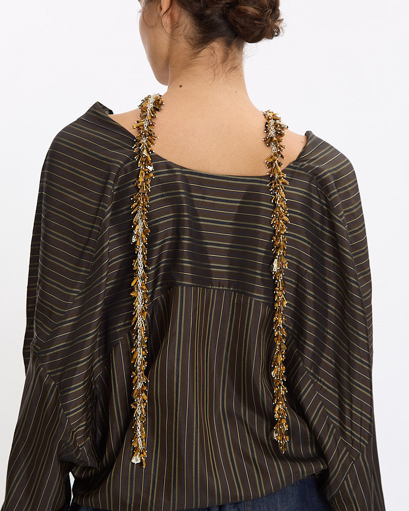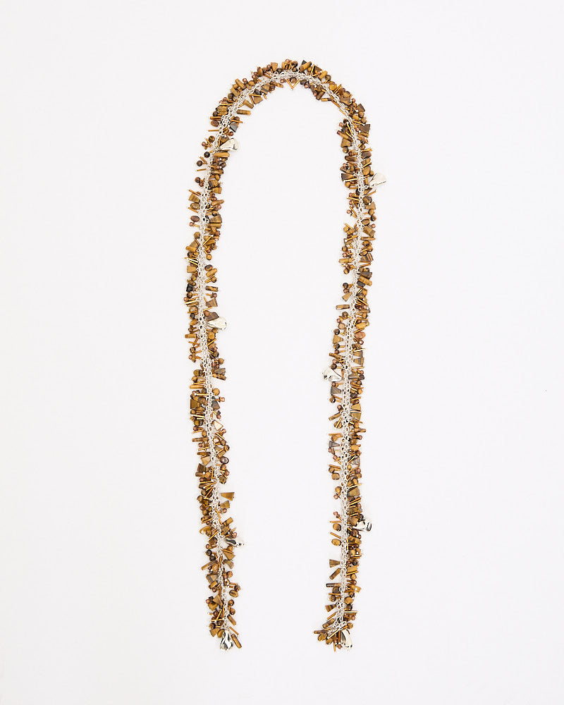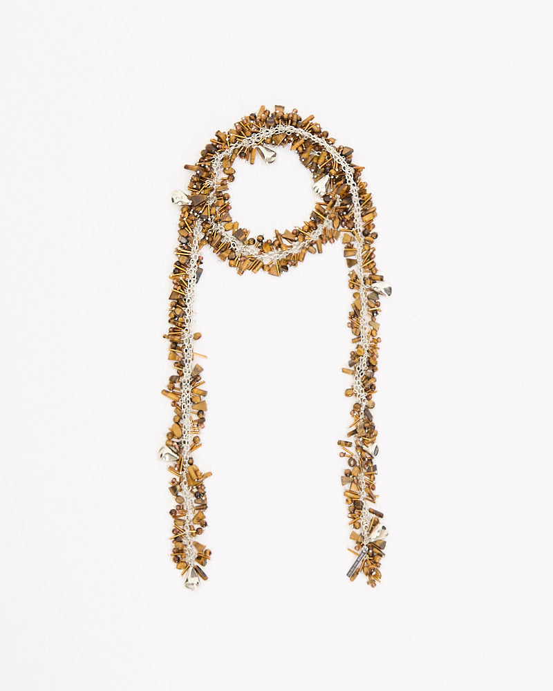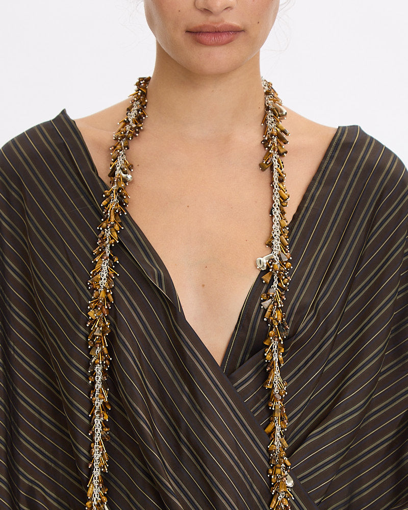 Dries Van Noten Embroidered Scarf Neckline in tiger eye features a scarf like drape necklace with assorted tiger eye tone beads.