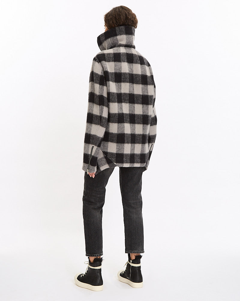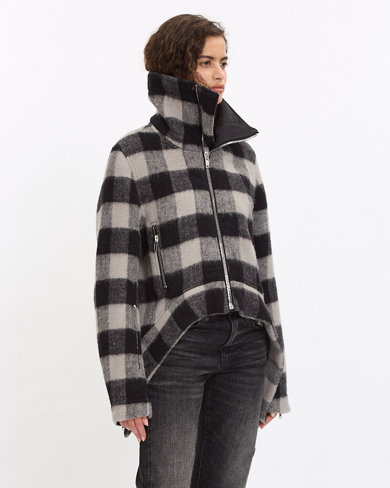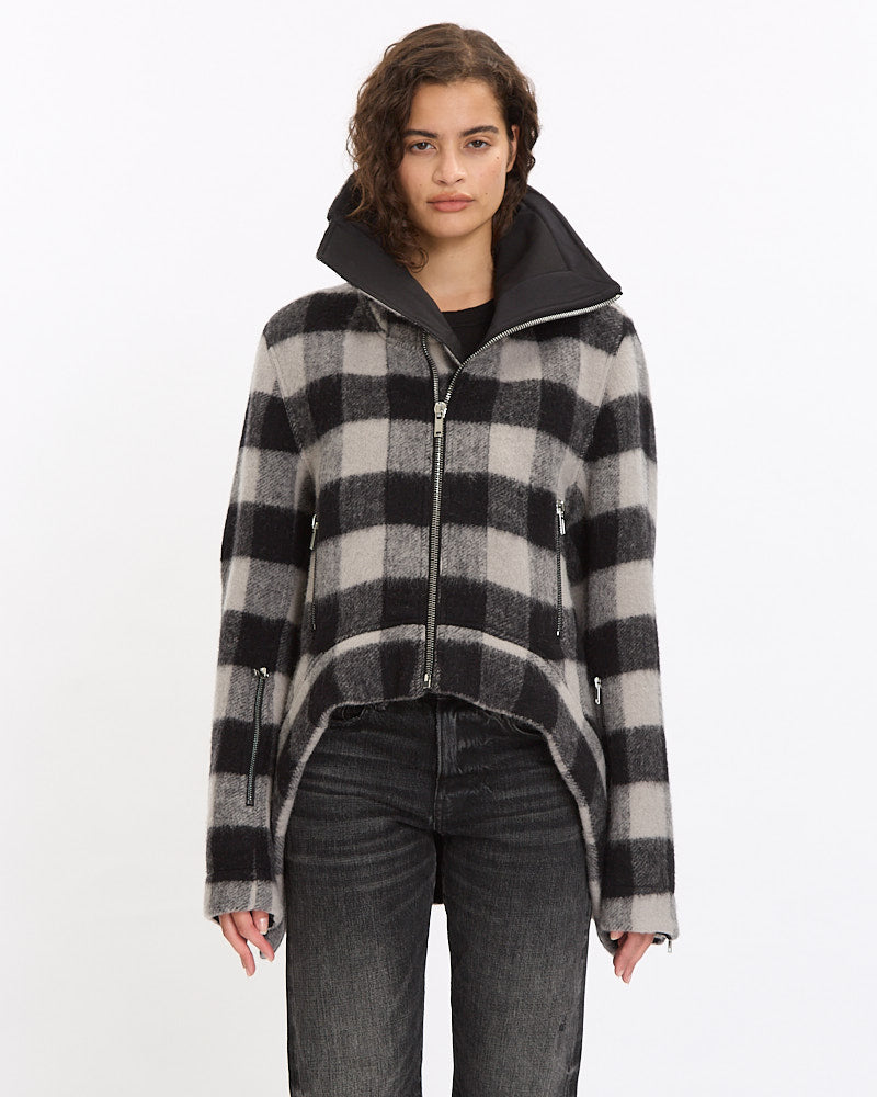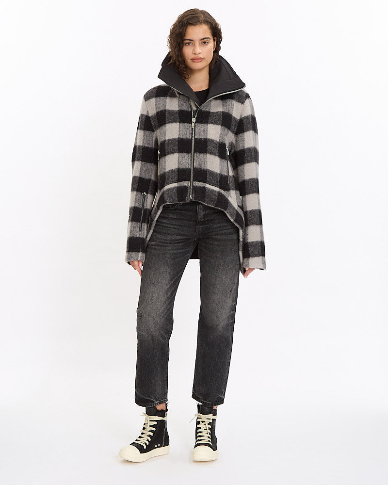 Rick Owens Exploder Jacket in black plaid features a boxy fit with a high funnel neck collar. Details include full zip closure, asymmetrical hem and zipper accents.