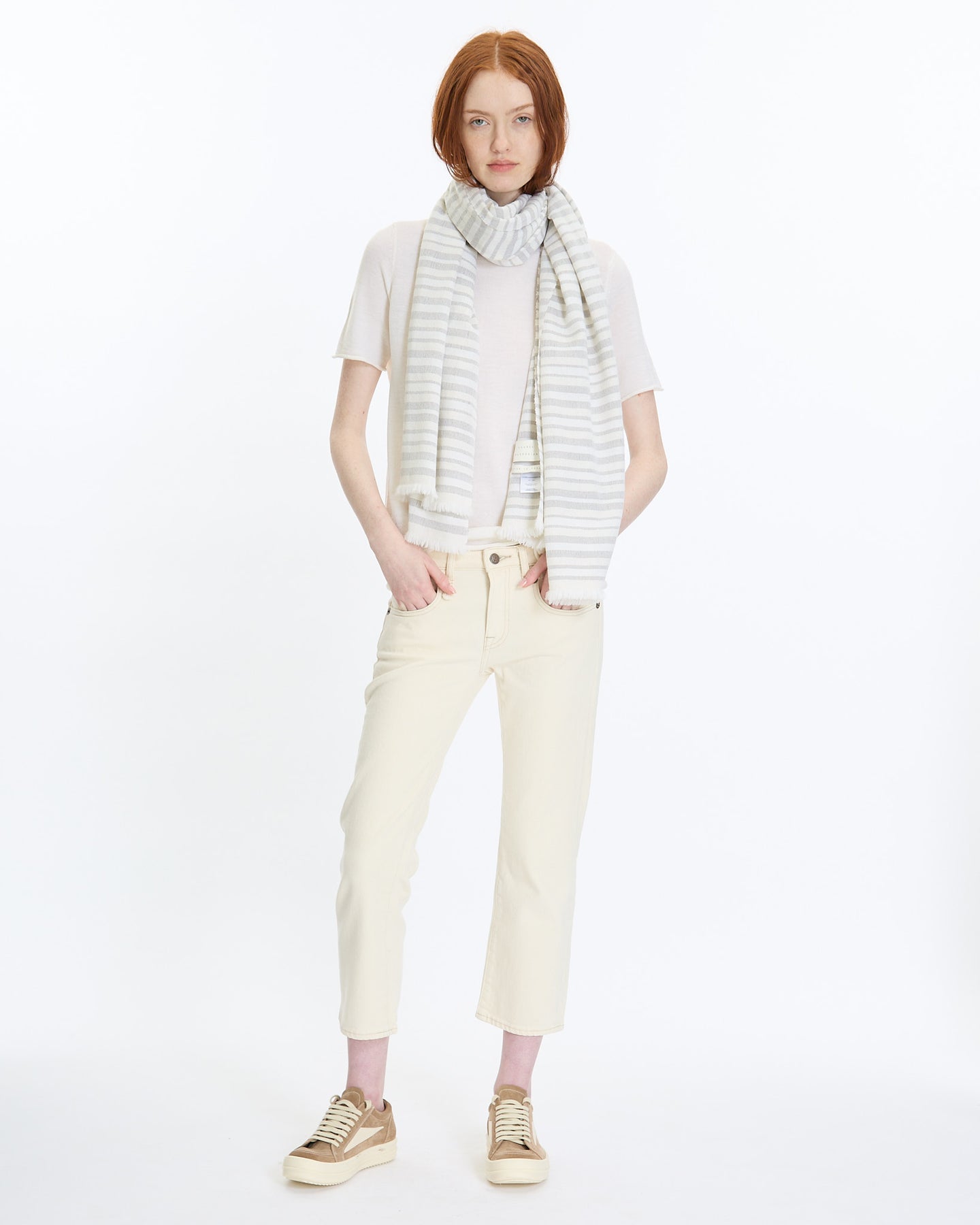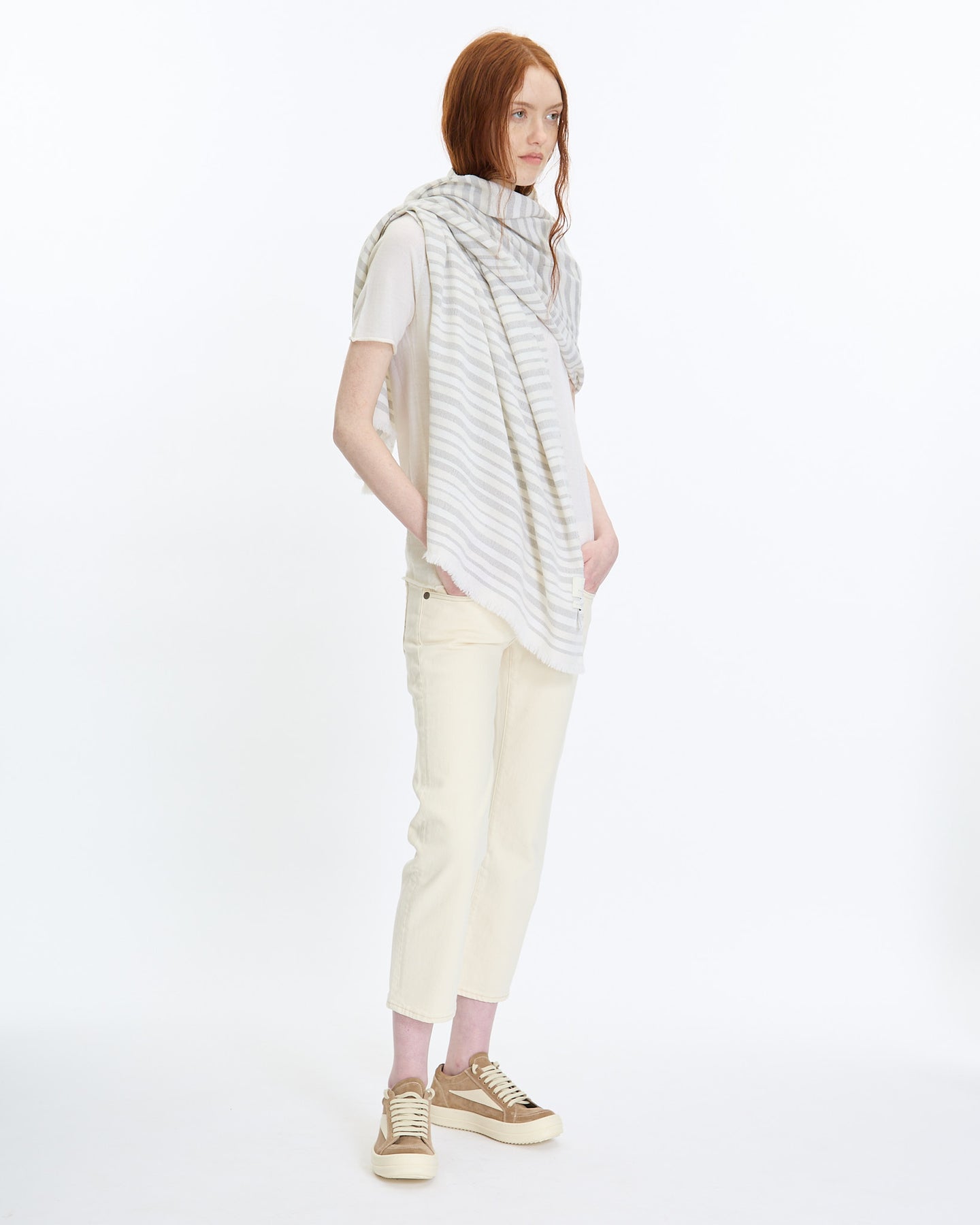 Lauren Manoogian Fine Lines Wrap in concrete features a light weight hand woven fabrication. Details include fringe finishing and a soft hand.