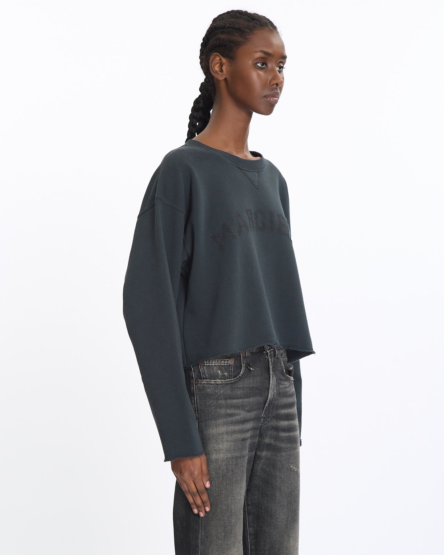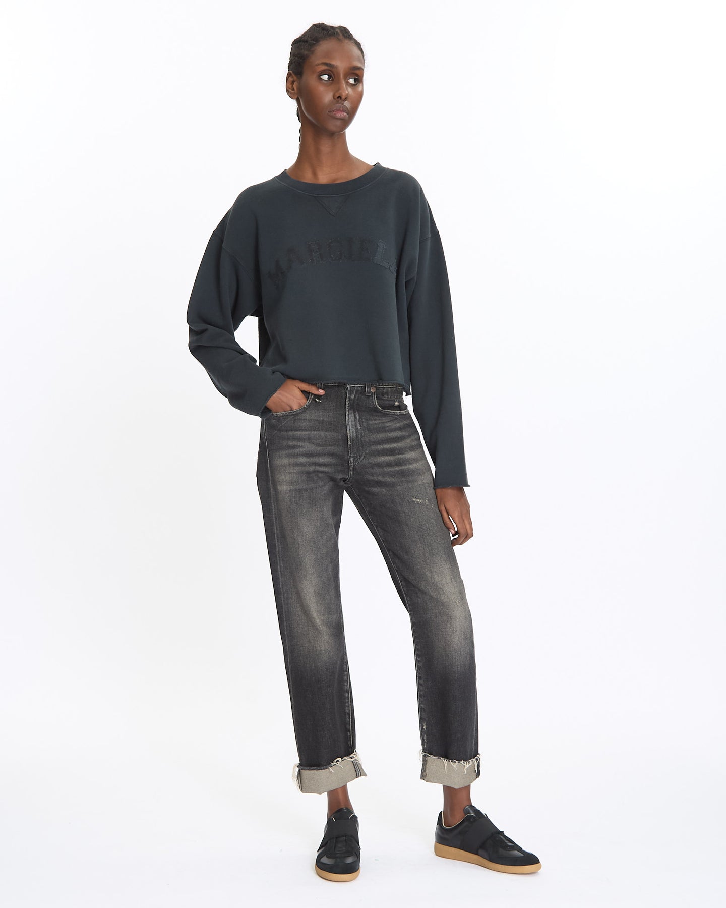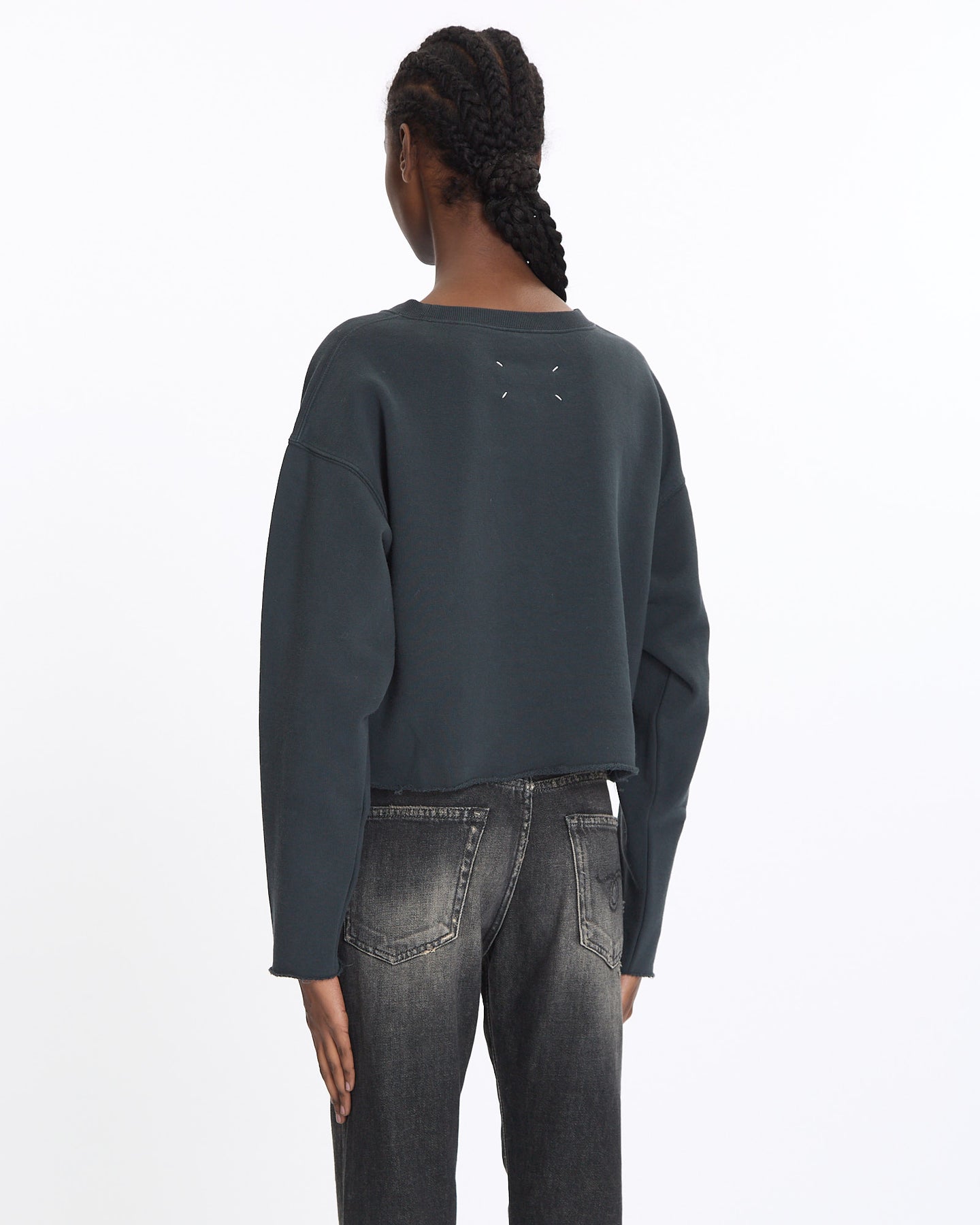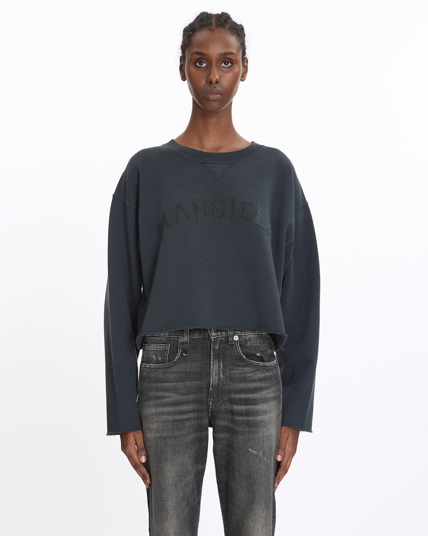 Maison Margiela Firm Fleece Sweatshirt in black features a cropped silhouette. Details include Maison Margiela embroidery at the front, dropped shoulder, ribbed neck, raw-edge hem and four stitches at the back.