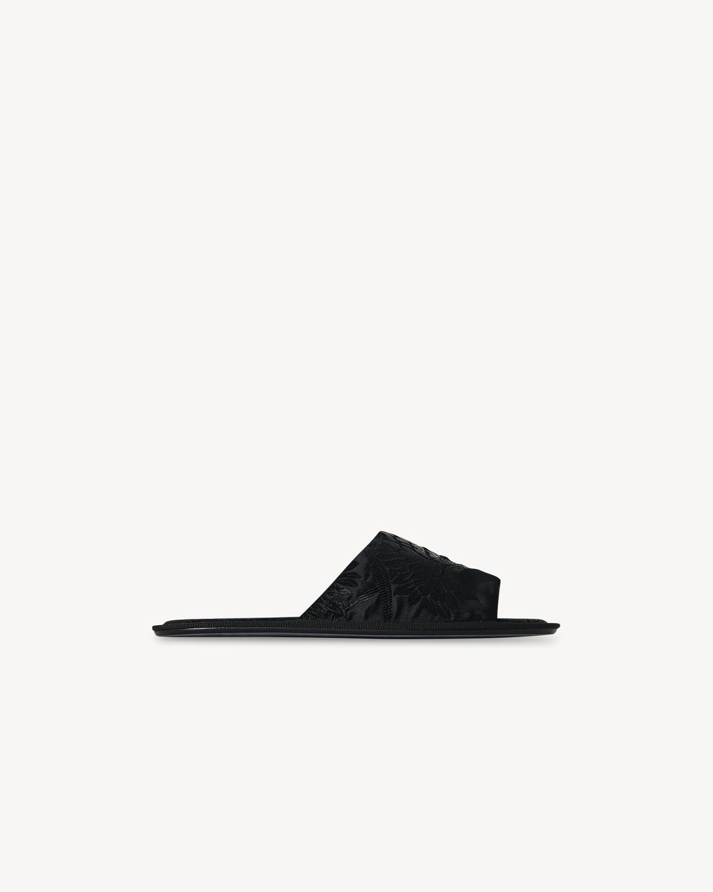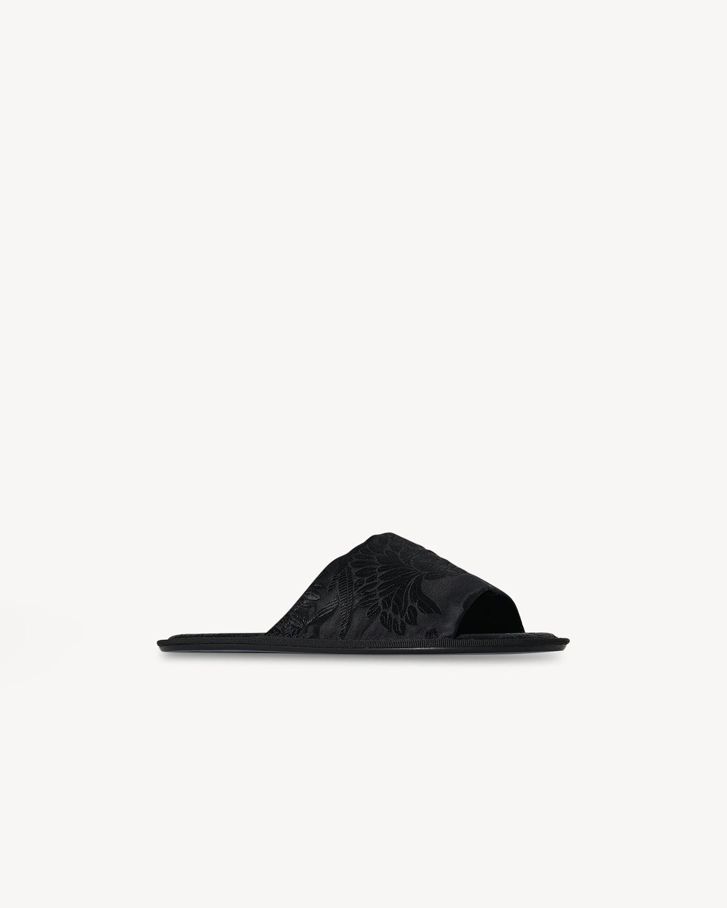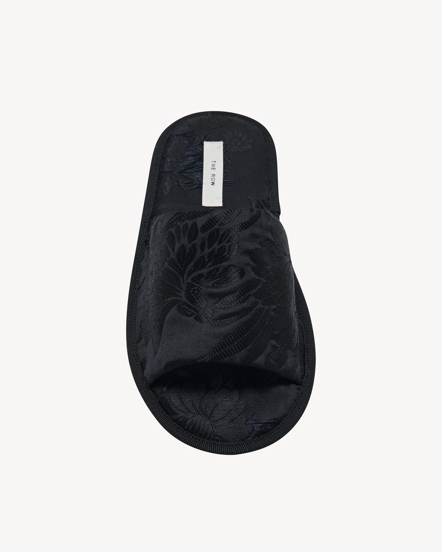 The Row Frances Open Toe Slipper in black features a classic house slipper in silk jacquard with open-toe, slip-on construction, and leather sole for indoor-outdoor wear.
