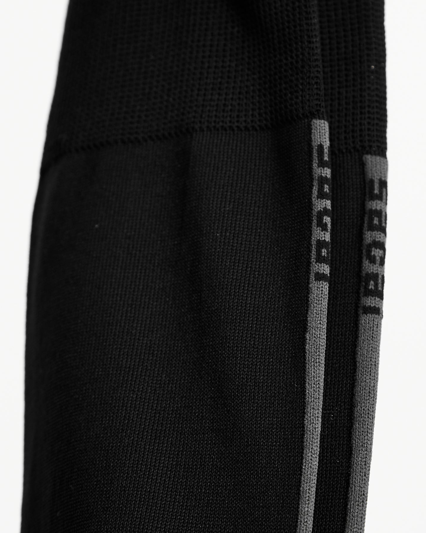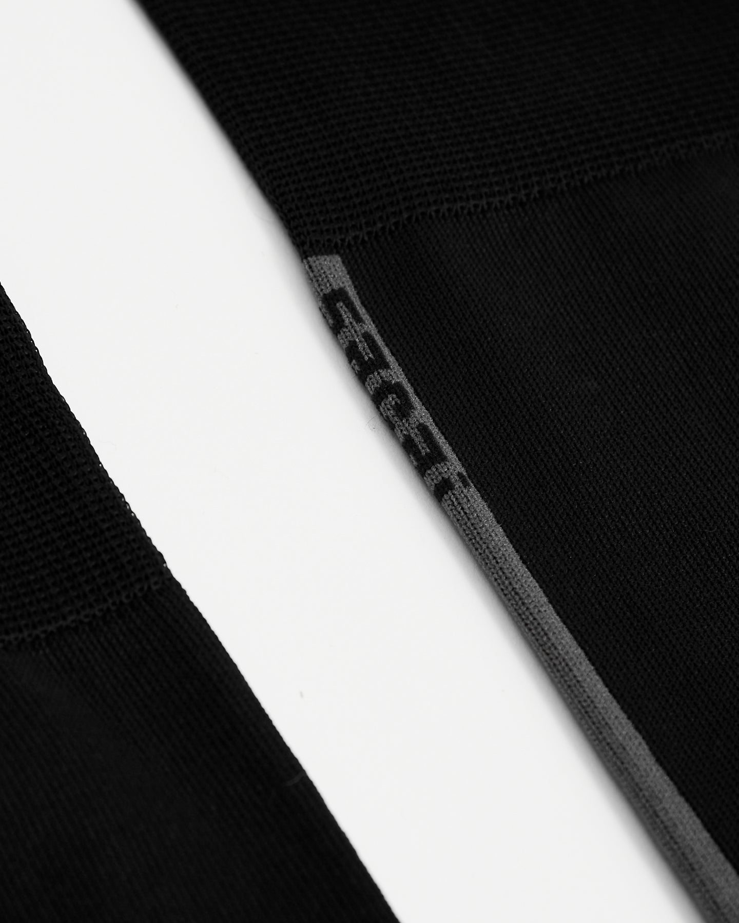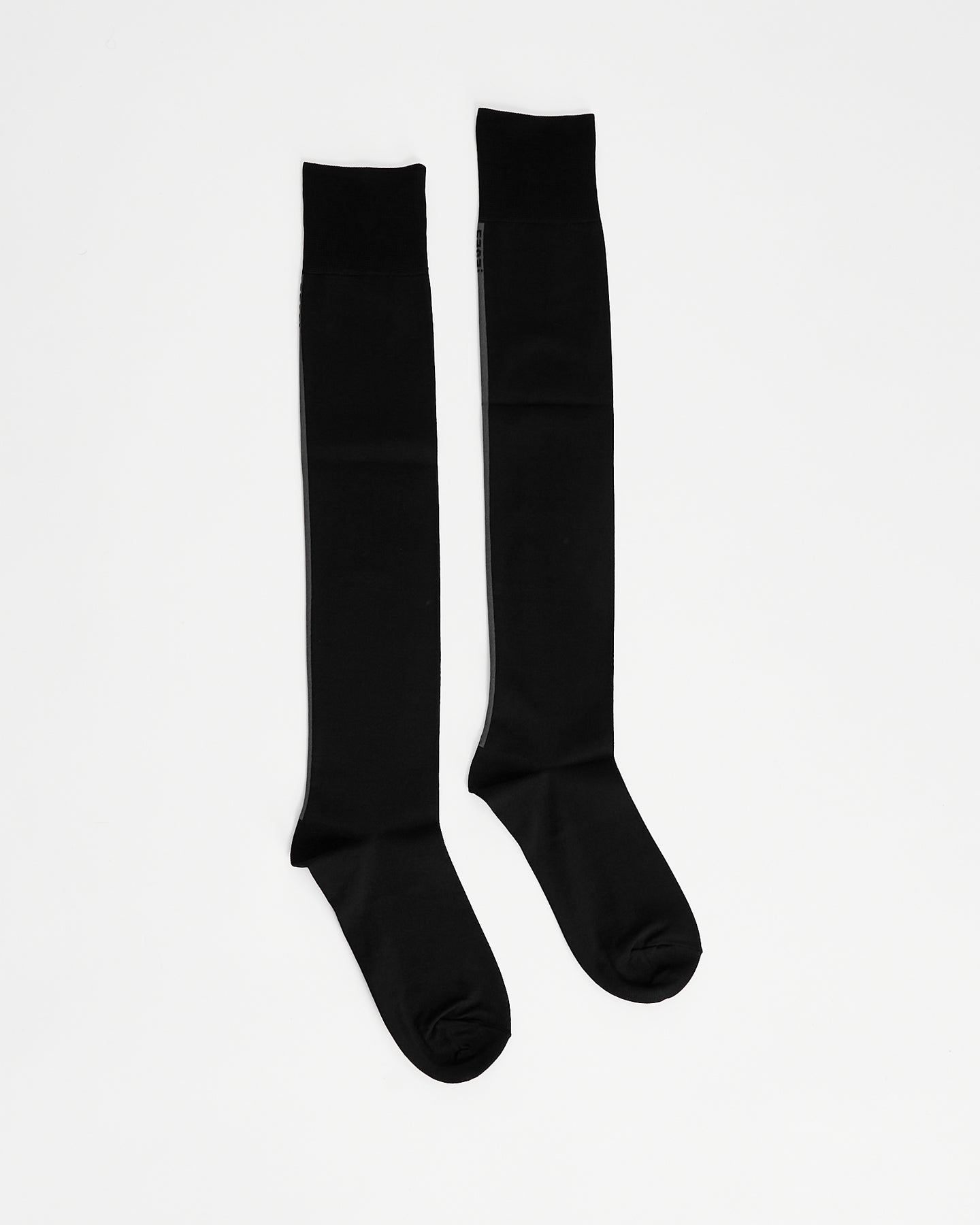 Sacai High Socks in black features a knee high length in fine stretch knit with a contrast grey stripe up the back with Sacai Logo.