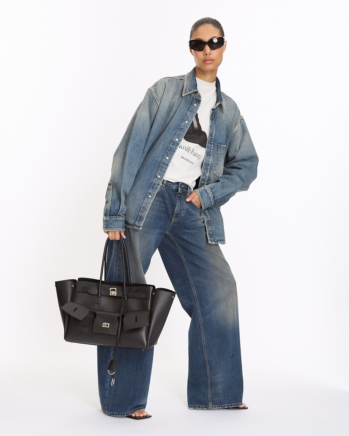 Styled with Balenciaga Wide Leg Baggy Pant, Balenciaga Bel Air Sandal, Balenciaga Bossy Cat Sunglasses, and Balenciaga Bel Air Carry M