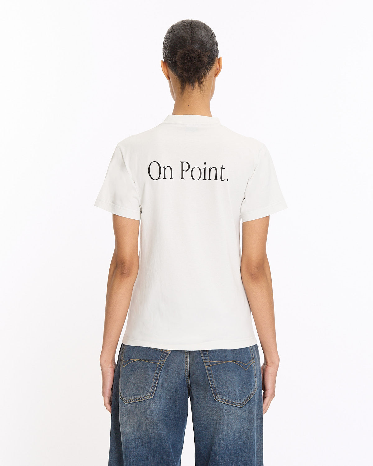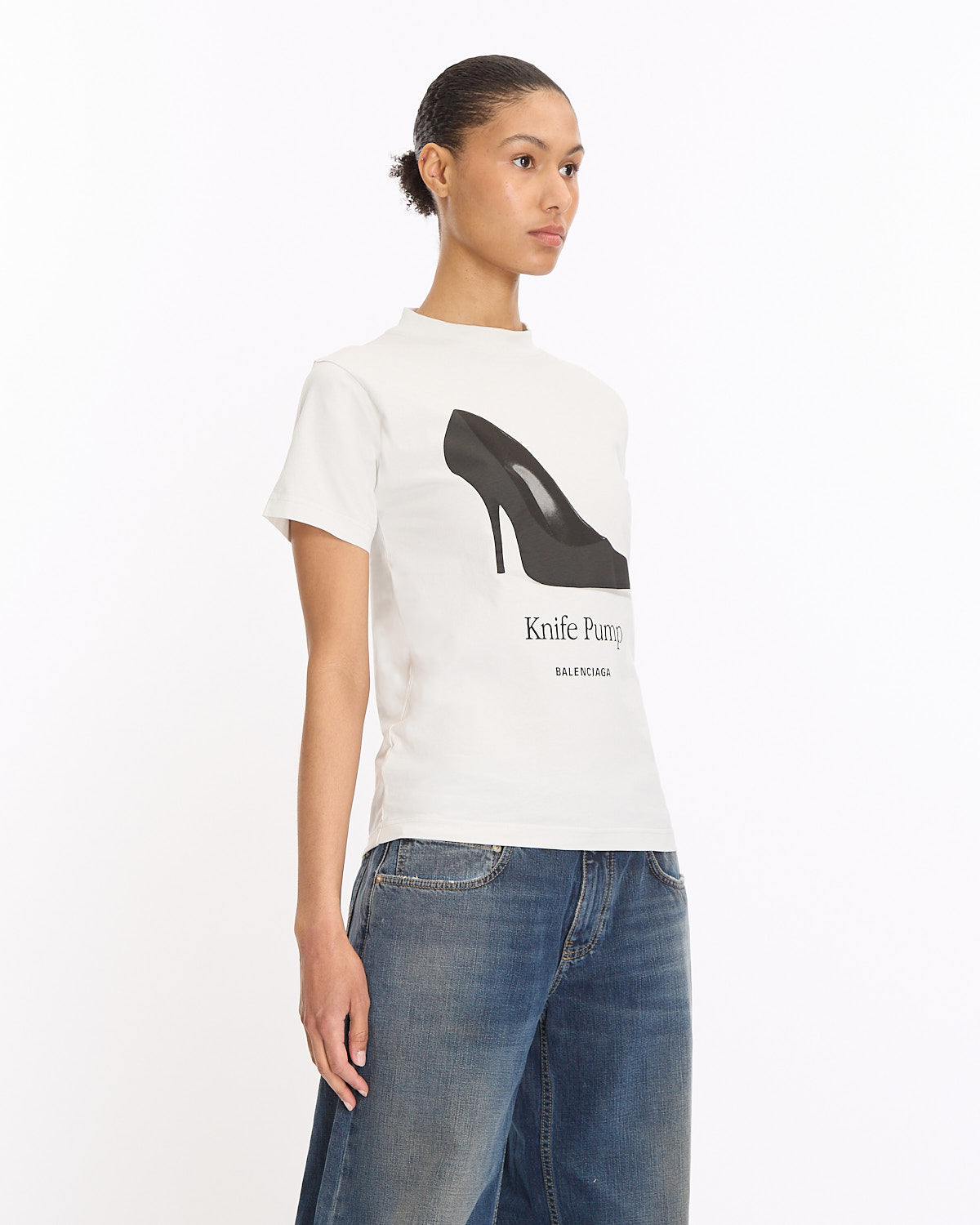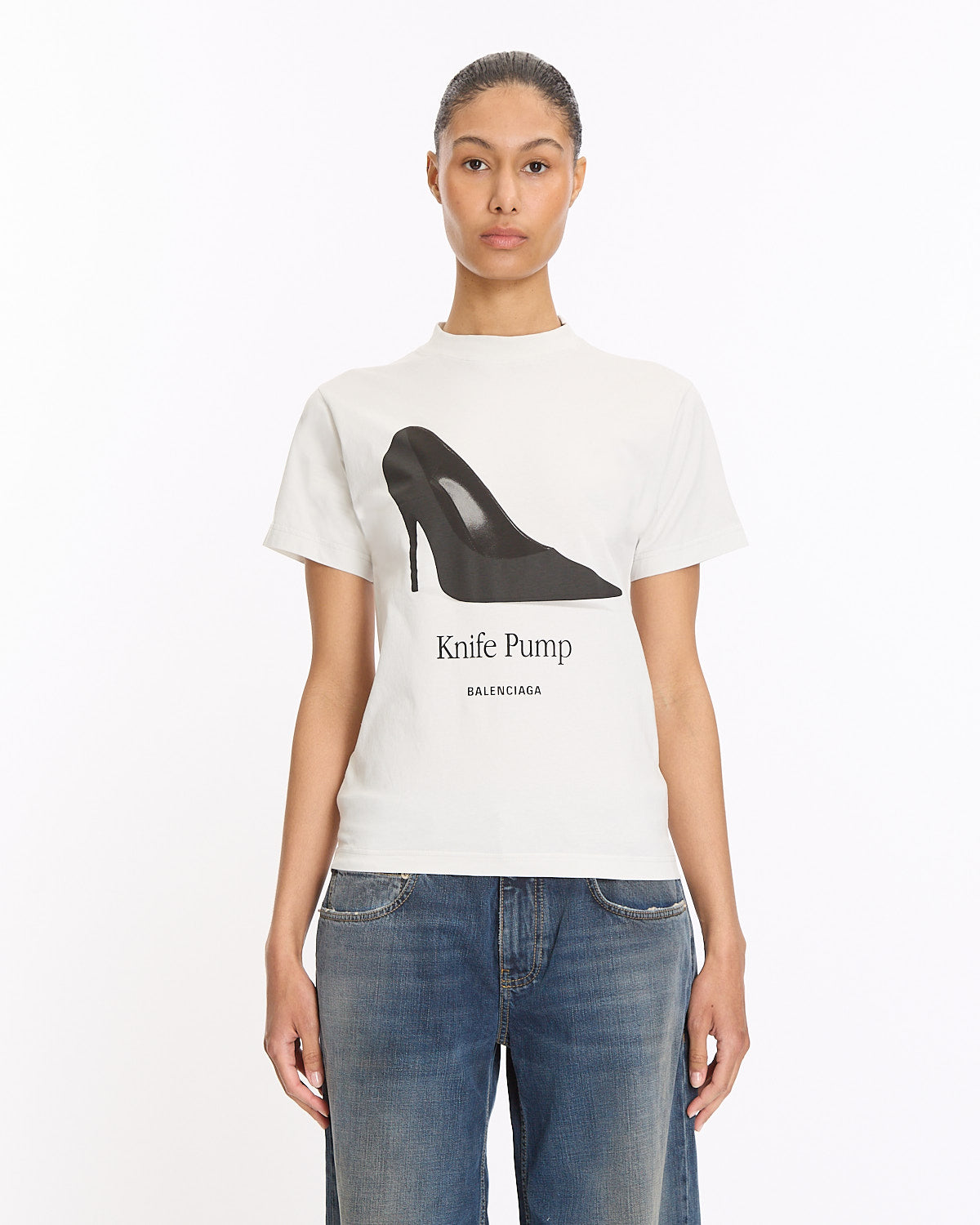 Balenciaga Knife Pump T-Shirt in dirty white features a fitted silhouette in a jersey cotton fabrication. Details include crewneck line, short sleeves and knife pump graphic at front and back.