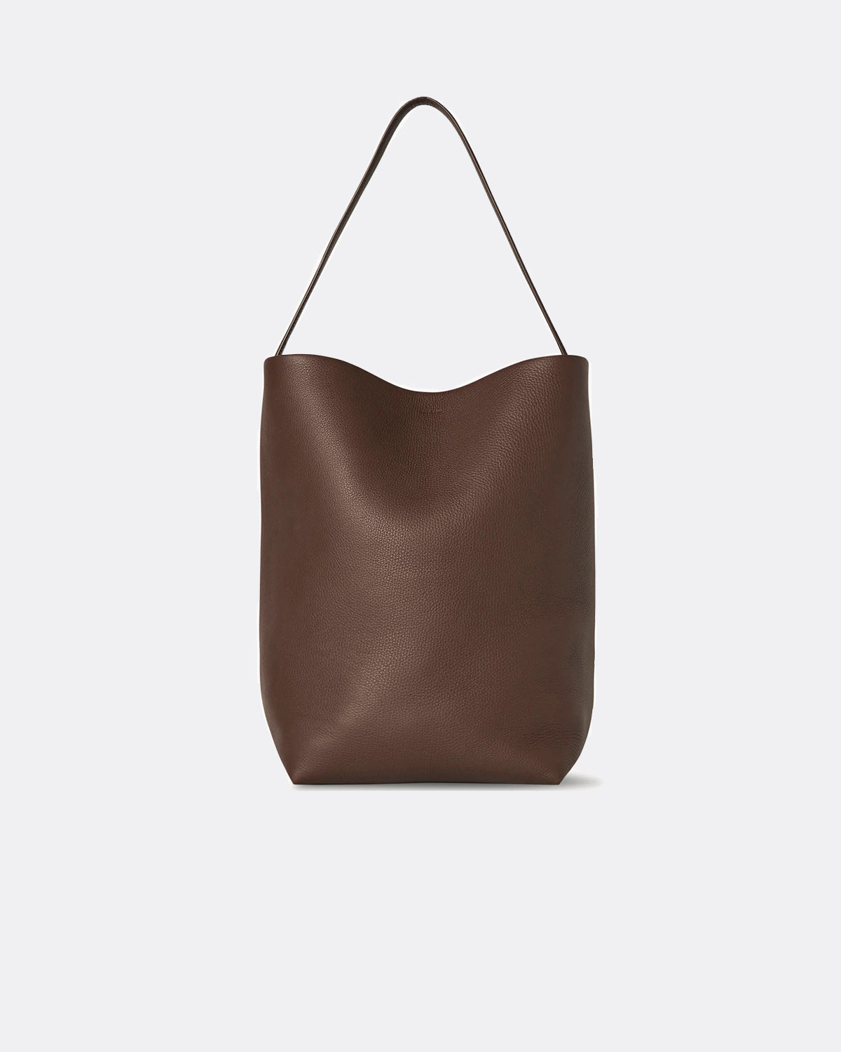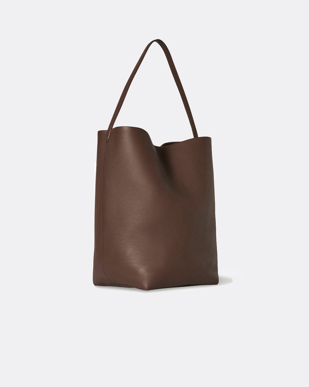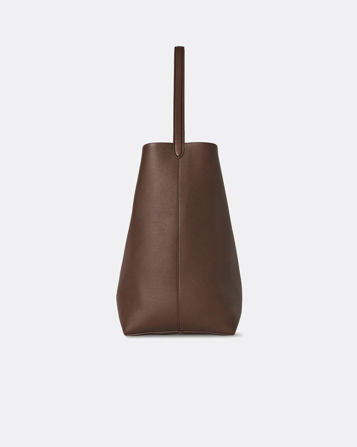 The Row Large N/S Park Tote in dark olive features a classic tote design in a grained calfskin leather. Details include interior toggle closure, flat handle, suede lining and embossed logo at front.
