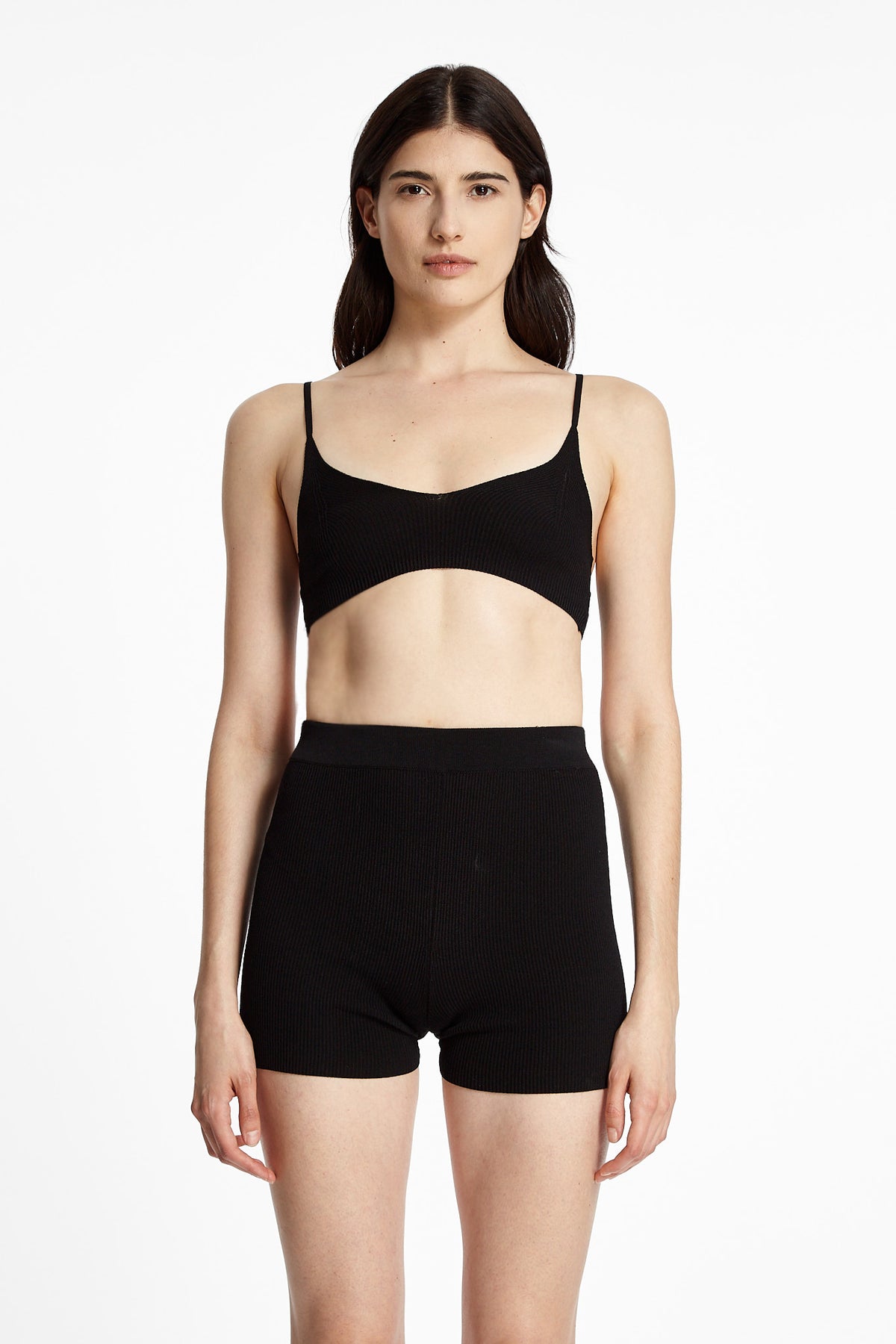 Jacquemus Le Bandeau Valensole in black features a ribbed knit fabrication and spaghetti straps.