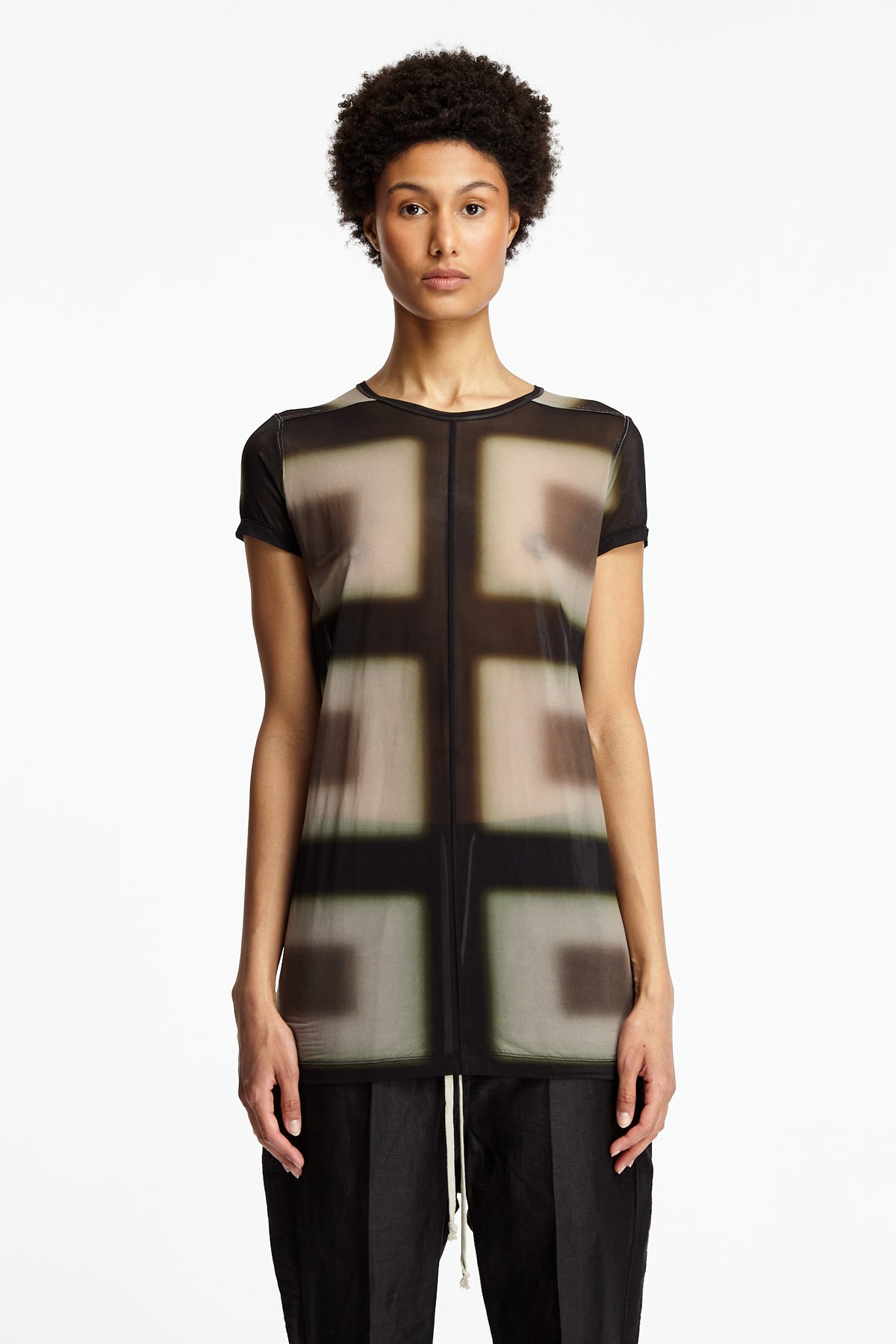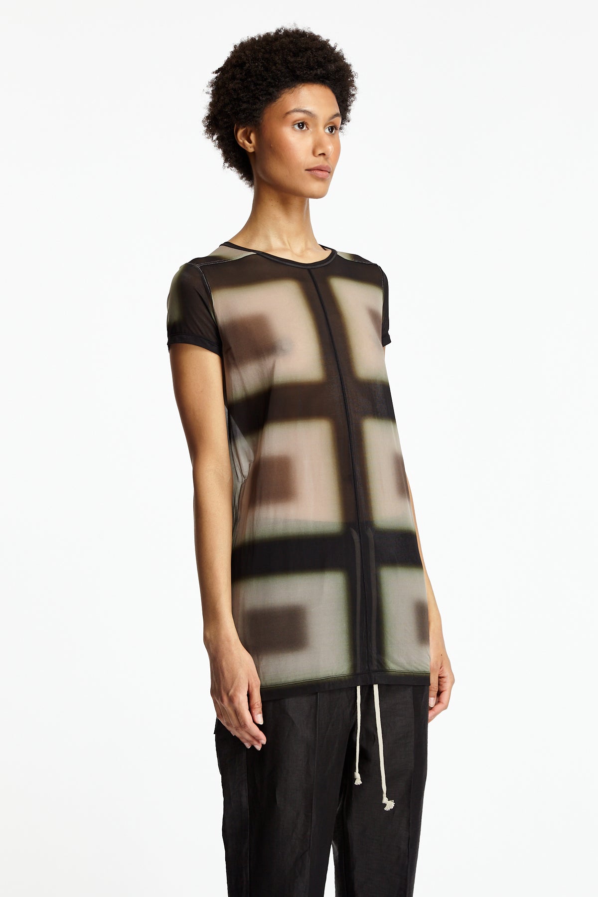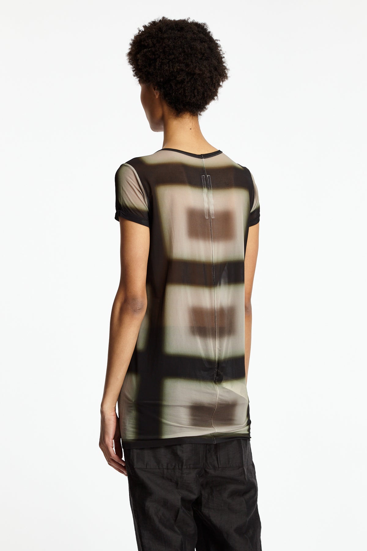 Rick Owens Level T-Shirt in black features a fitted silhouette. Details include plaid ombre print with sheer finishing.