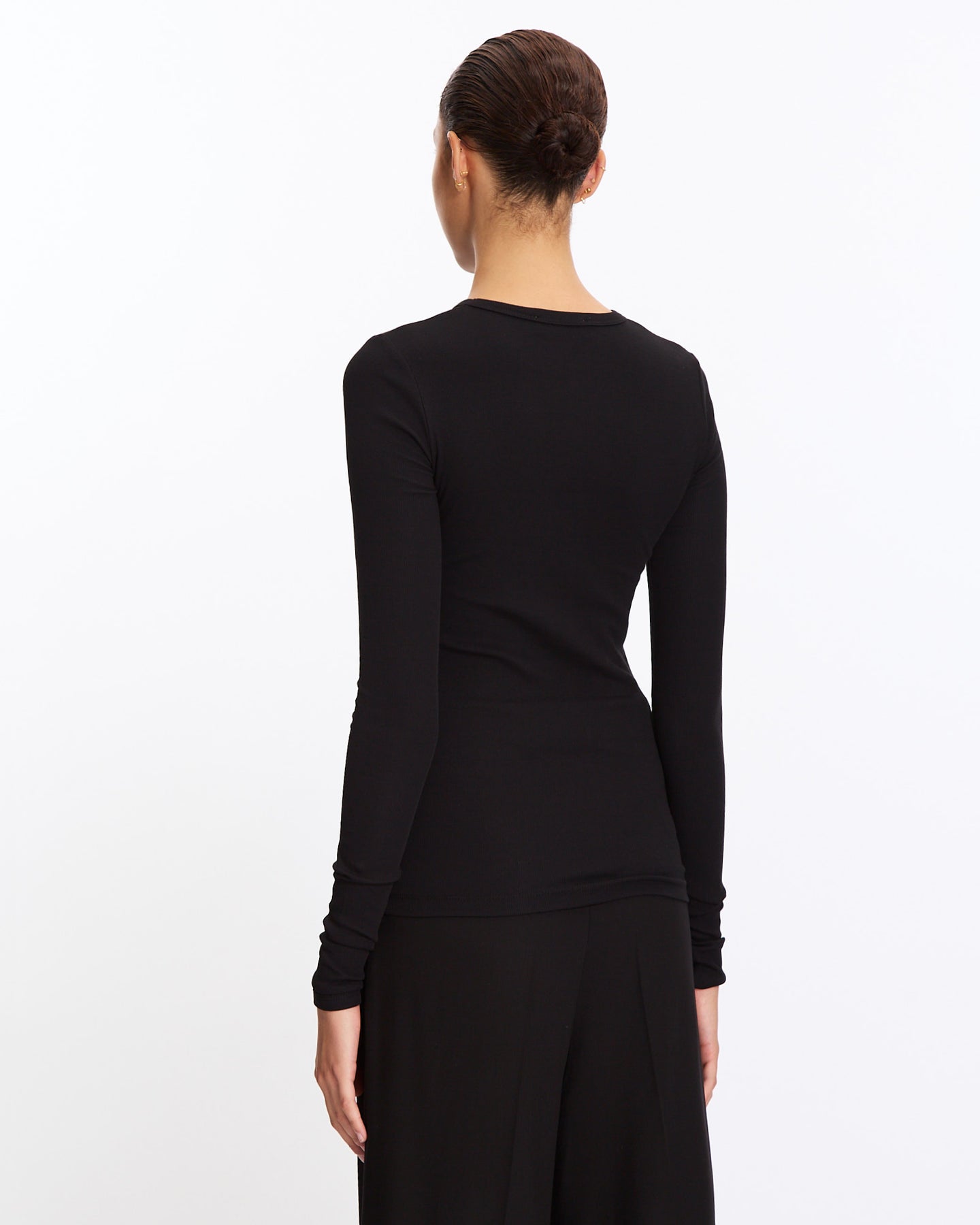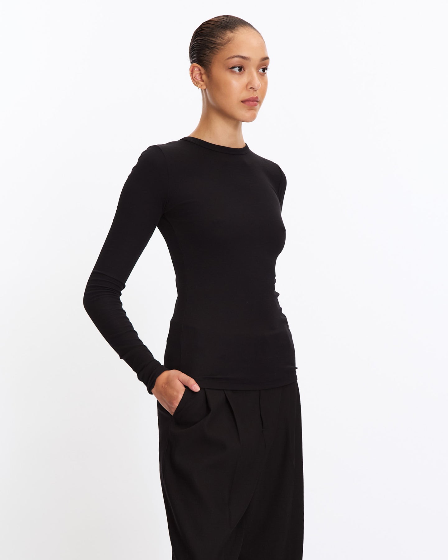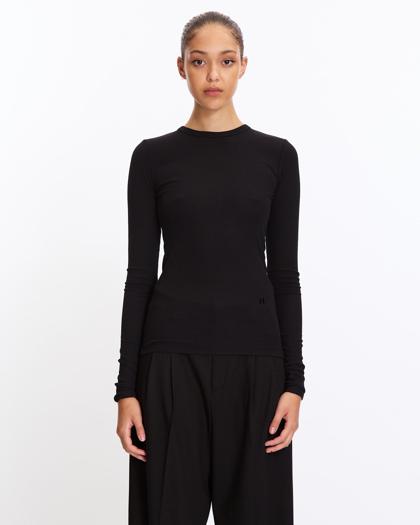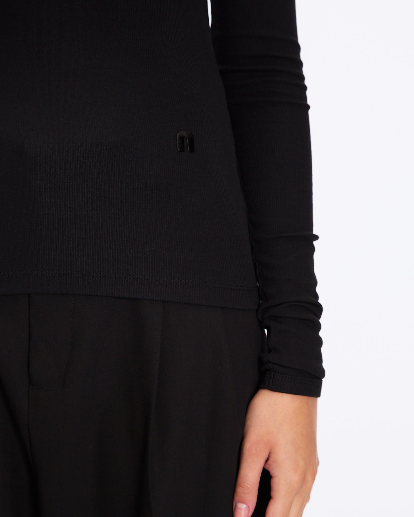 Teurn Studios Long Sleeve Rib Top in black features a body con fit. Details include soft organic cotton fabrication, light weight rib knit and embroidered 'N' logo.