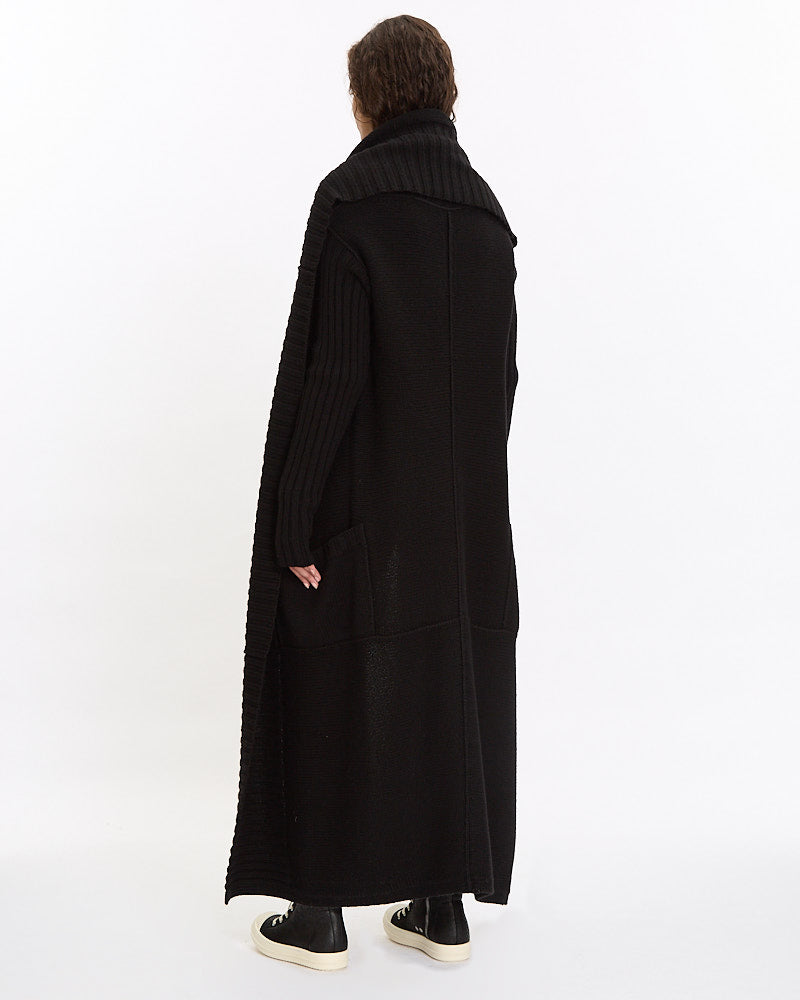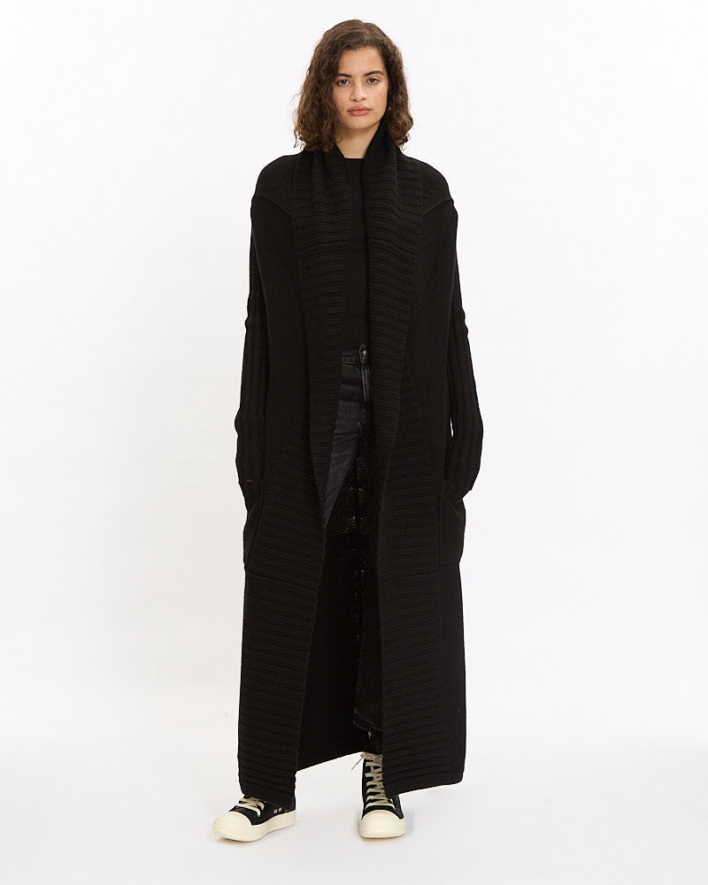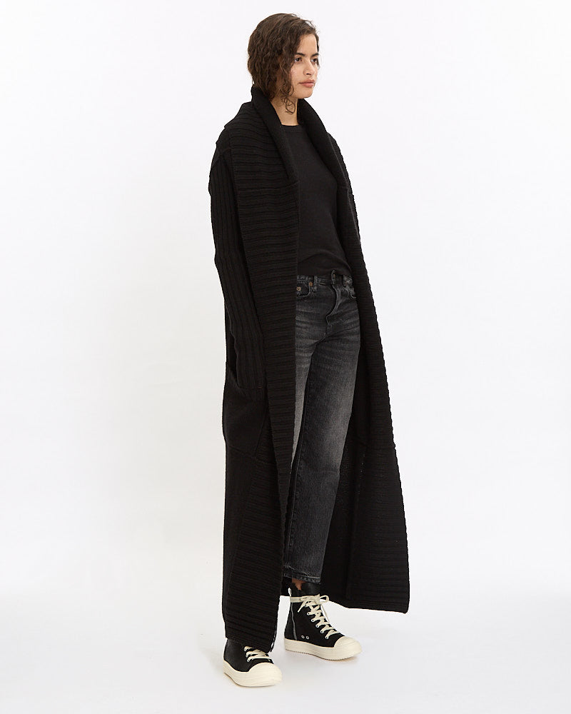 Rick Owens Maglia Cardigan in black features a relaxed fit in a heavy weight cashmere fabrication. Details include shawl collar, open front, long sleeves, front patch pockets, and ribbed finishing at sleeves, collar and hem.