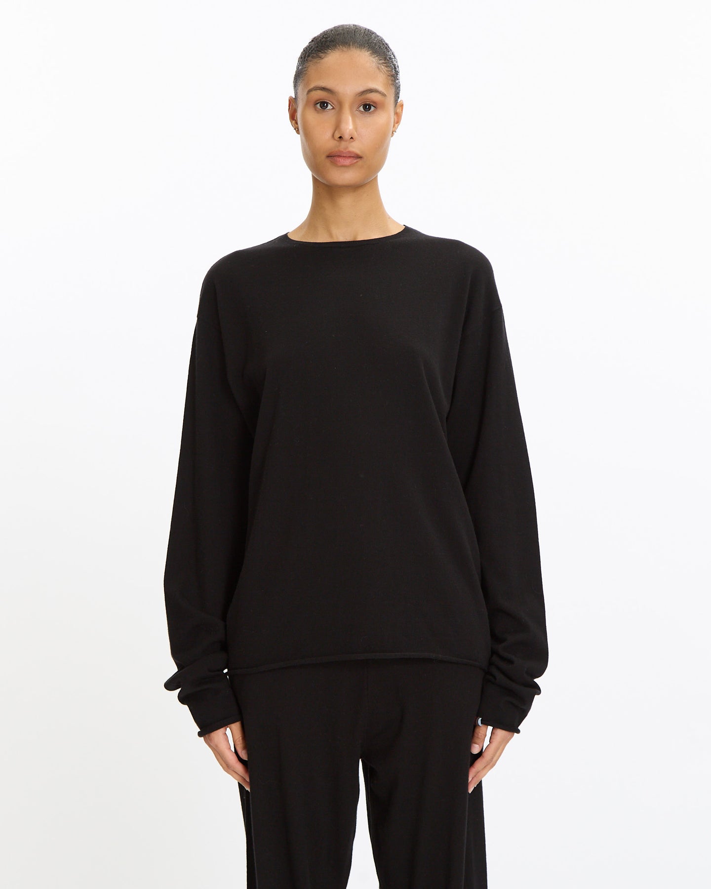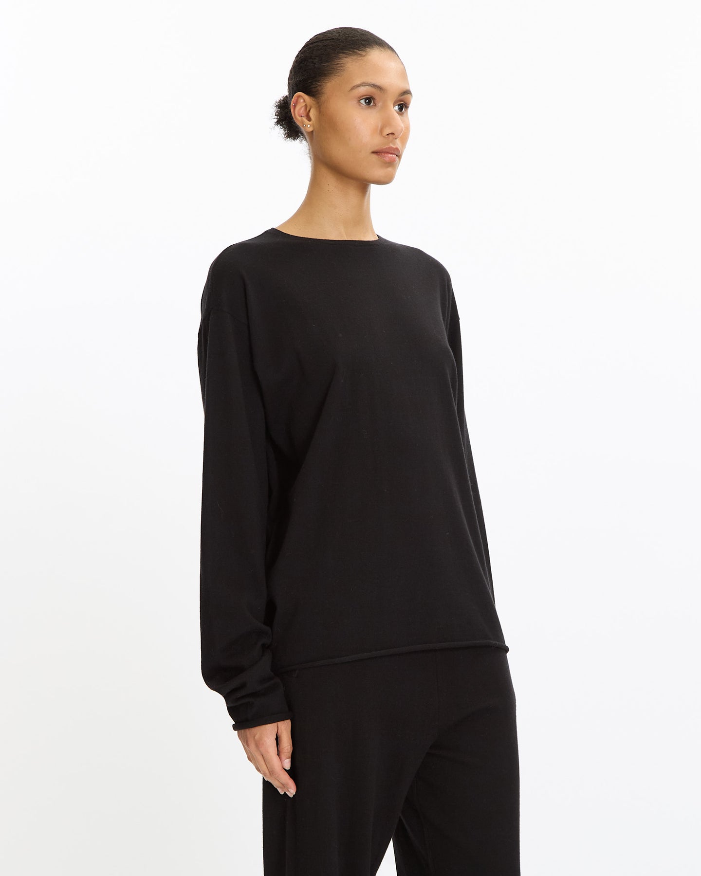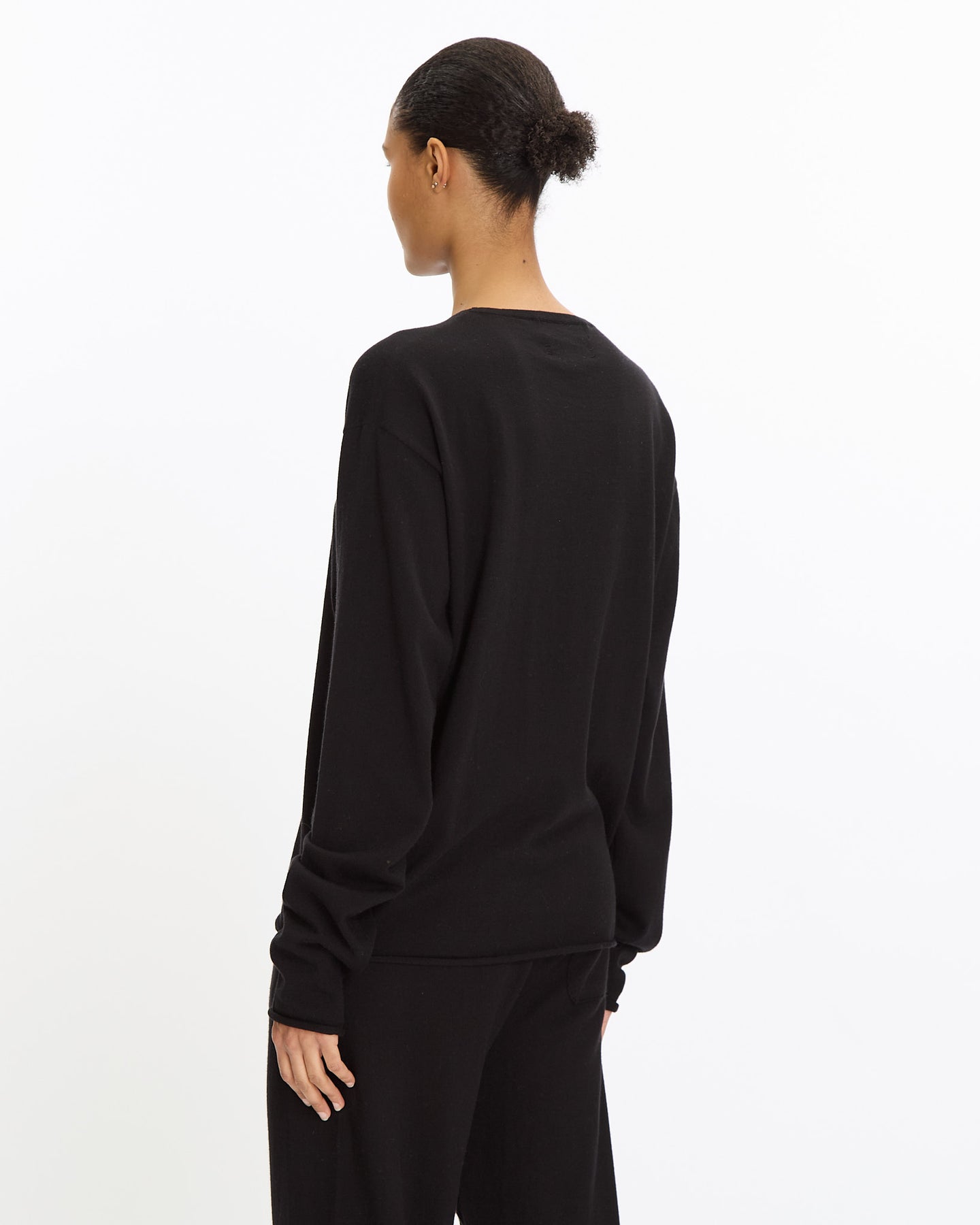 Extreme Cashmere N°347 Aries Shirt in raven features a relaxed fit. Details include light weight cotton-cashmere blend knit, crew neckline and rolled finishing at hem.