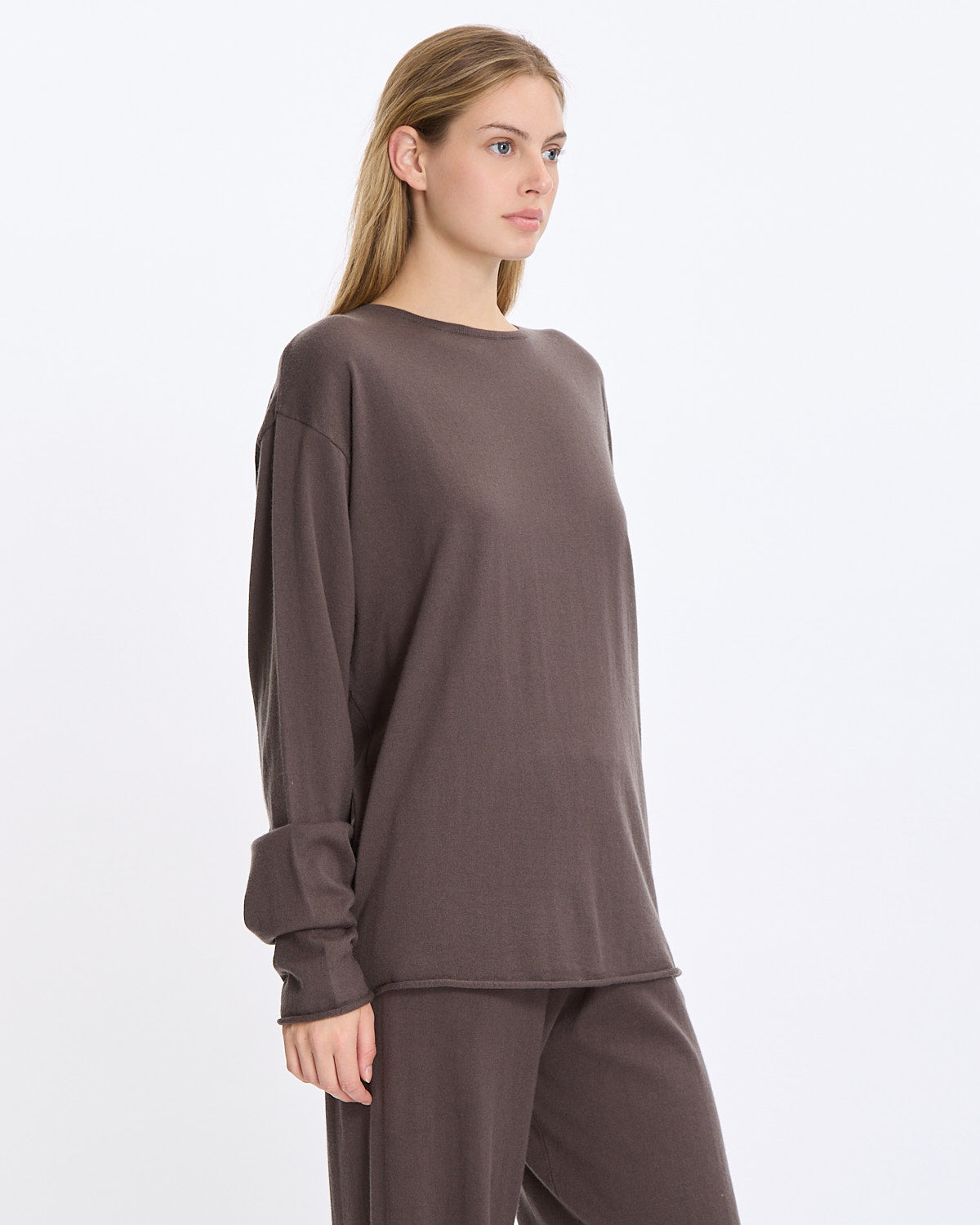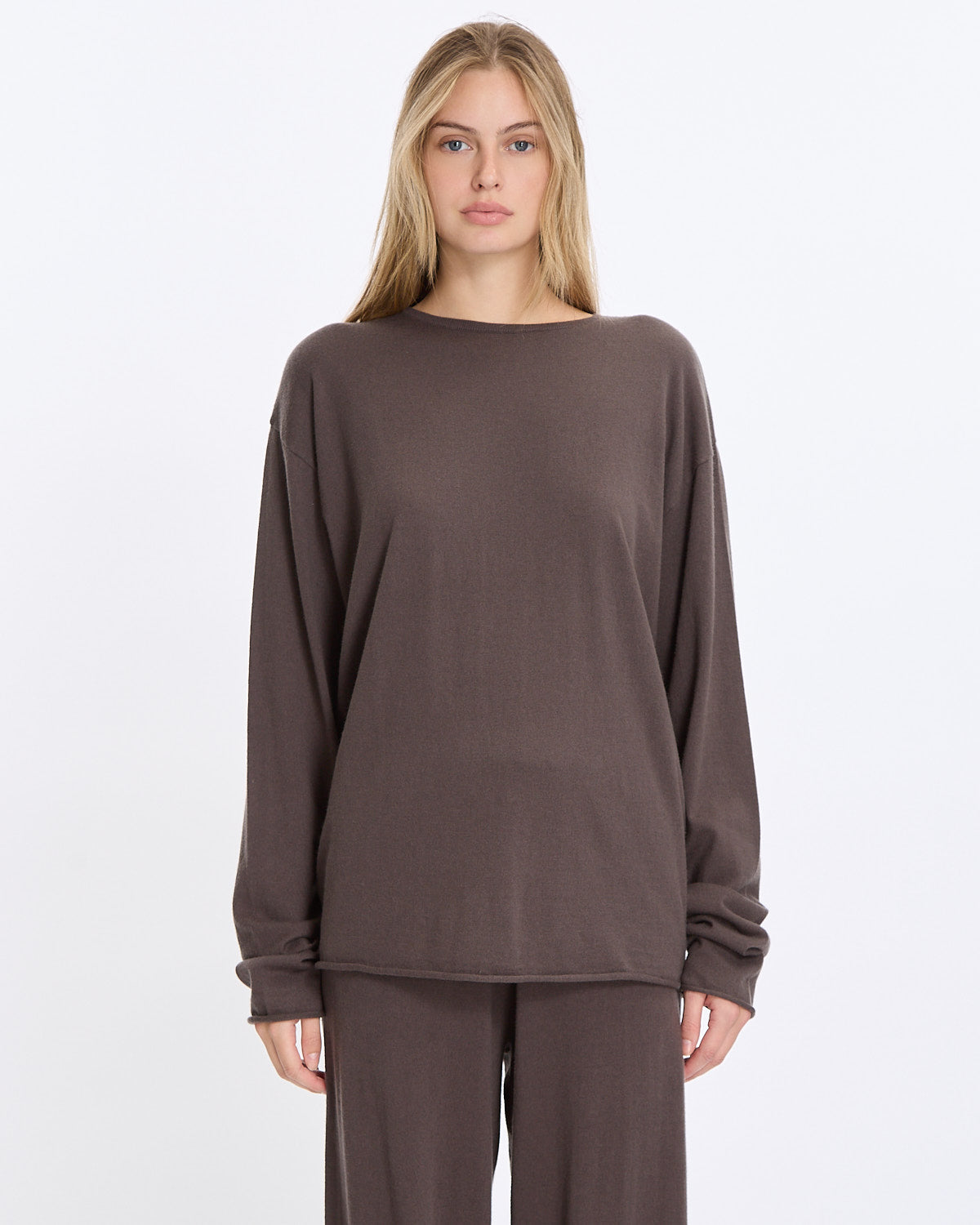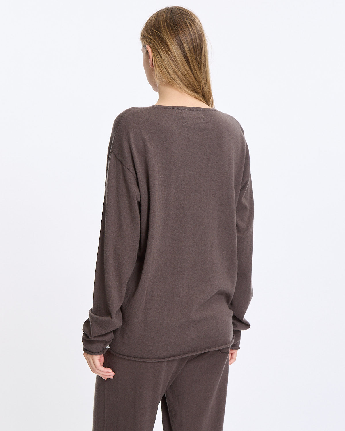 Extreme Cashmere N°347 Aries Shirt in mud features a relaxed fit. Details include light weight cotton-cashmere blend knit, crew neckline and rolled finishing at hem.