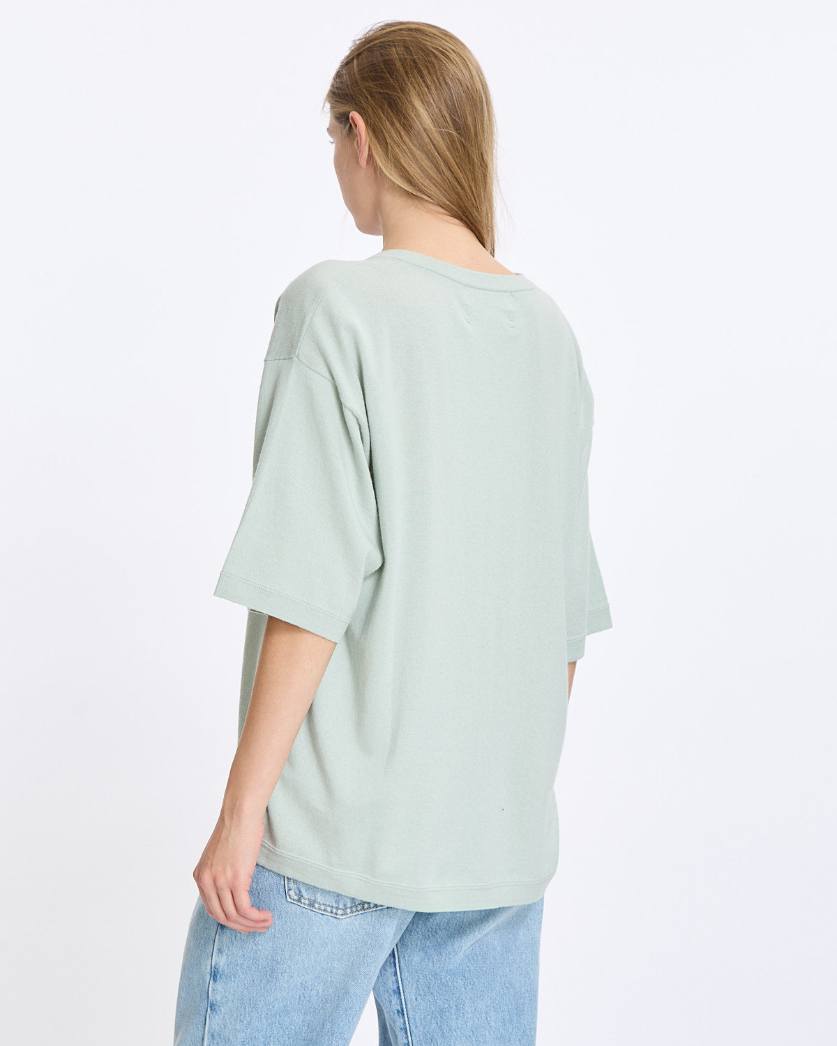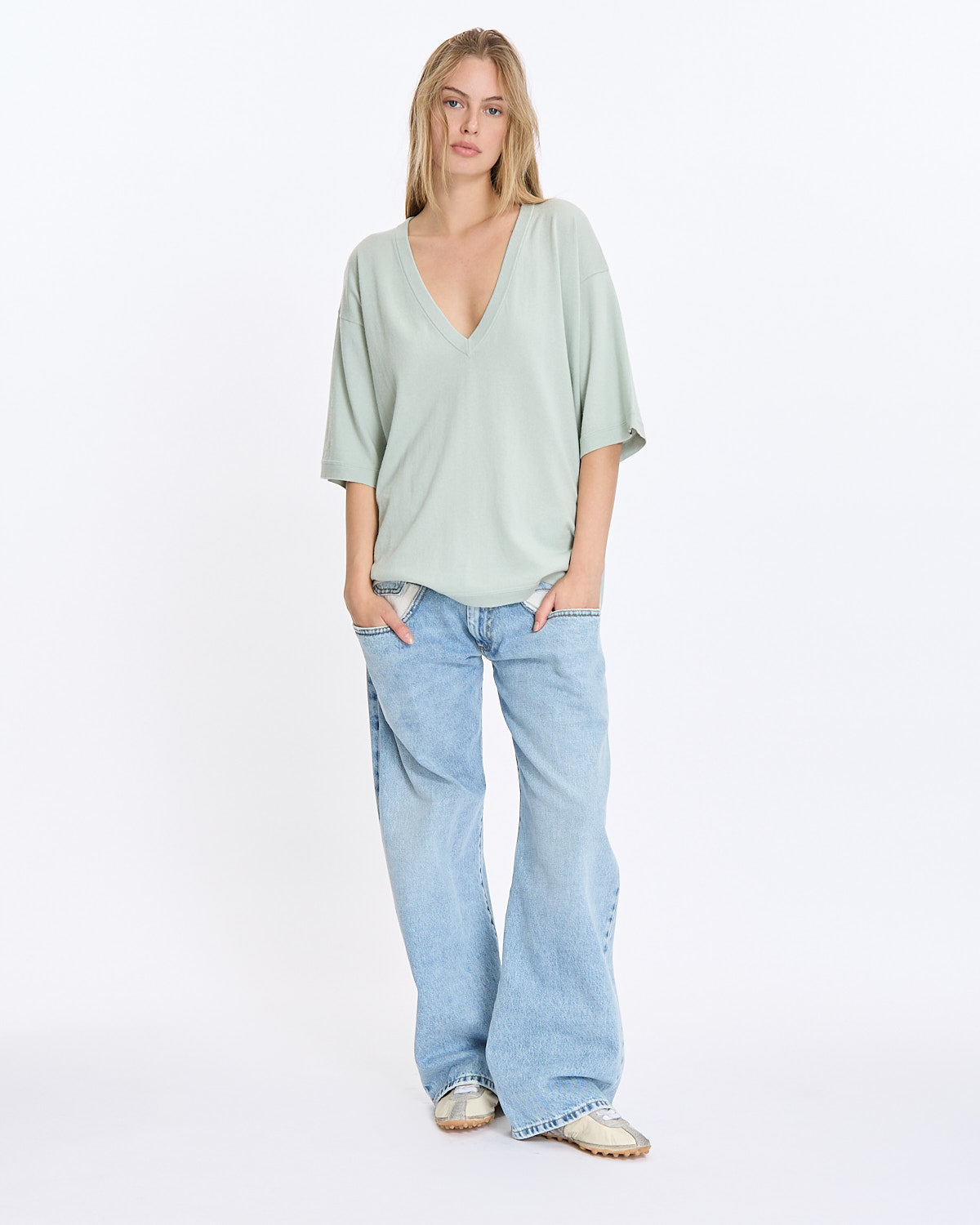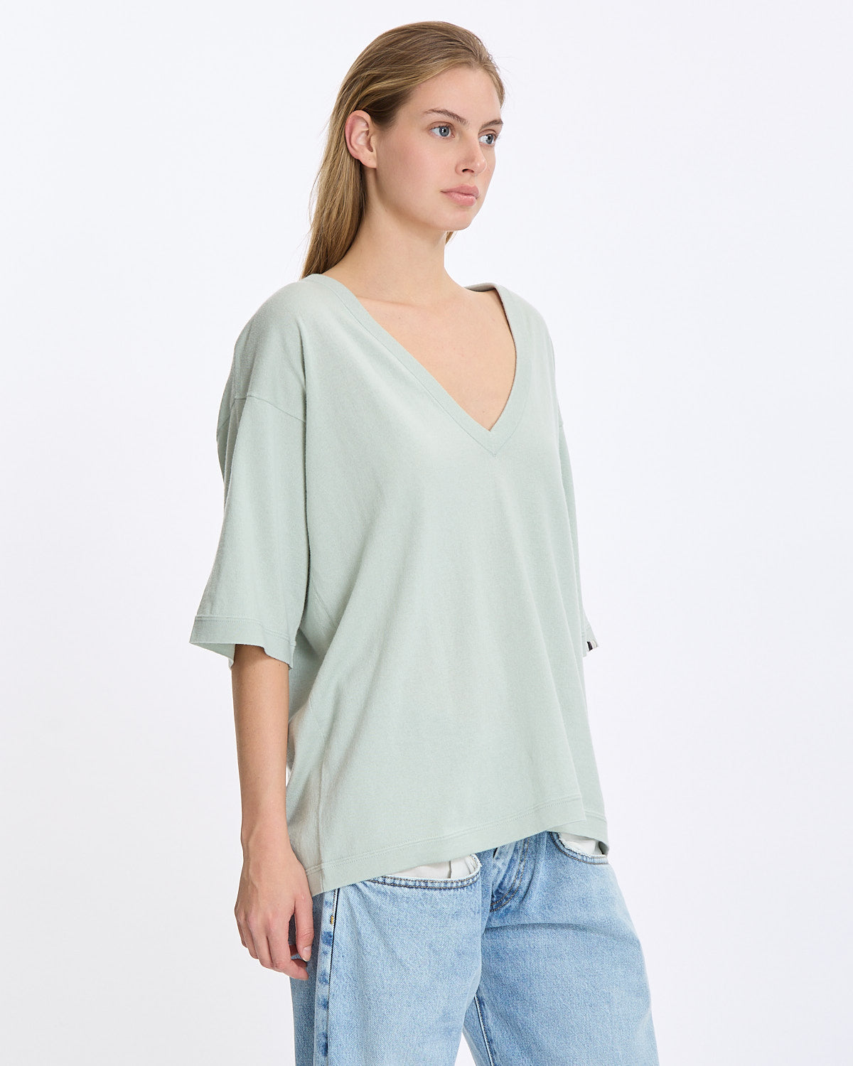 Extreme Cashmere N°406 Indi Shirt in glass features an oversized fit with a deep v-neckline. Details include drop shoulders, midi sleeves, and ribbed finishing at hemline, cuffs and neckline.