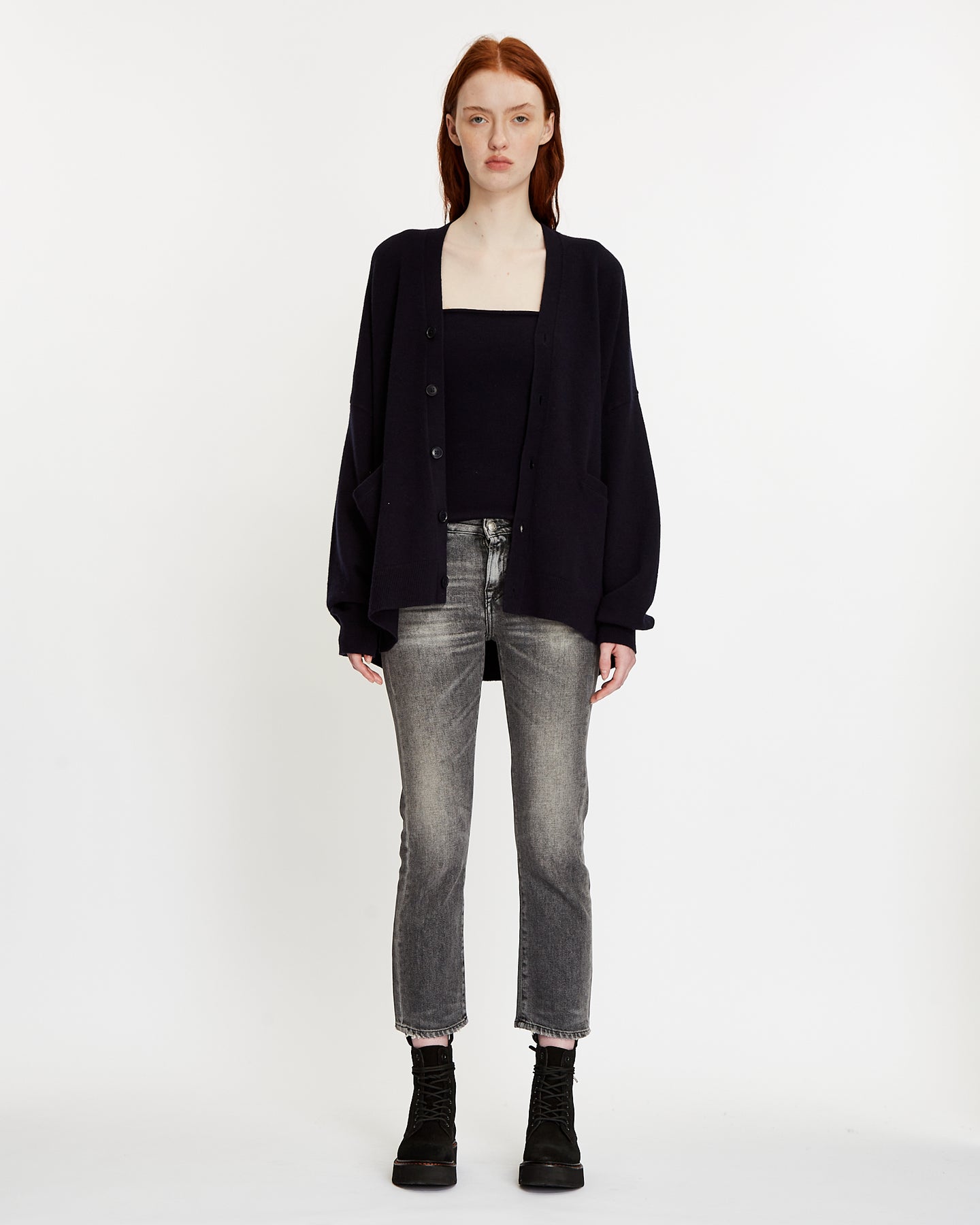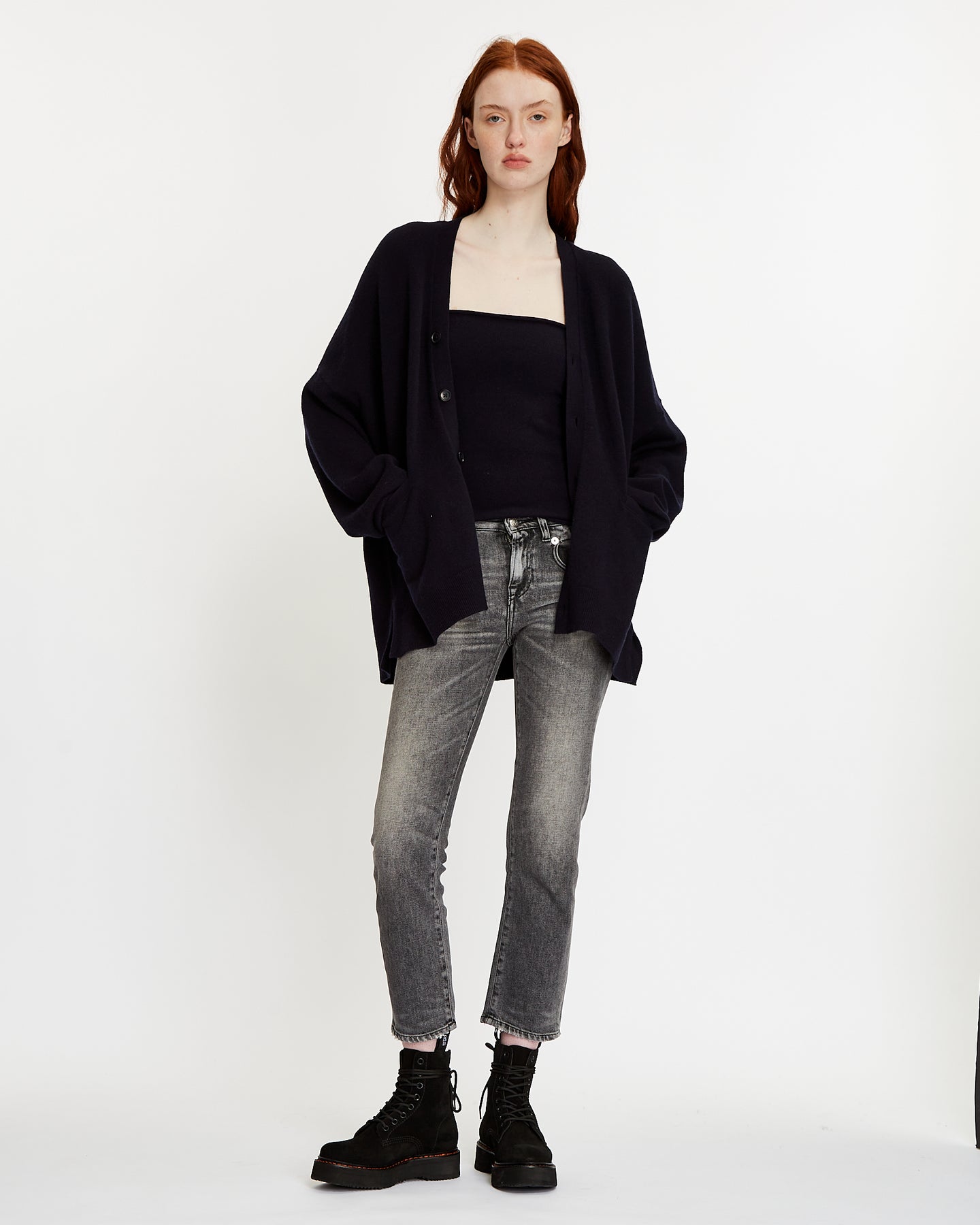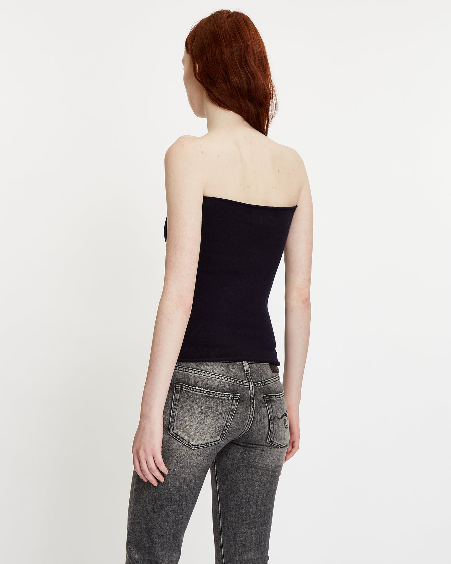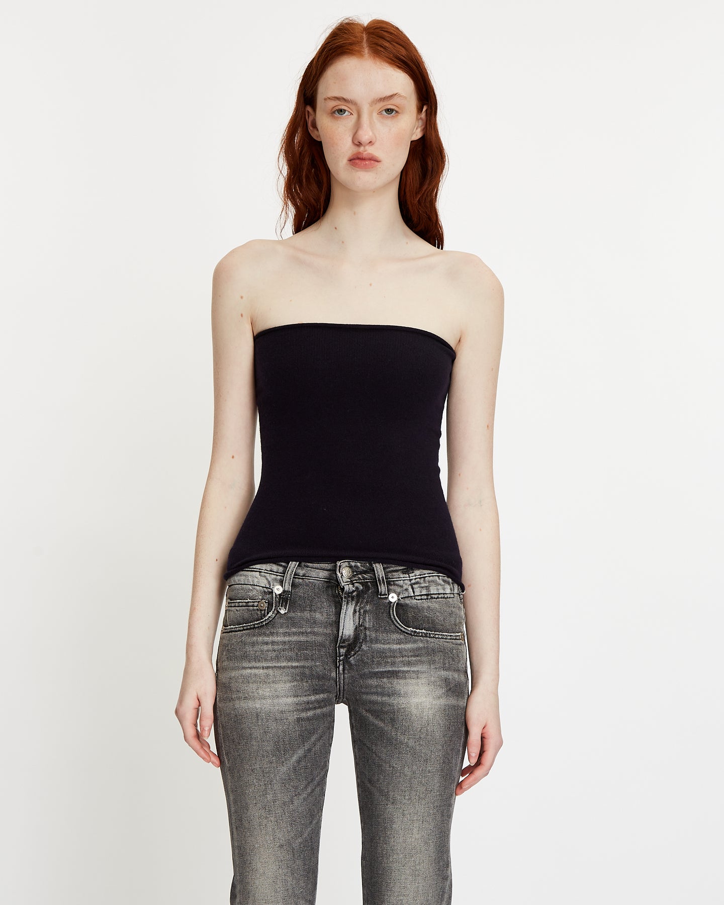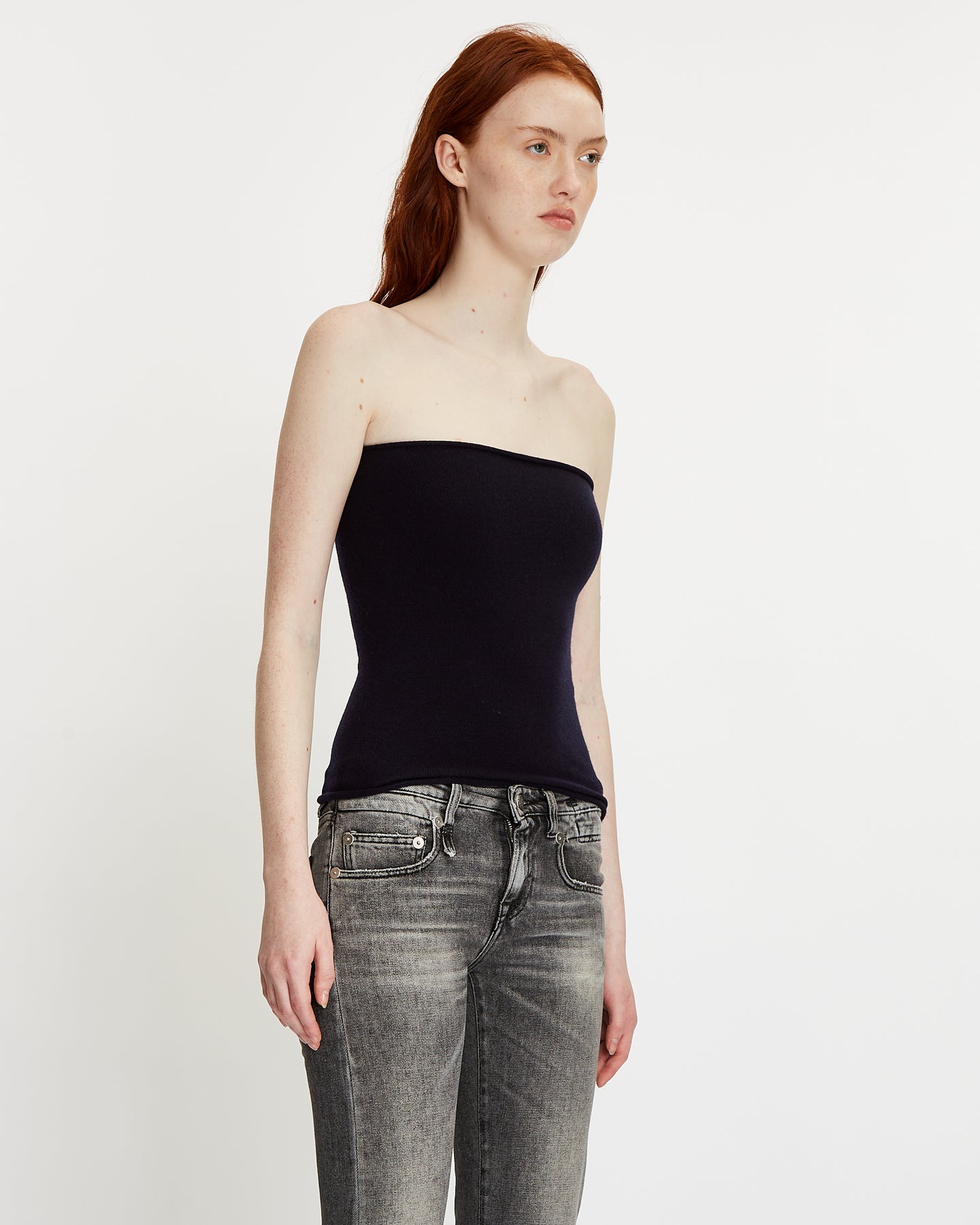 Extreme Cashmere N°08 Belt in navy features a fitted seamless silhouette. Details include rolling edges, it can be worn as an off-shoulder top, belt, skirt or layering piece.