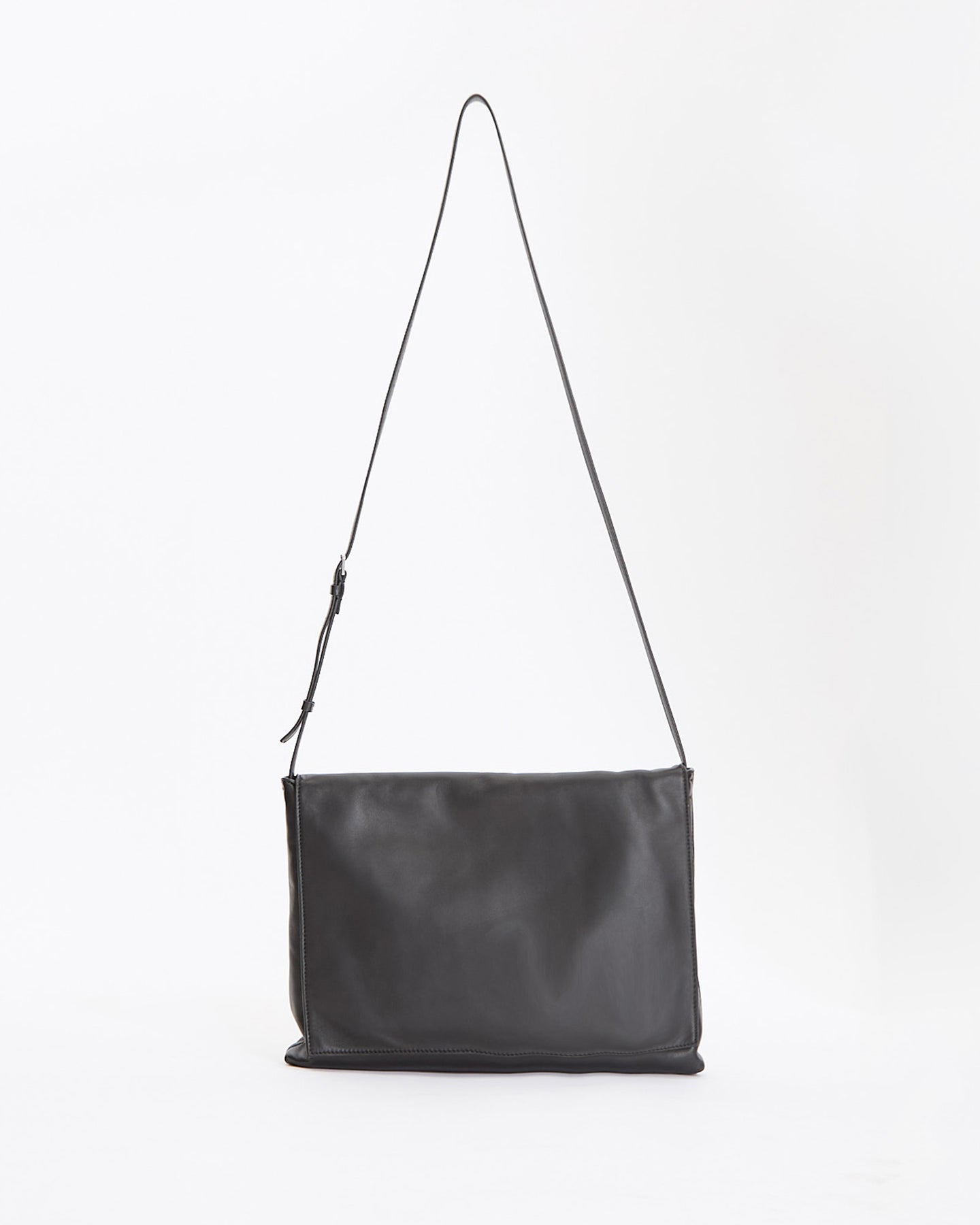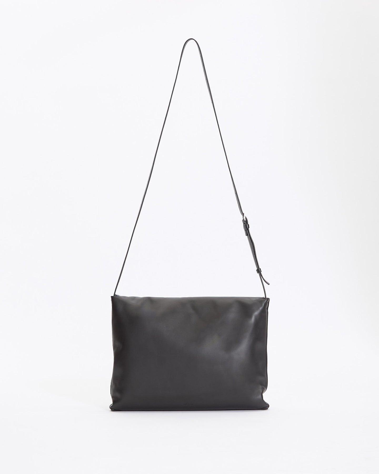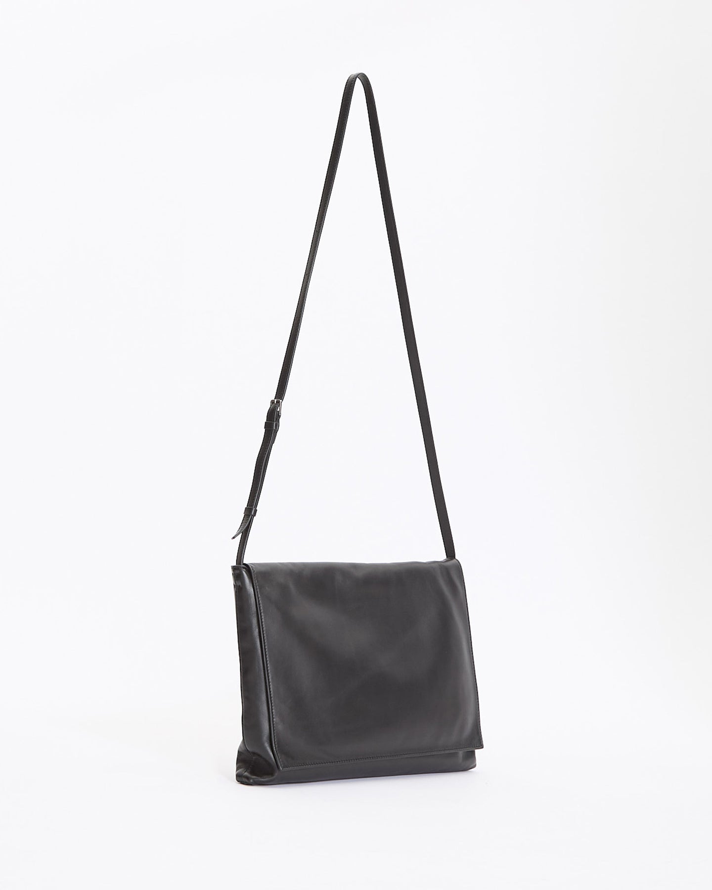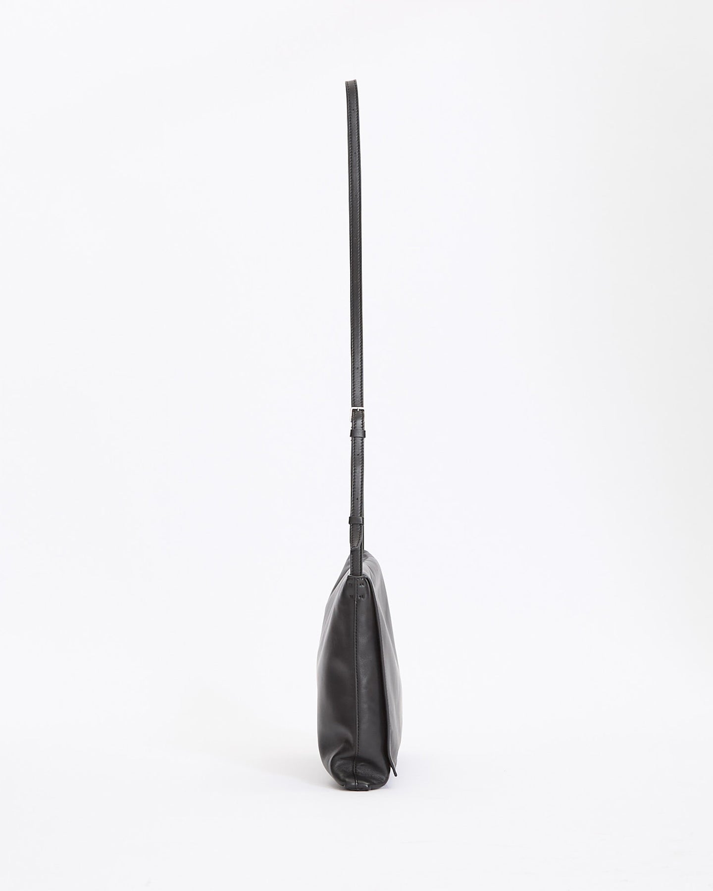 The Row Nan Messenger Bag in black features a classic messenger bag in a soft leather fabrication. Details include overlapped flap, removable interior zip pocket, and adjustable strap with metal buckle.