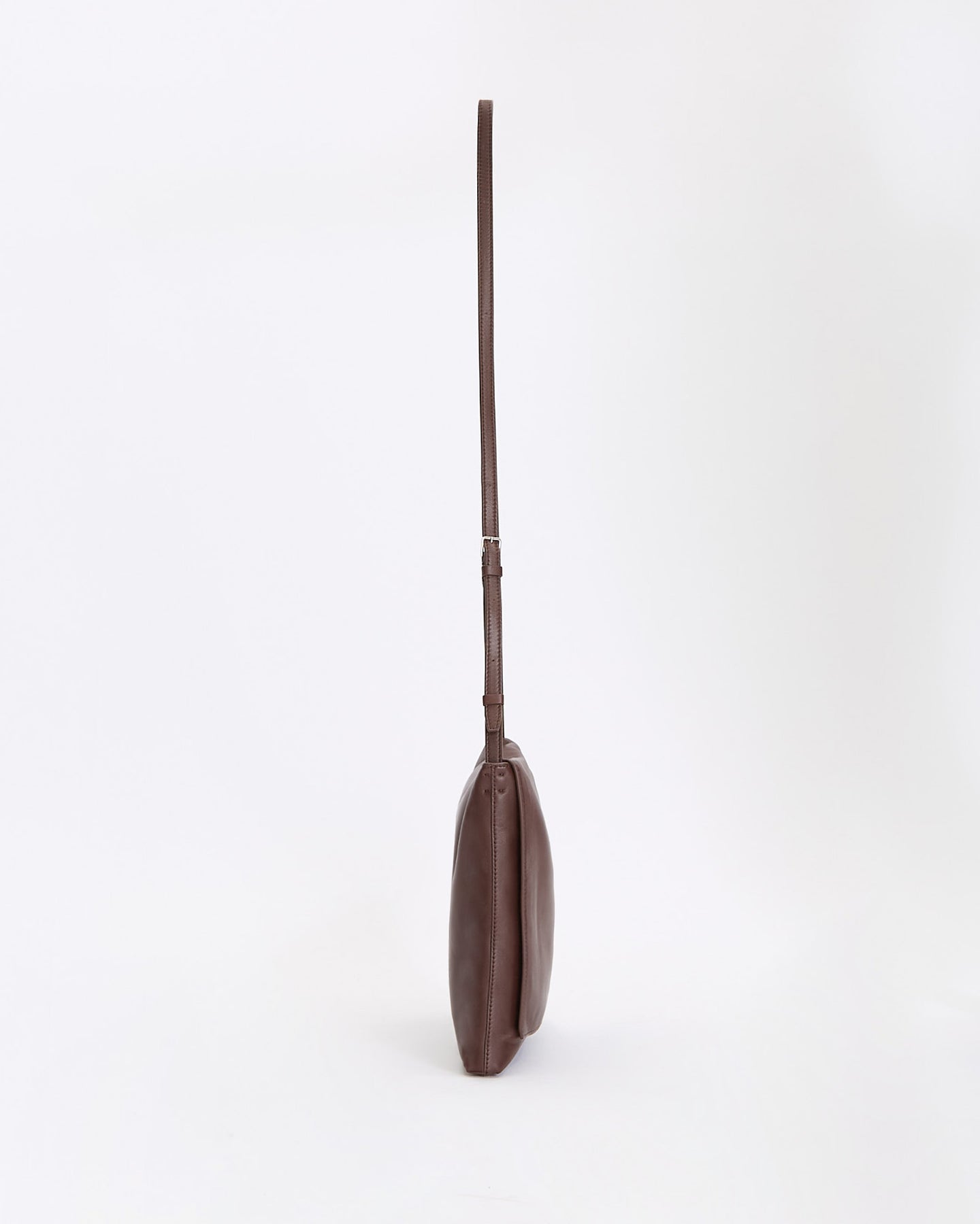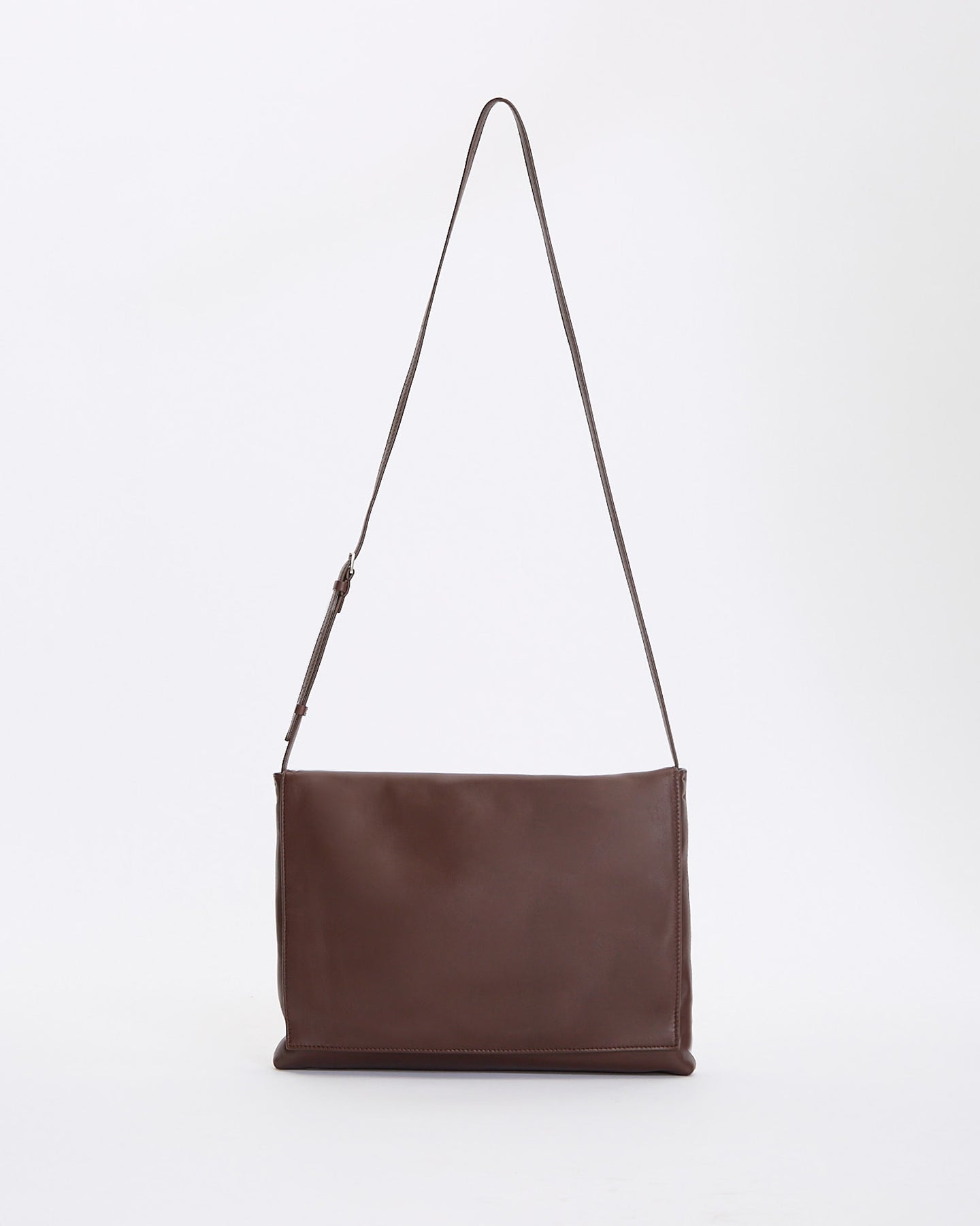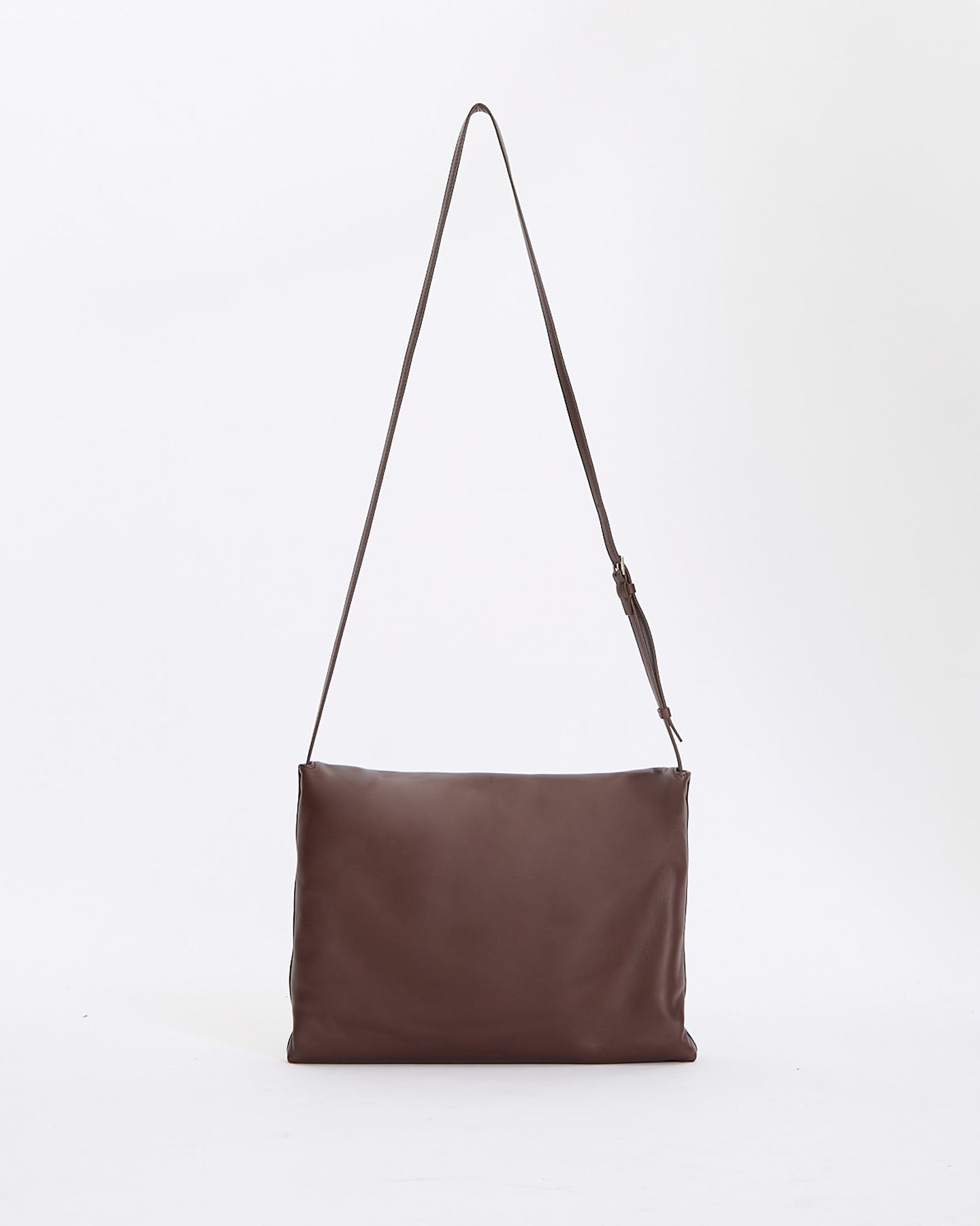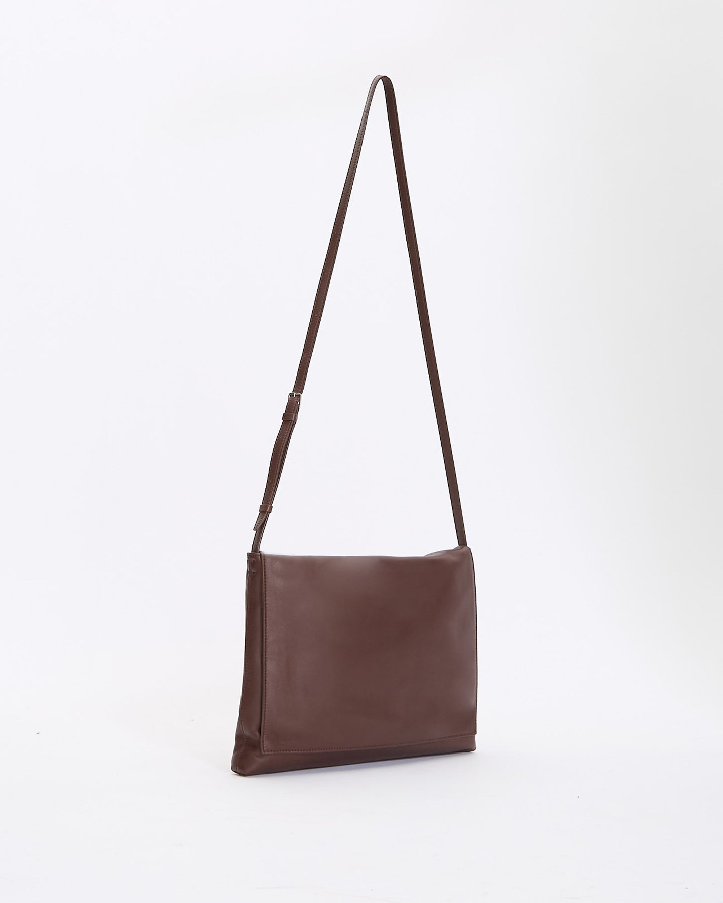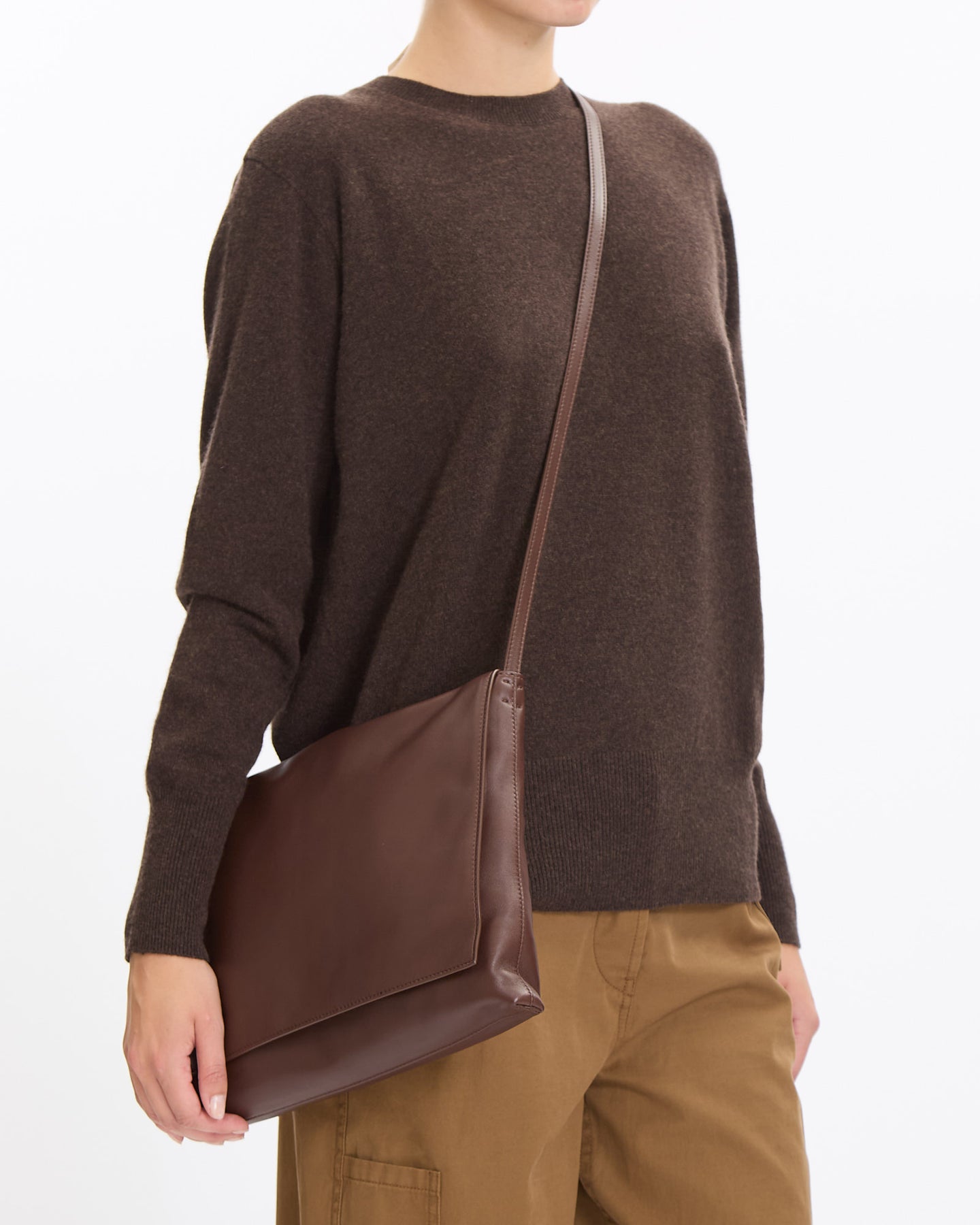 The Row Nan Messenger Bag in brown melange features a classic messenger bag in a soft durable leather fabrication. Details include overlapped flap, removable interior zip pocket, and adjustable strap with metal buckle.