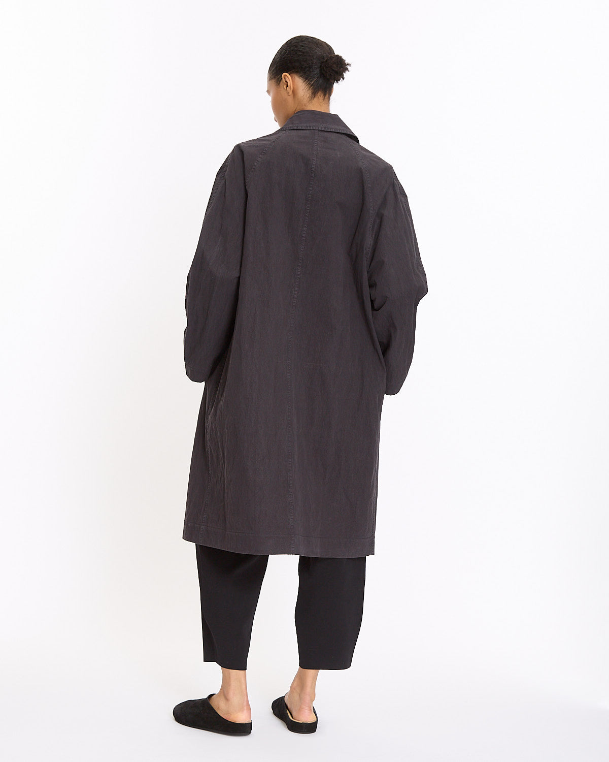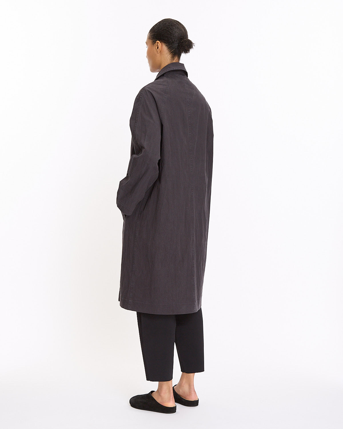 Studio Nicholson Nevis Trench in dark navy features a long silhouette in a crisp hand. Details include concealed button placket and front button closures.