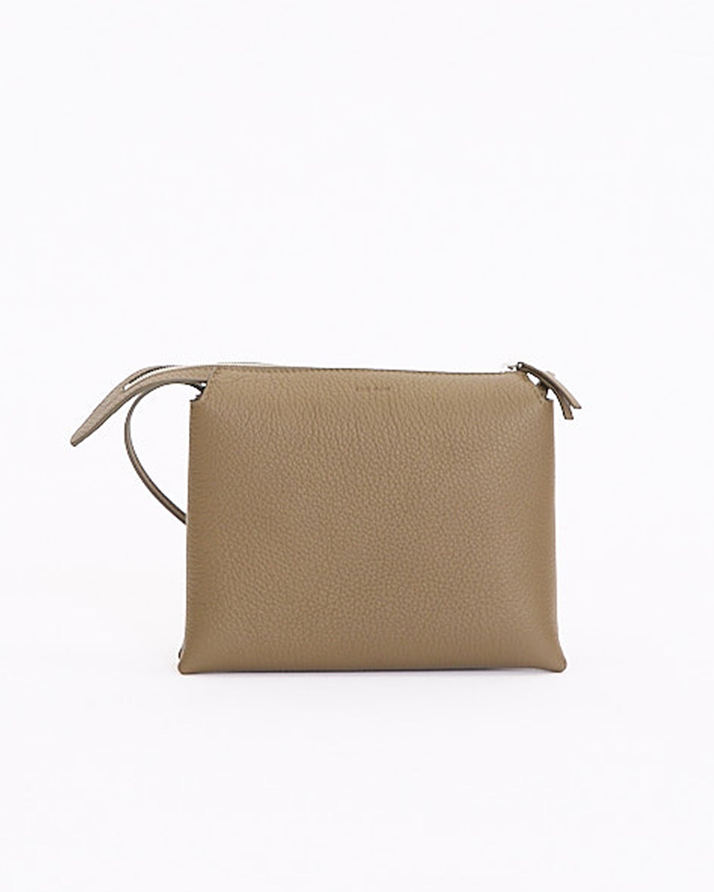 The Row Nu Mini Twin in military olive features smooth calfskin leather with seamless construction, removable adjustable shoulder strap and zip top closure.