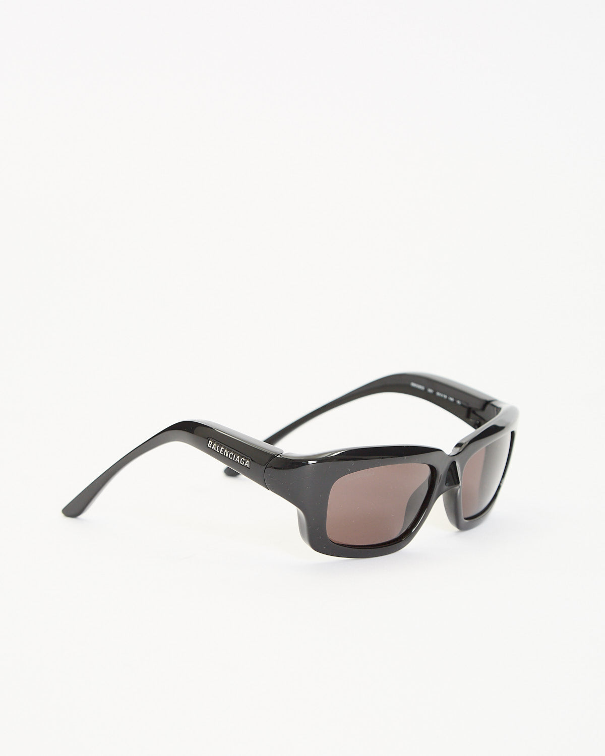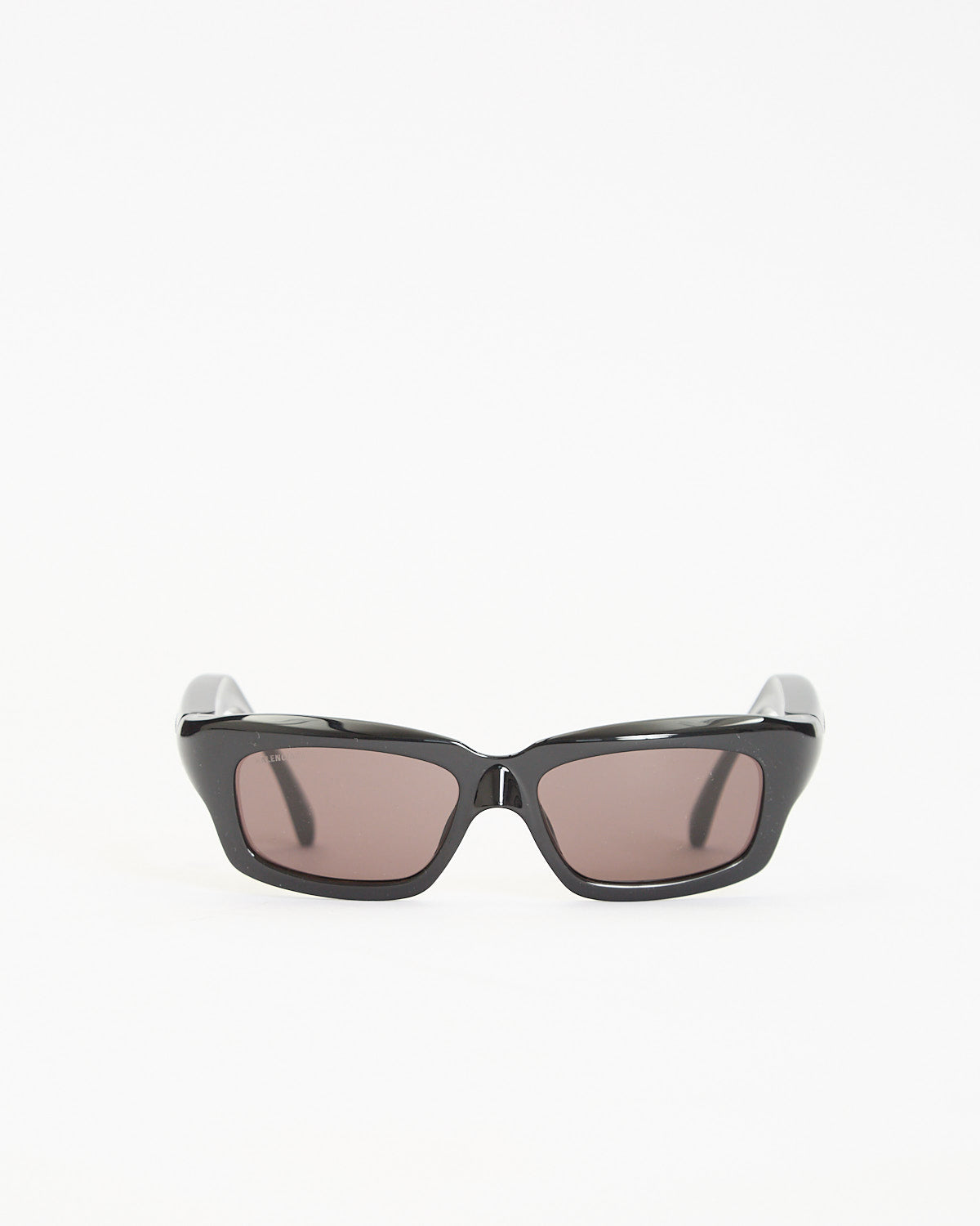 Balenciaga Orbit Rectangle Sunglasses in black feature a sharp rectangular frame. Details include tinted lenses, curved arms, and subtle logo detailing at frames.