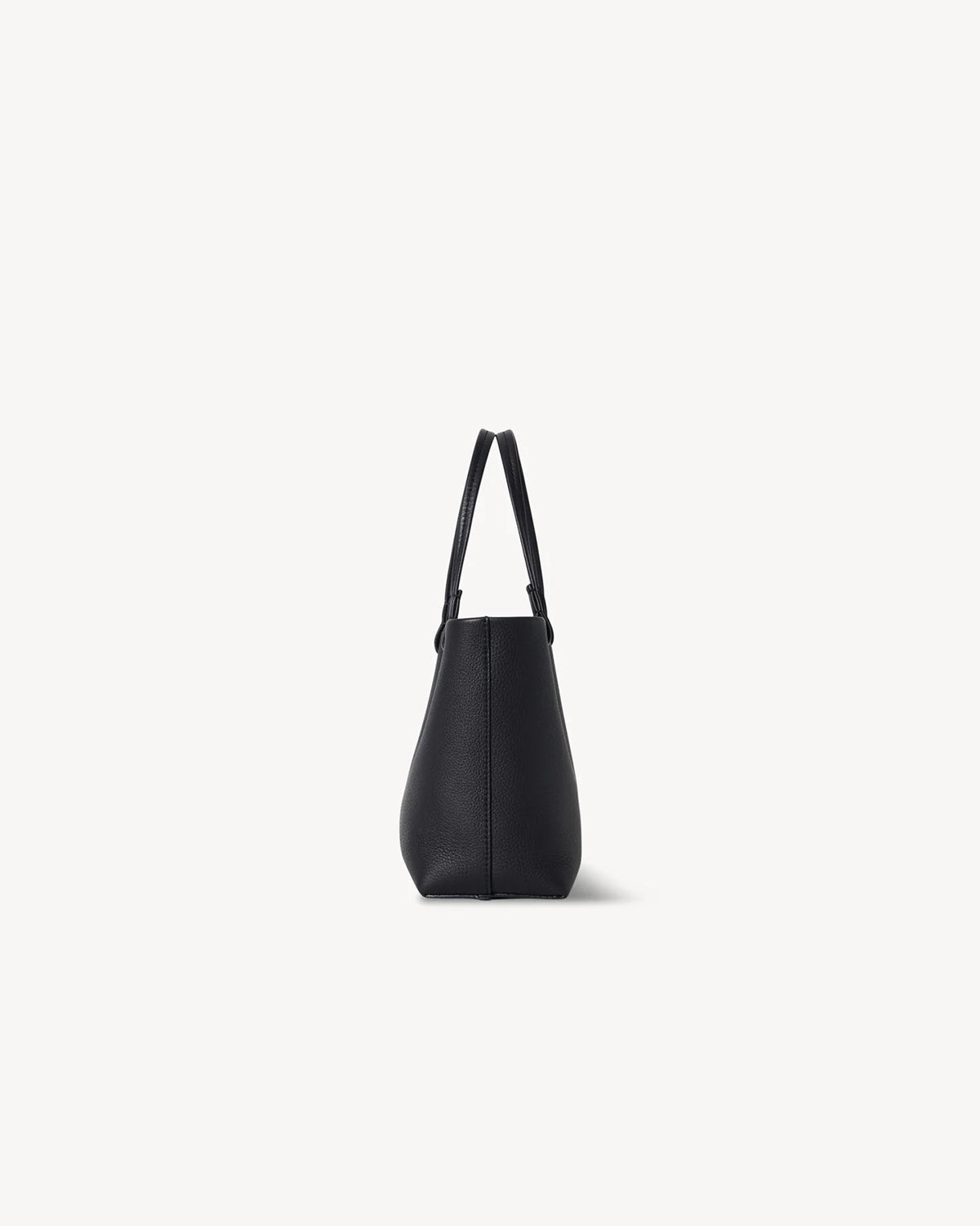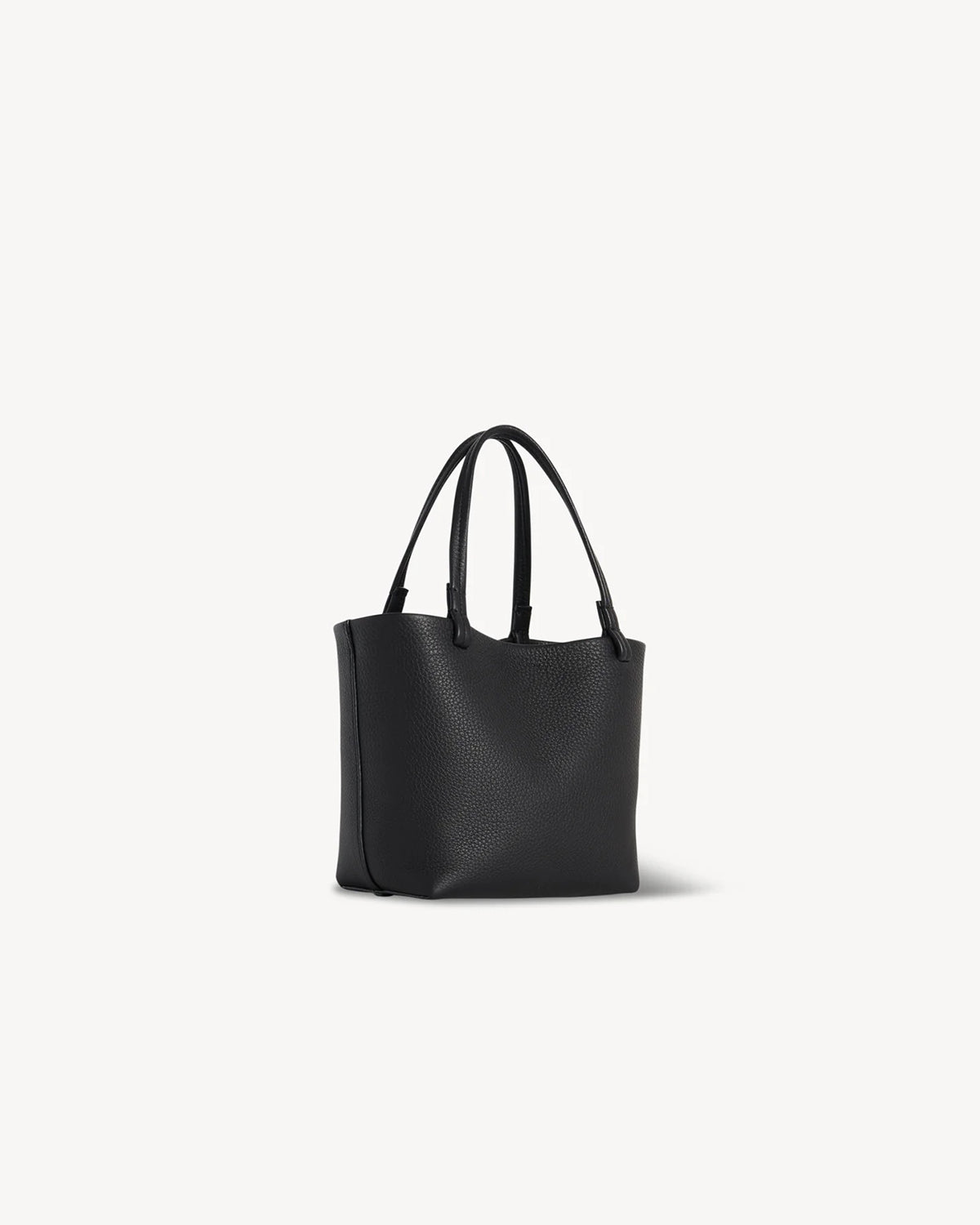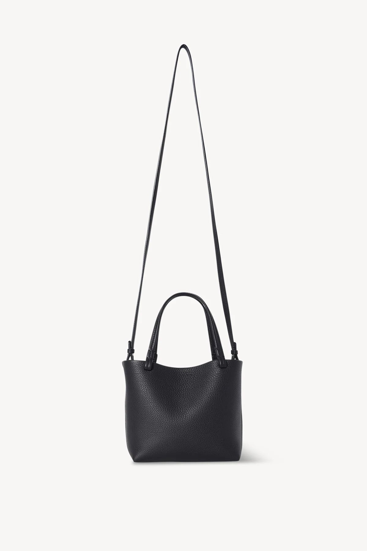 The Row Park Tote Small in midnight features a small tote silhouette in grained calfskin leather with interior toggle closure and flat handles.