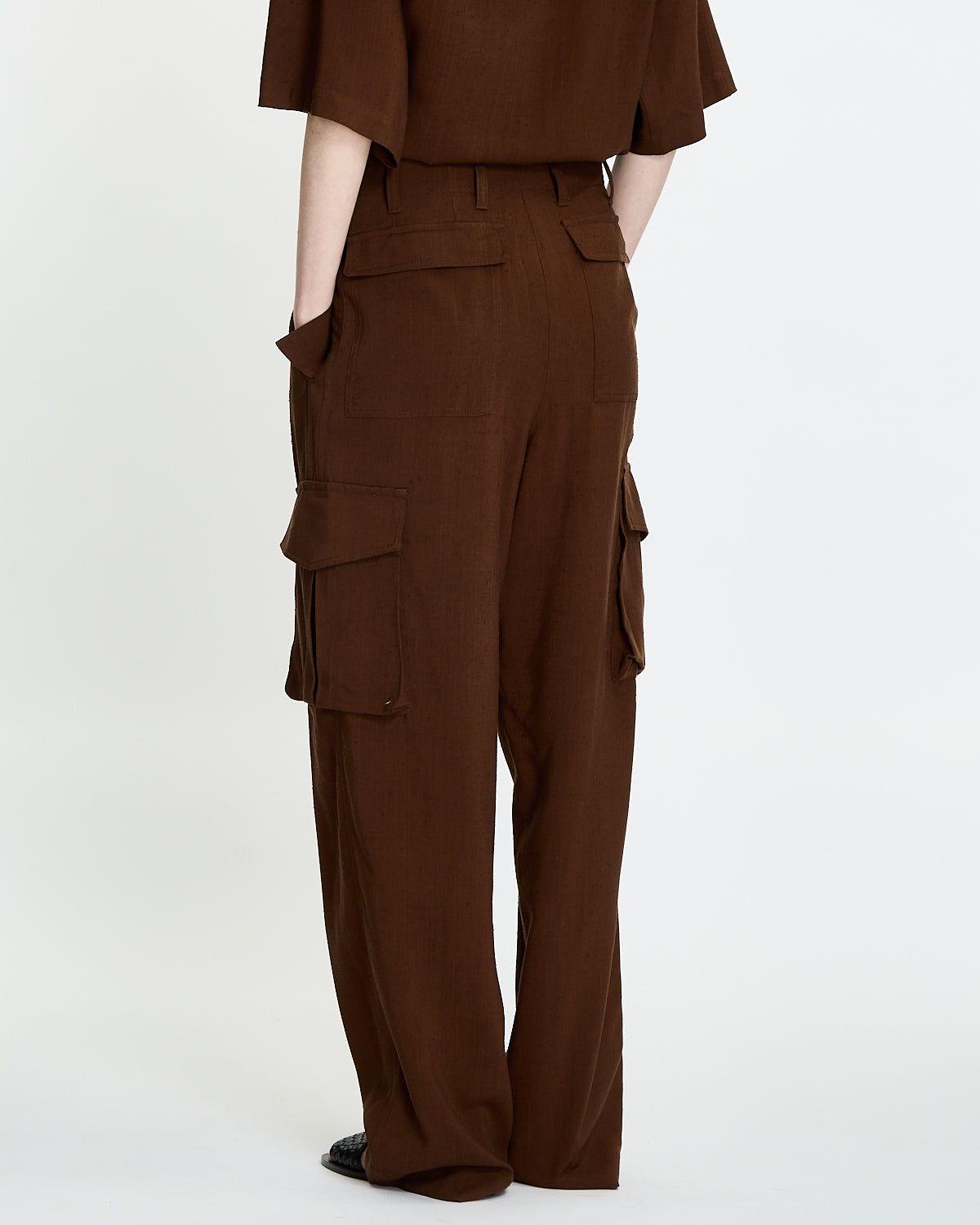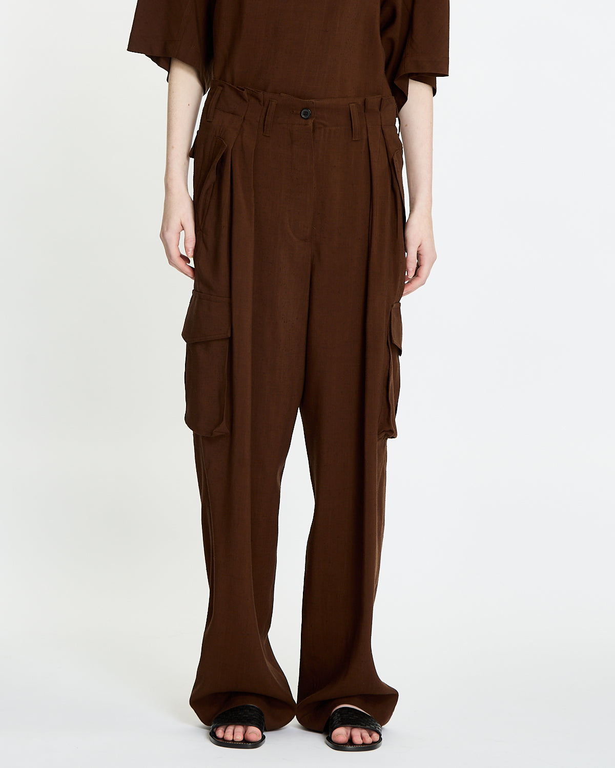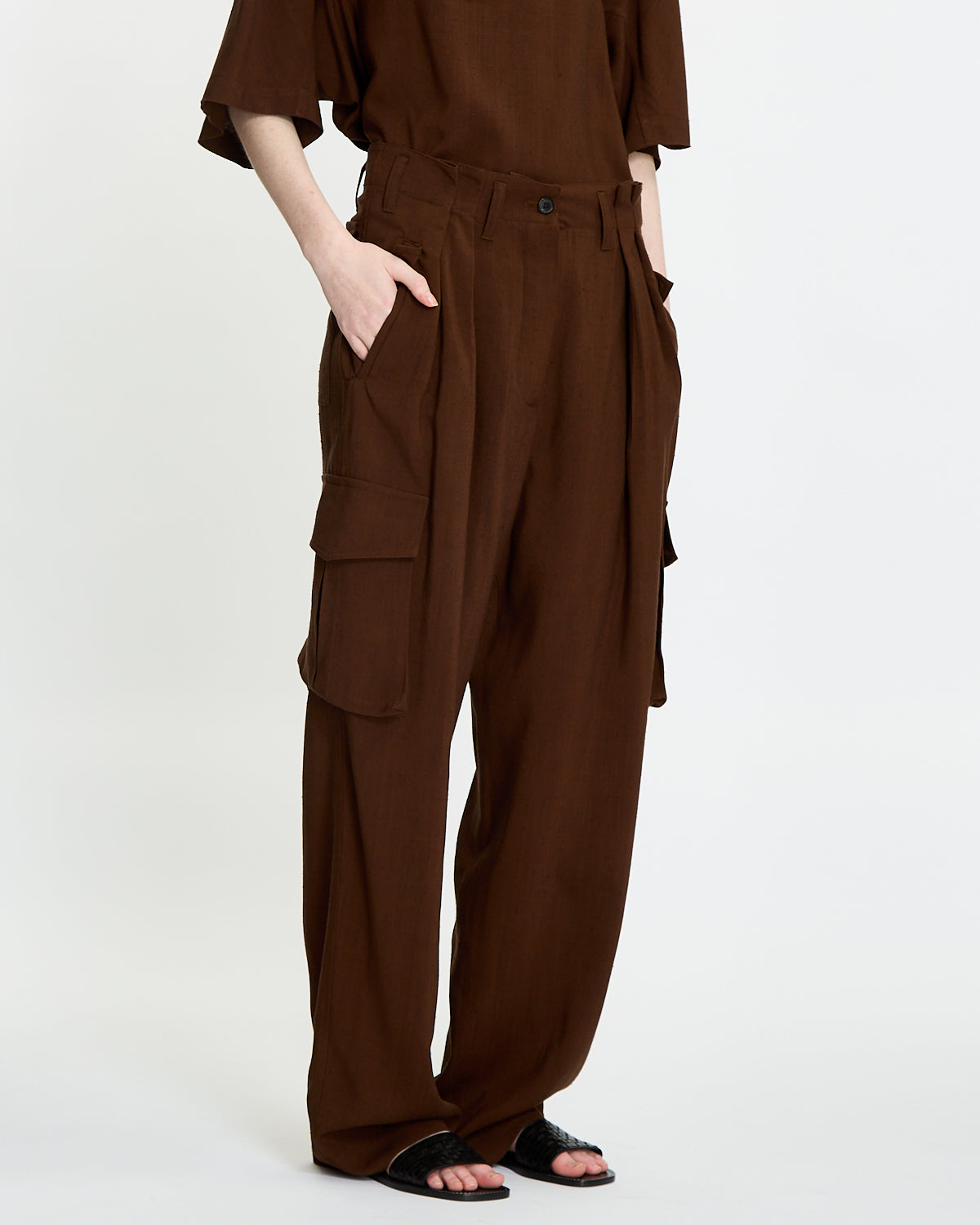 Dries Van Noten Polkar Pants in brown features a wide silhouette. Details include front pleats, cargo pockets and slub viscose fabrication.