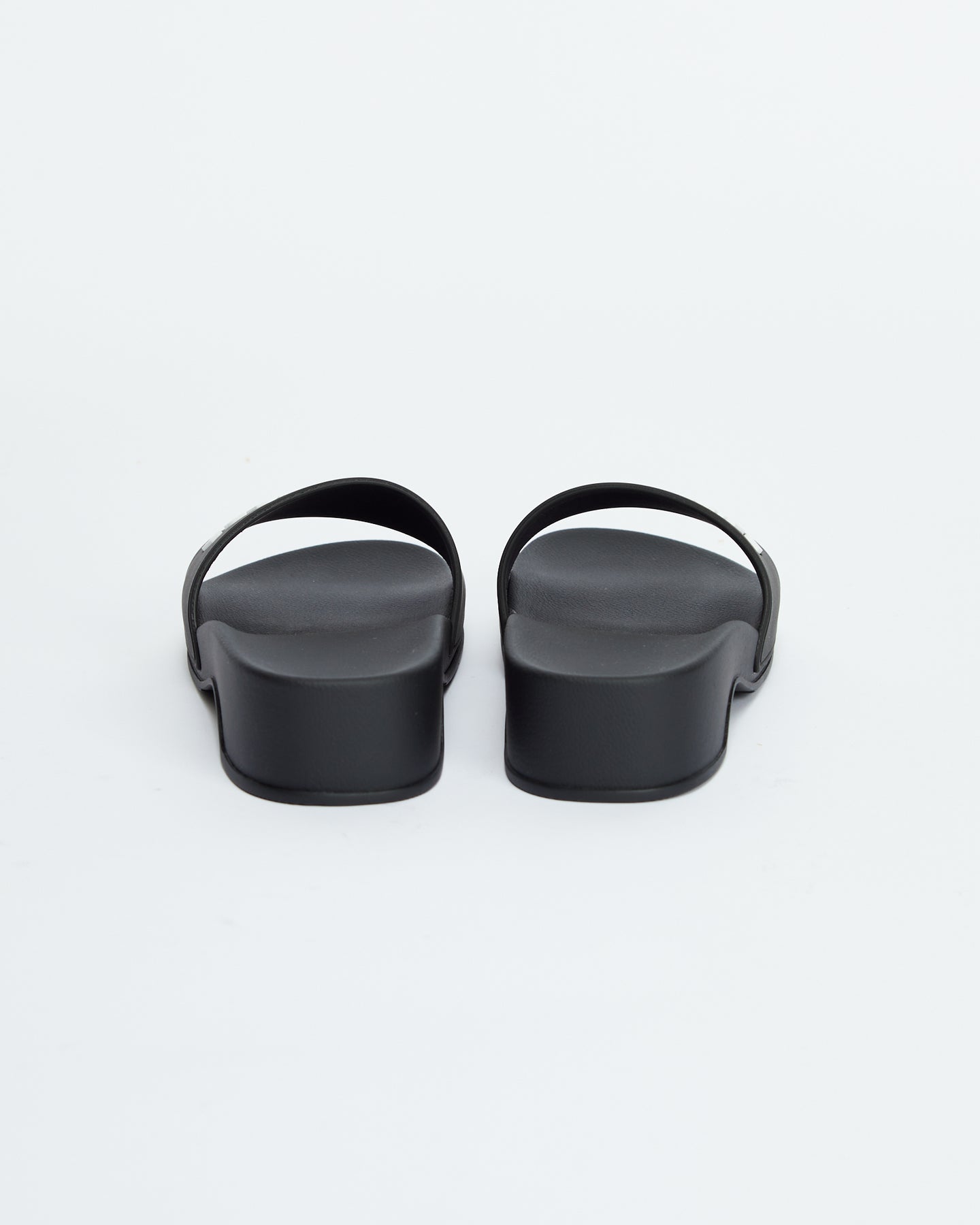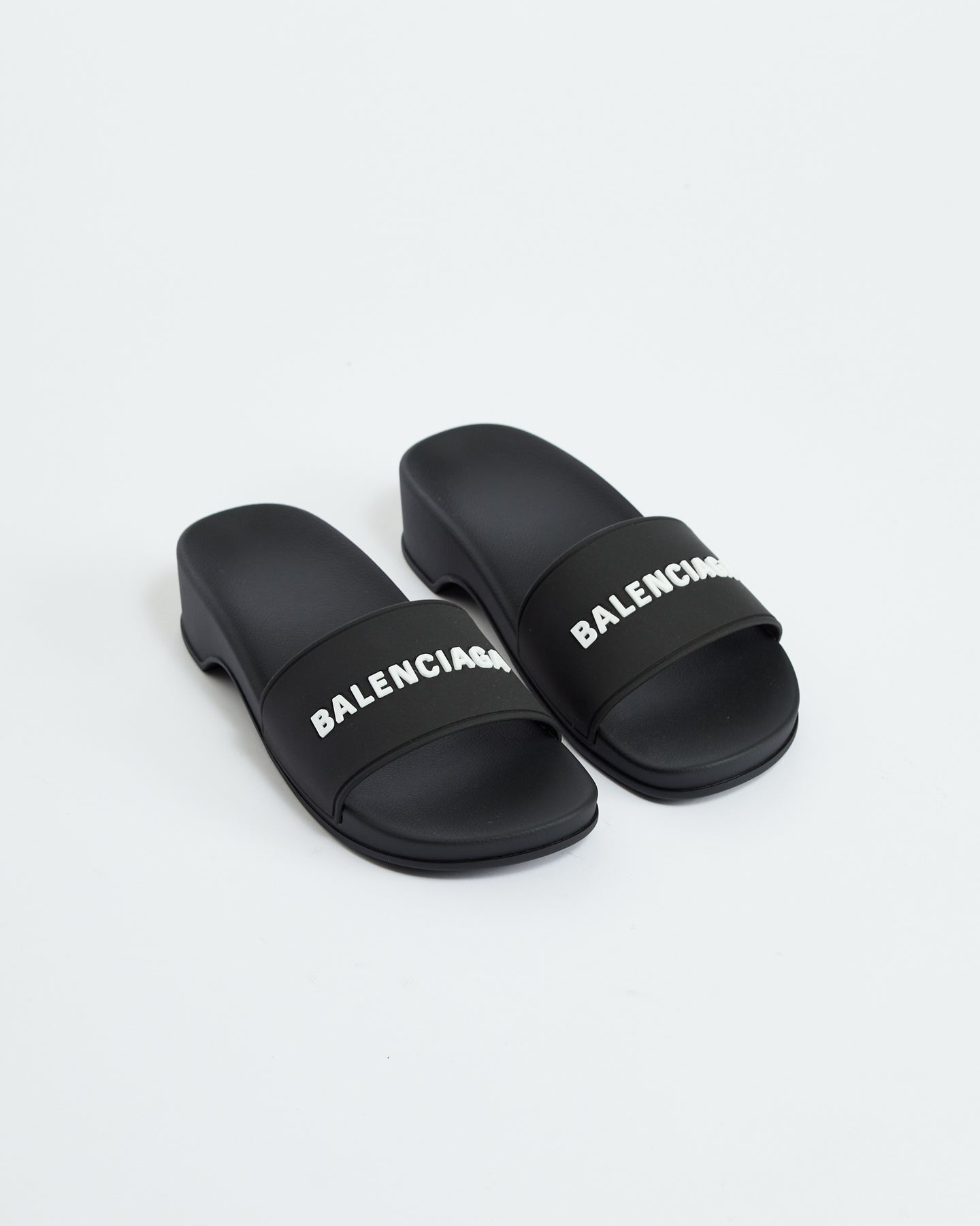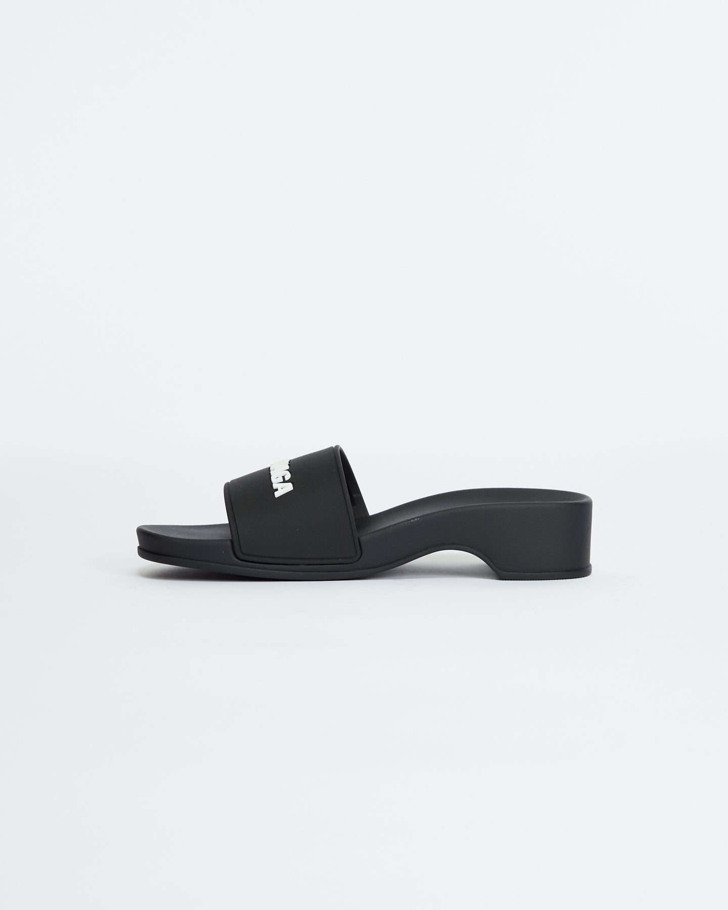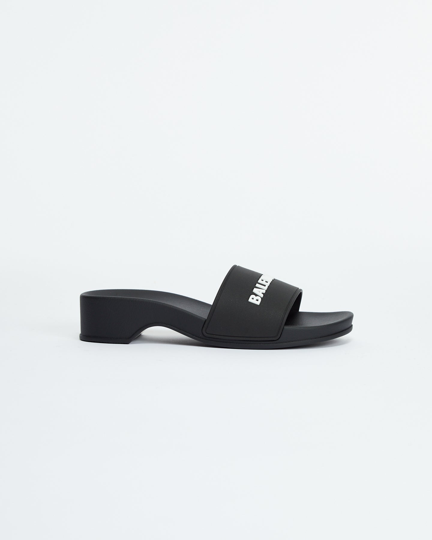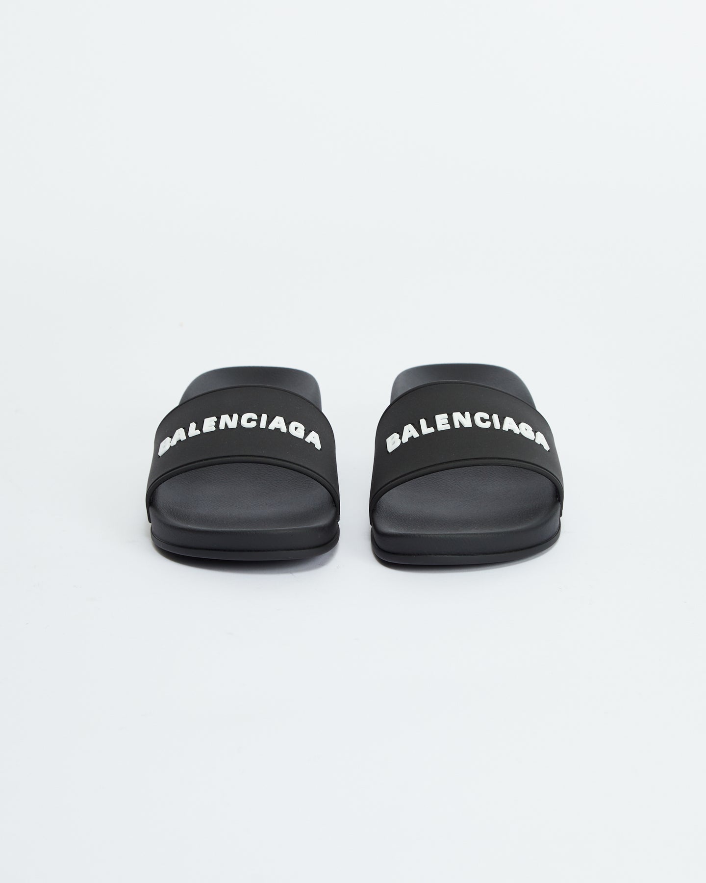 Balenciaga Pool Clog in black features molded rubber footbeds, 3D Balenciaga logo on the strap and embossed Balenciaga logo at back.