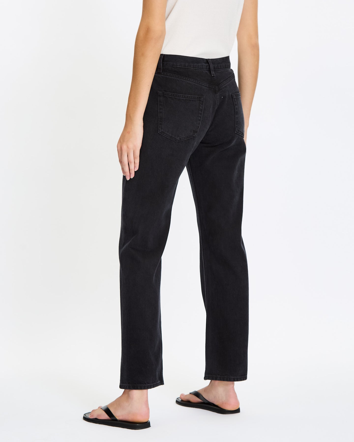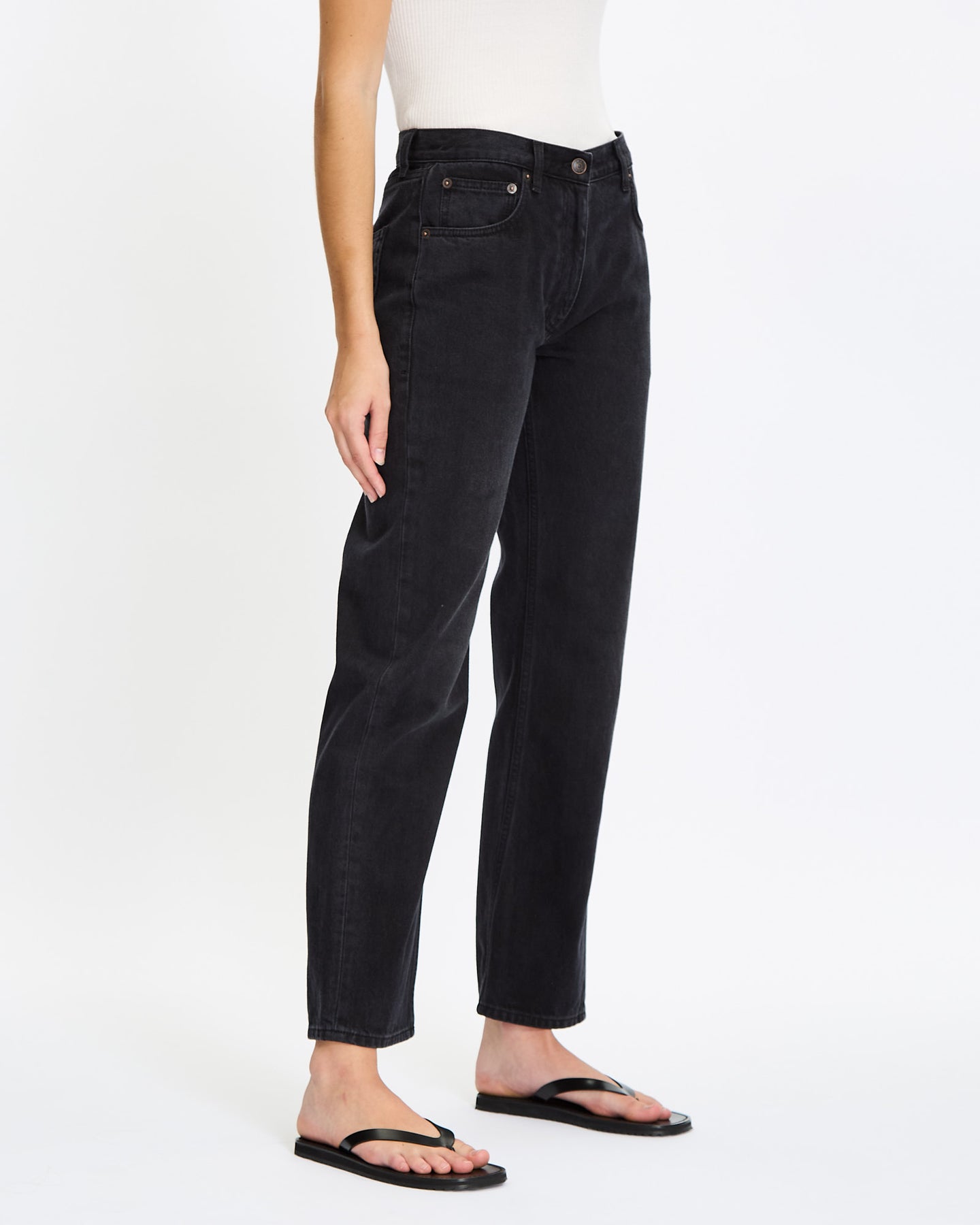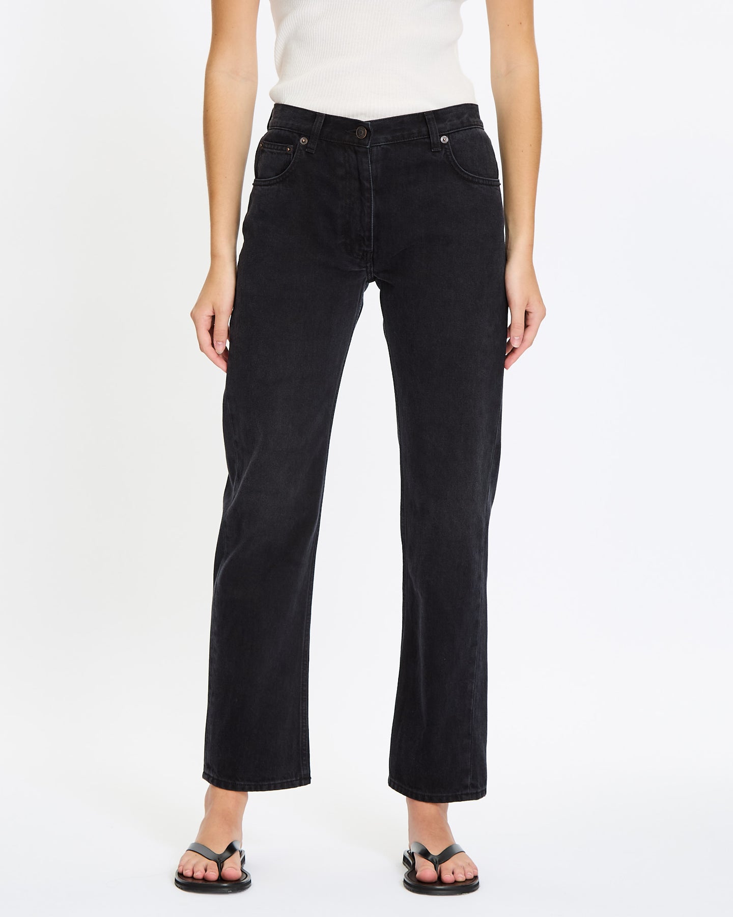 The Row Ryley Jean in black features low-rise fit. Details include cotton denim with regular fit, straight leg, and classic 5-pocket construction.