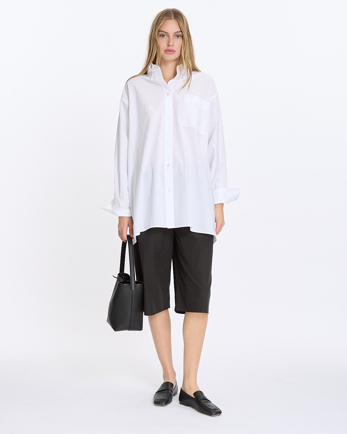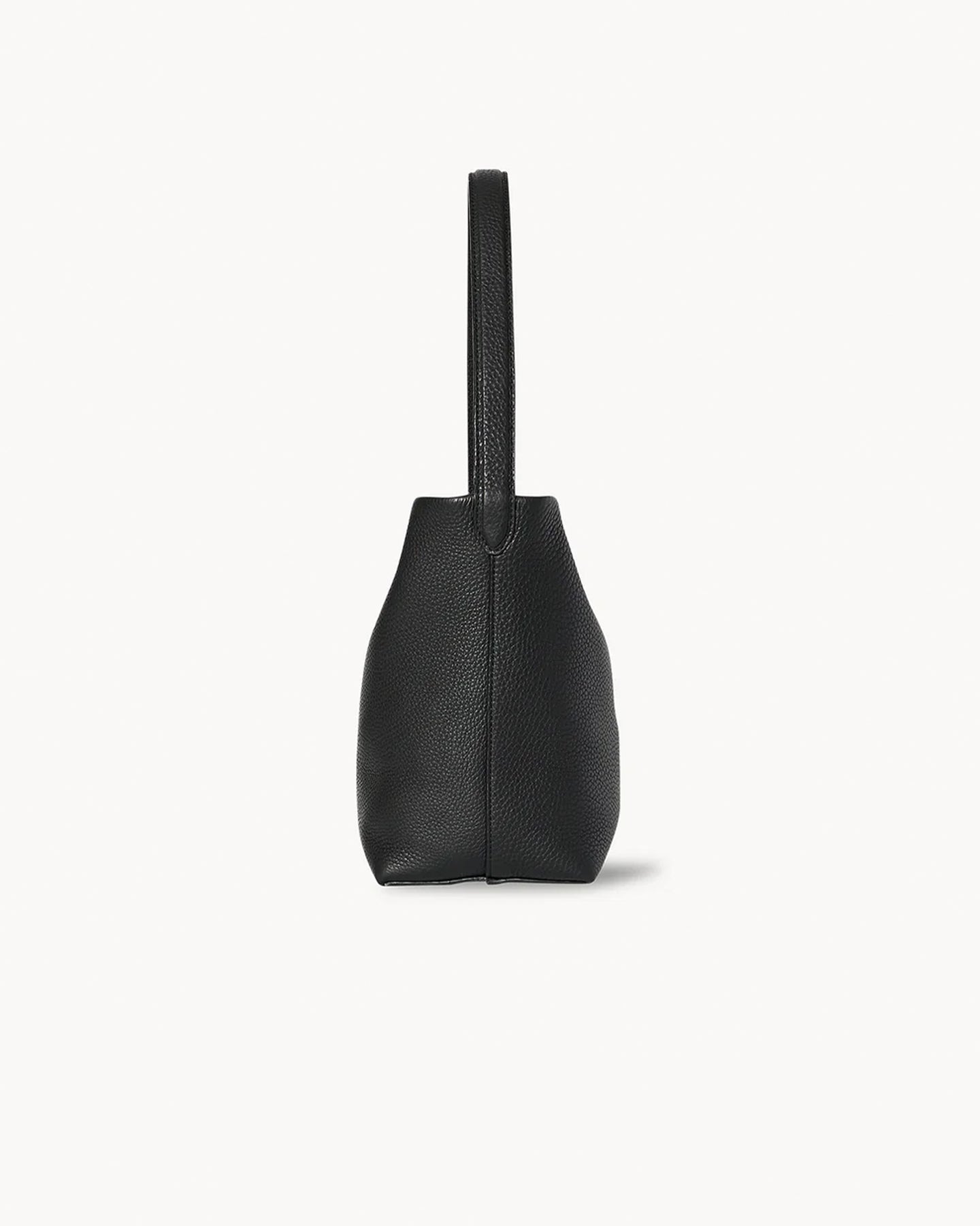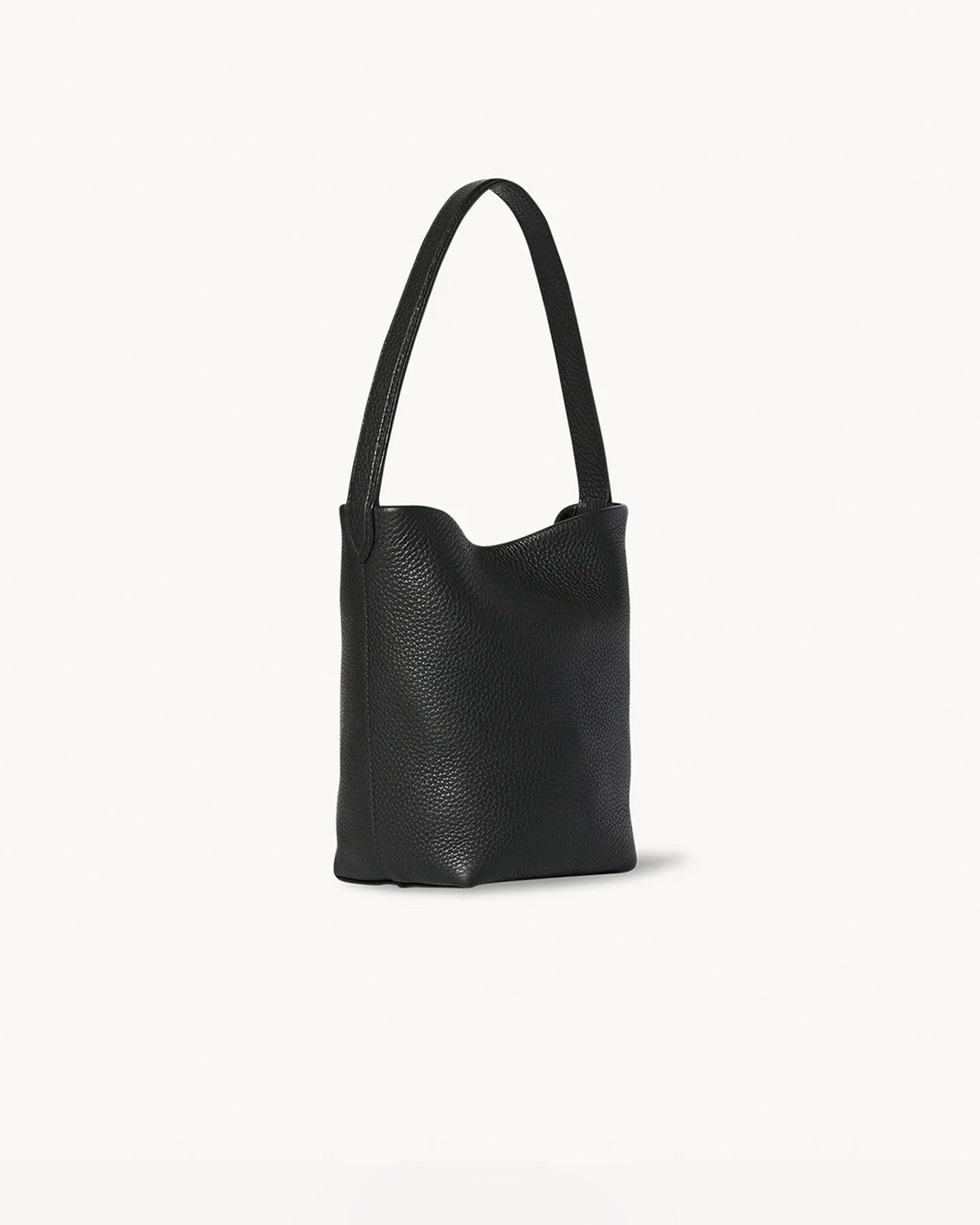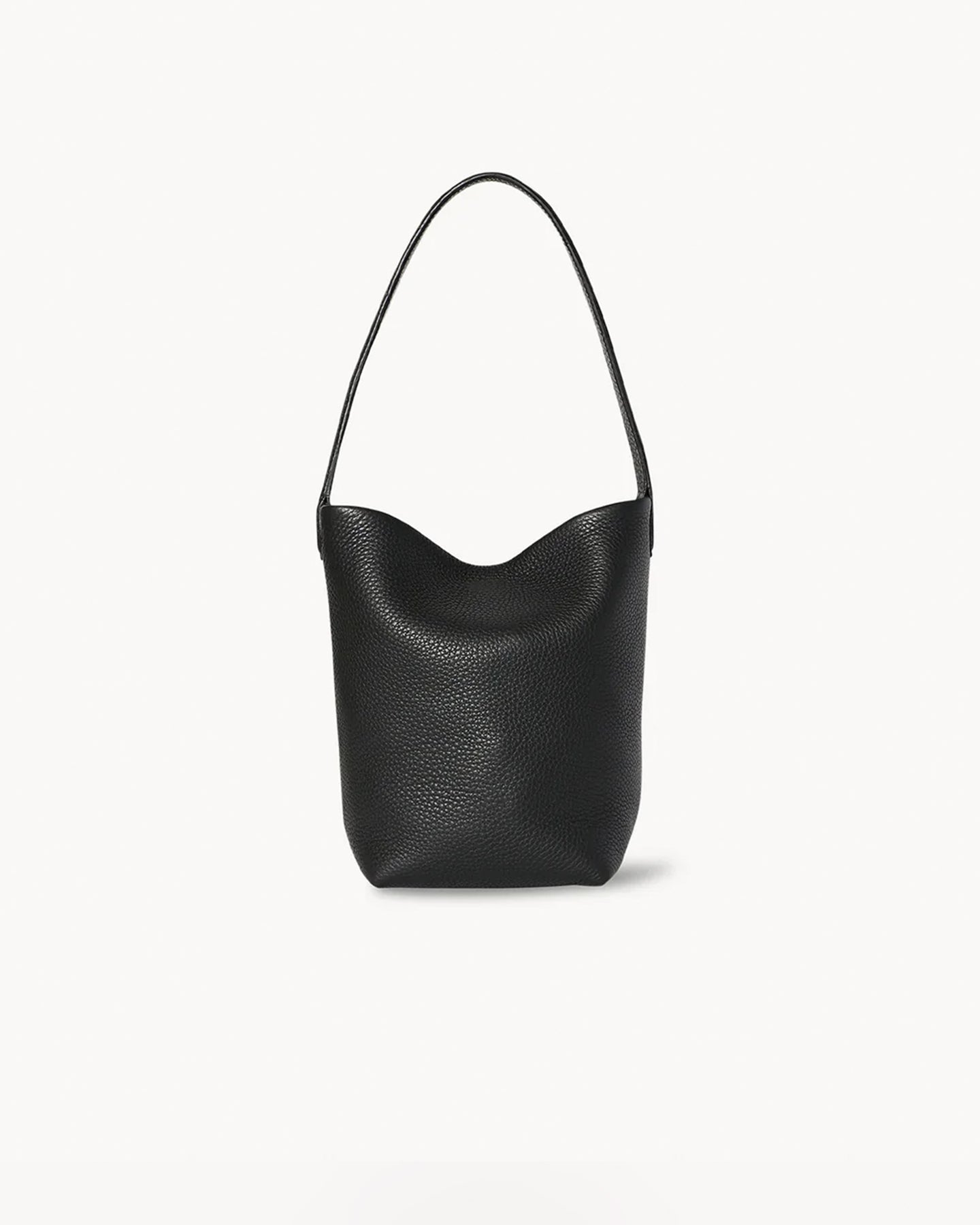 The Row Small N/S Park Tote in black features a classic tote bag shape in grained calfskin leather with interior toggle closure and flat handle.