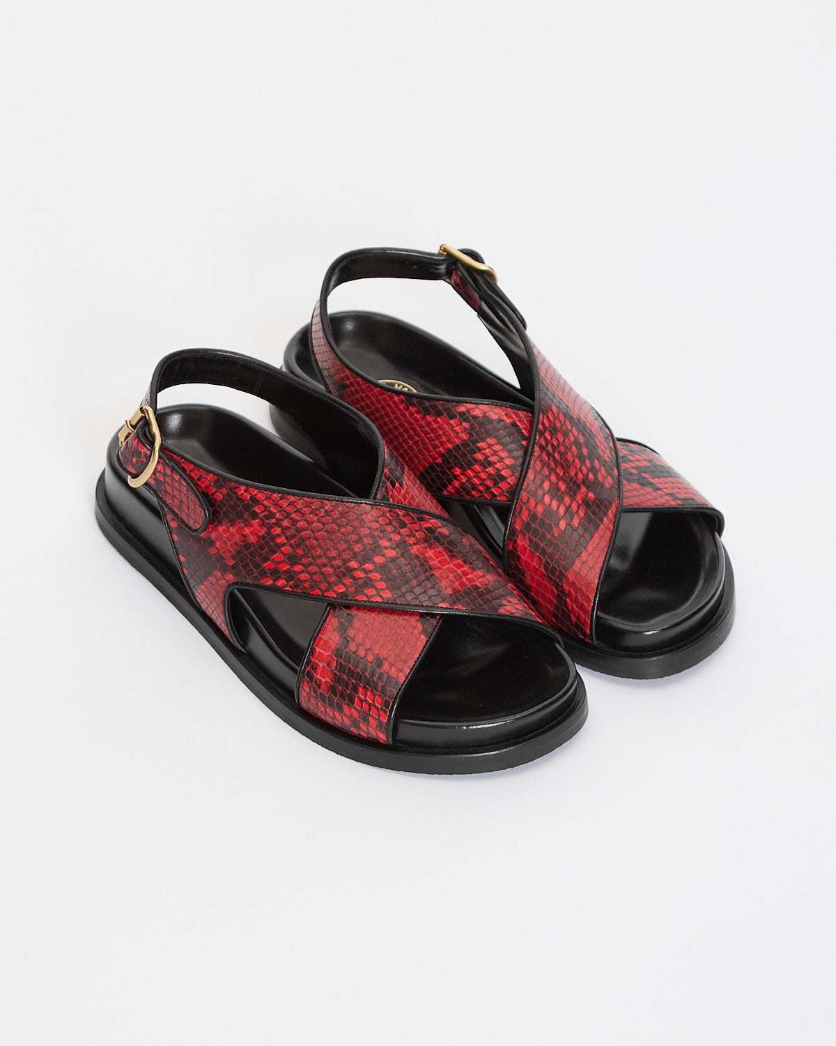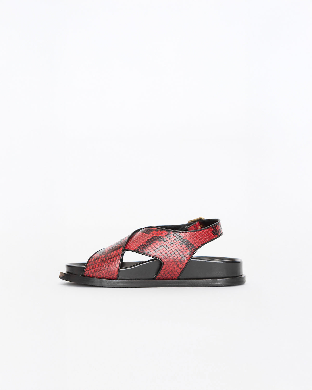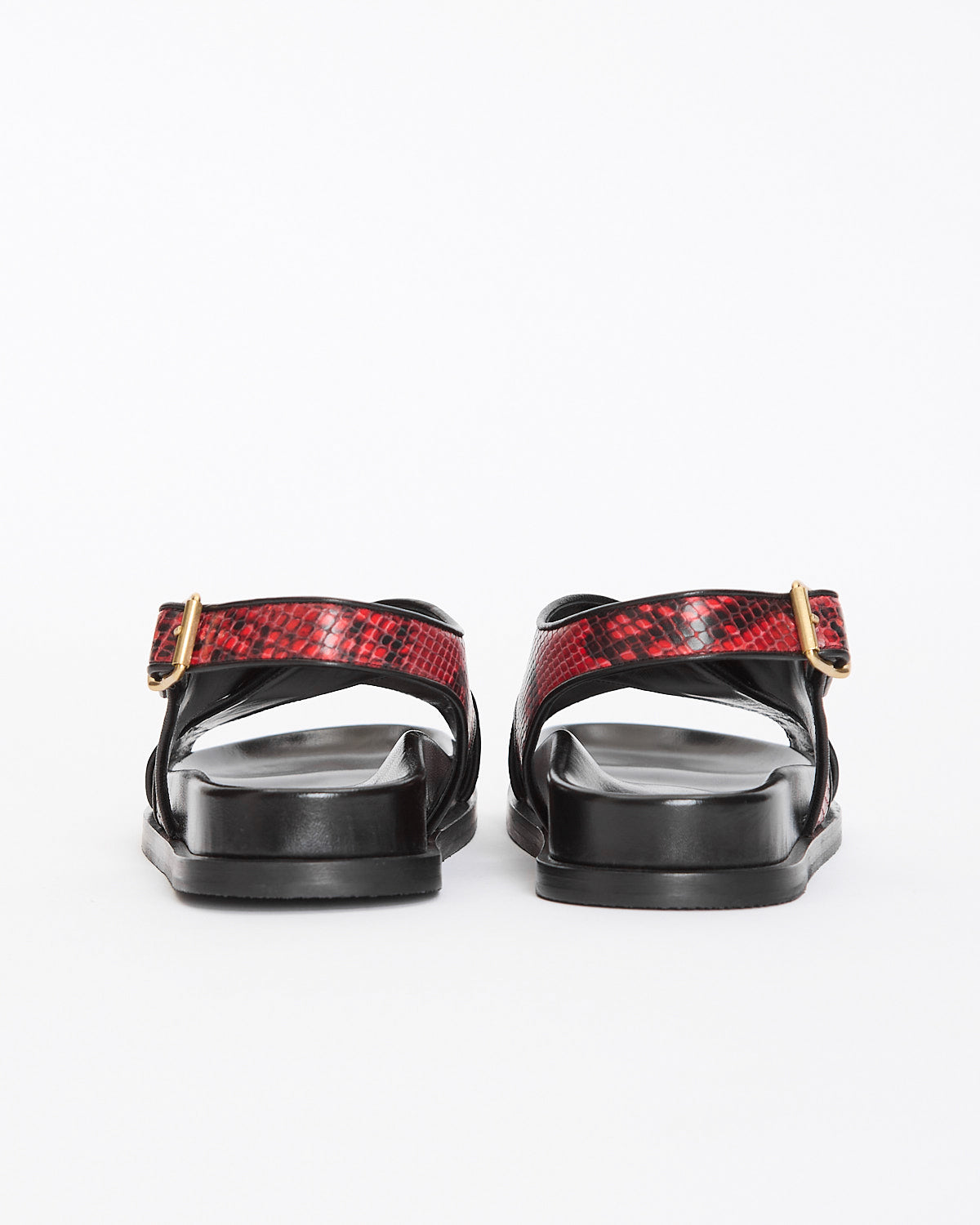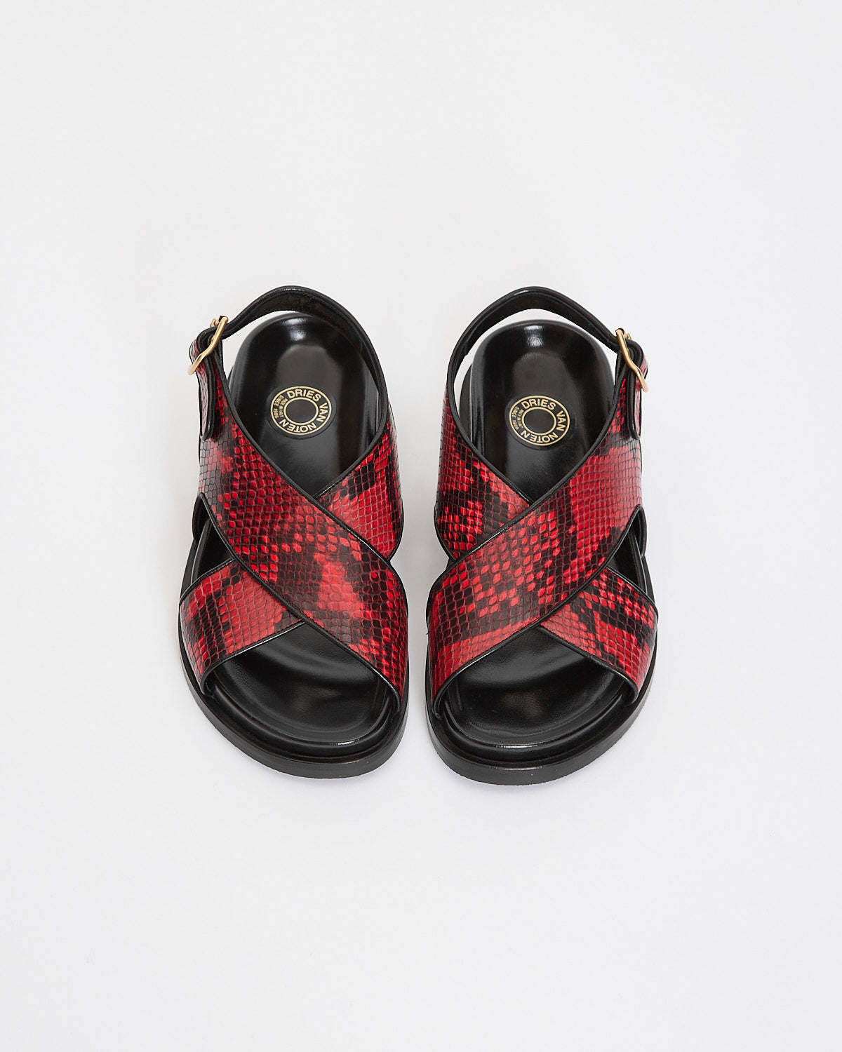 Dries Van Noten Snake Print Sandal in red/black features a fussbett sandal silhouette in molded nappa leather. Details include buckle fastening and rubber sole.