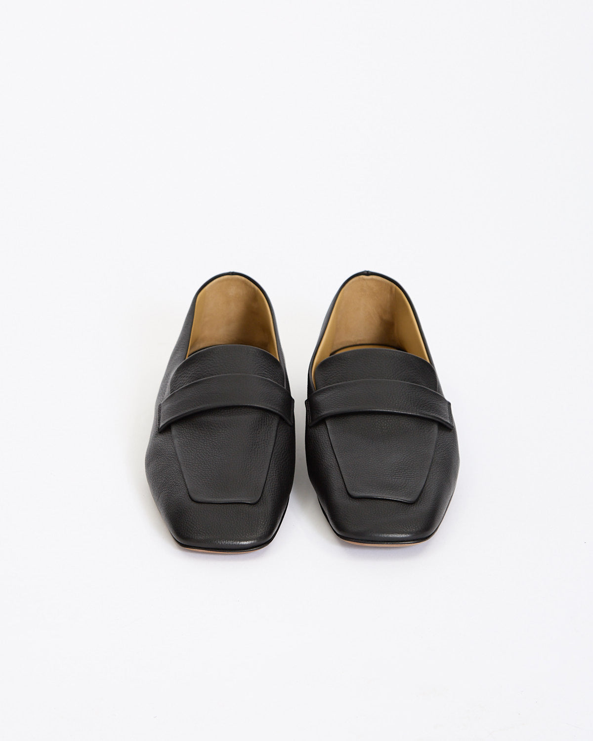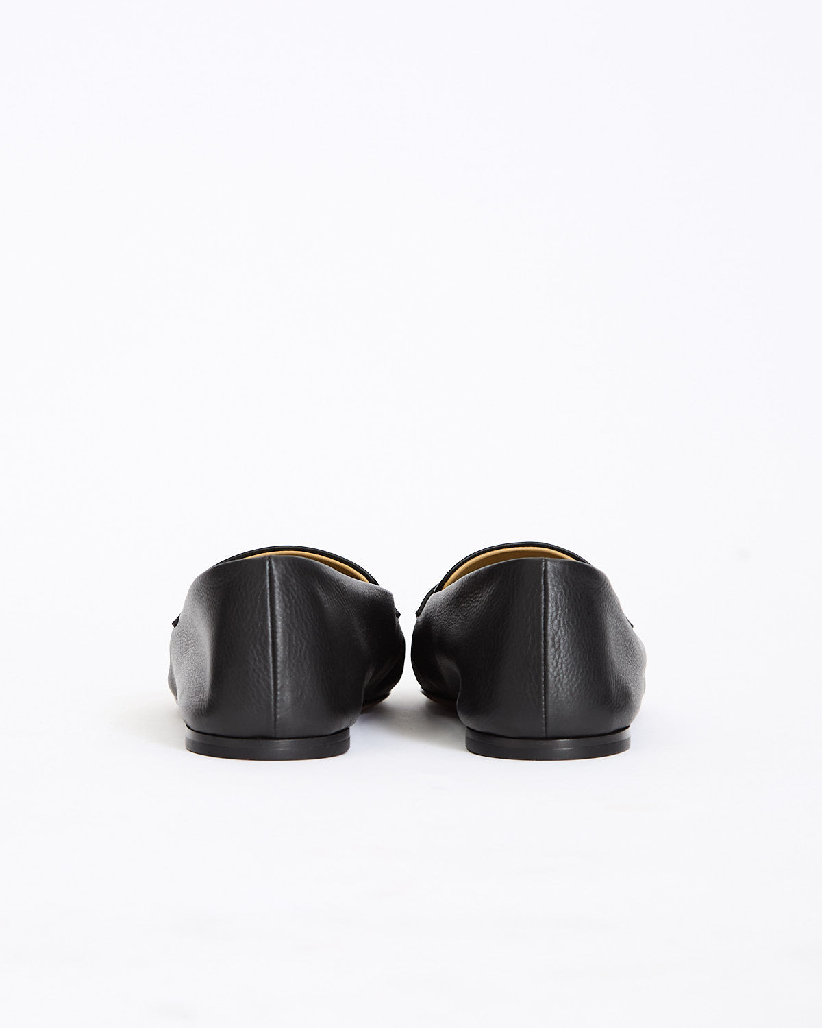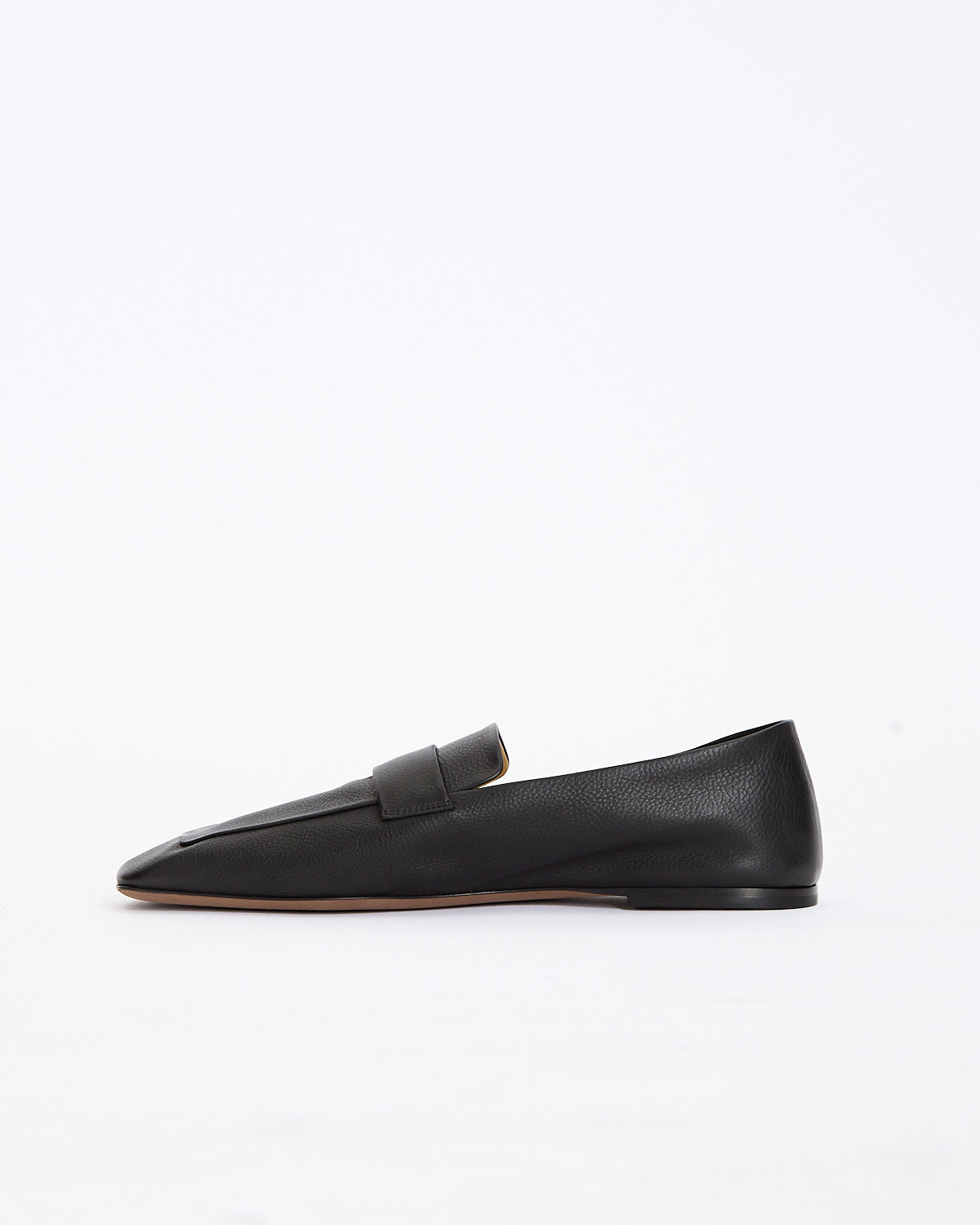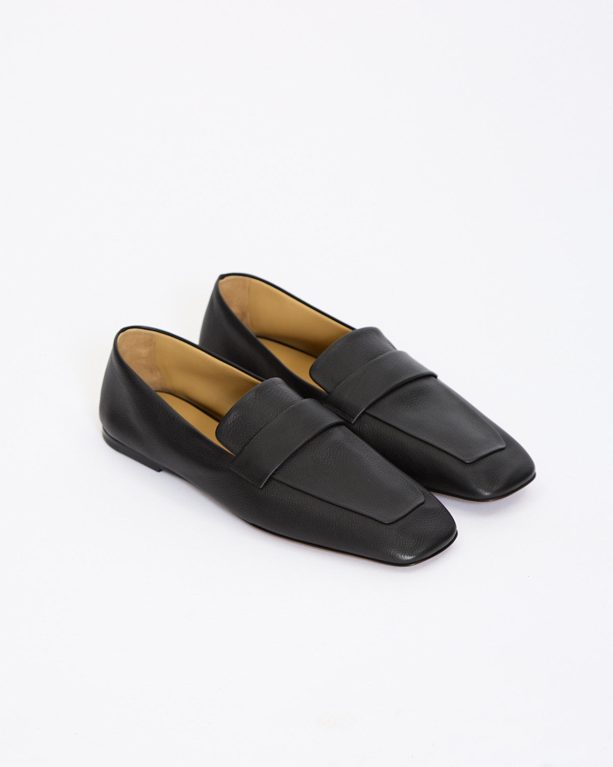The Row Square Loafer in black features a minimal loafer design in a grained leather fabrication. Details include square toe, stitched strap and full leather sole.