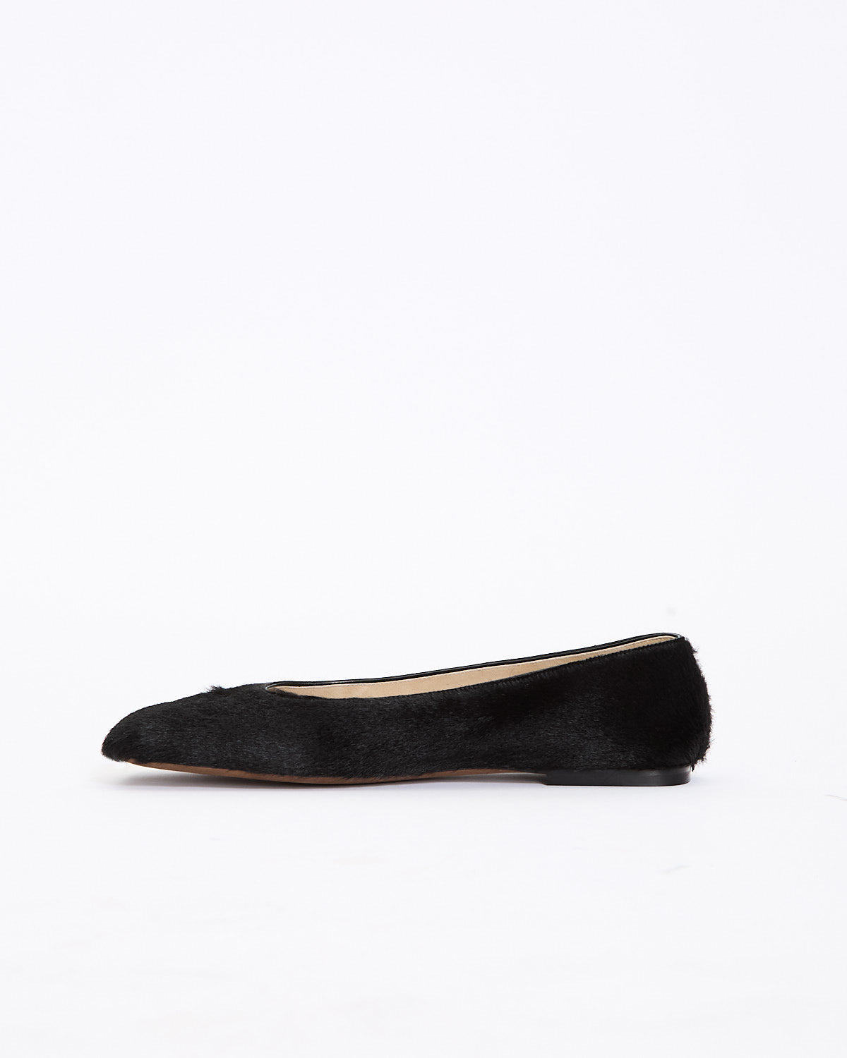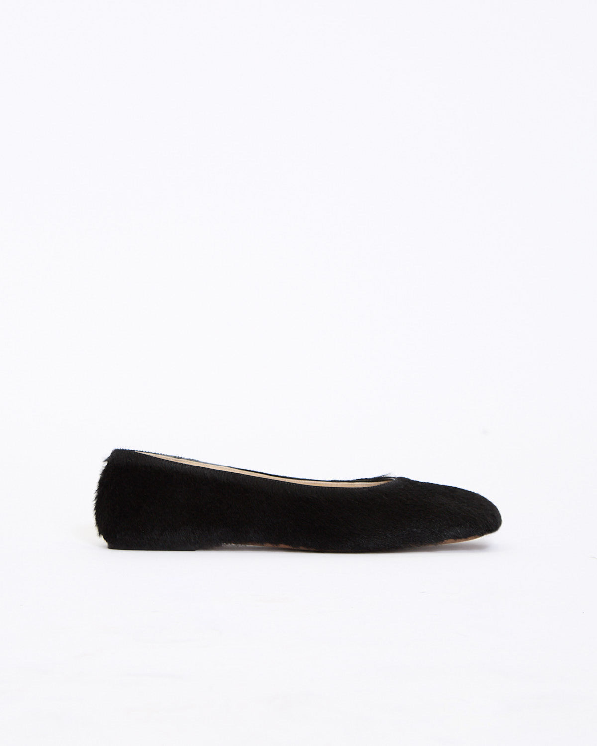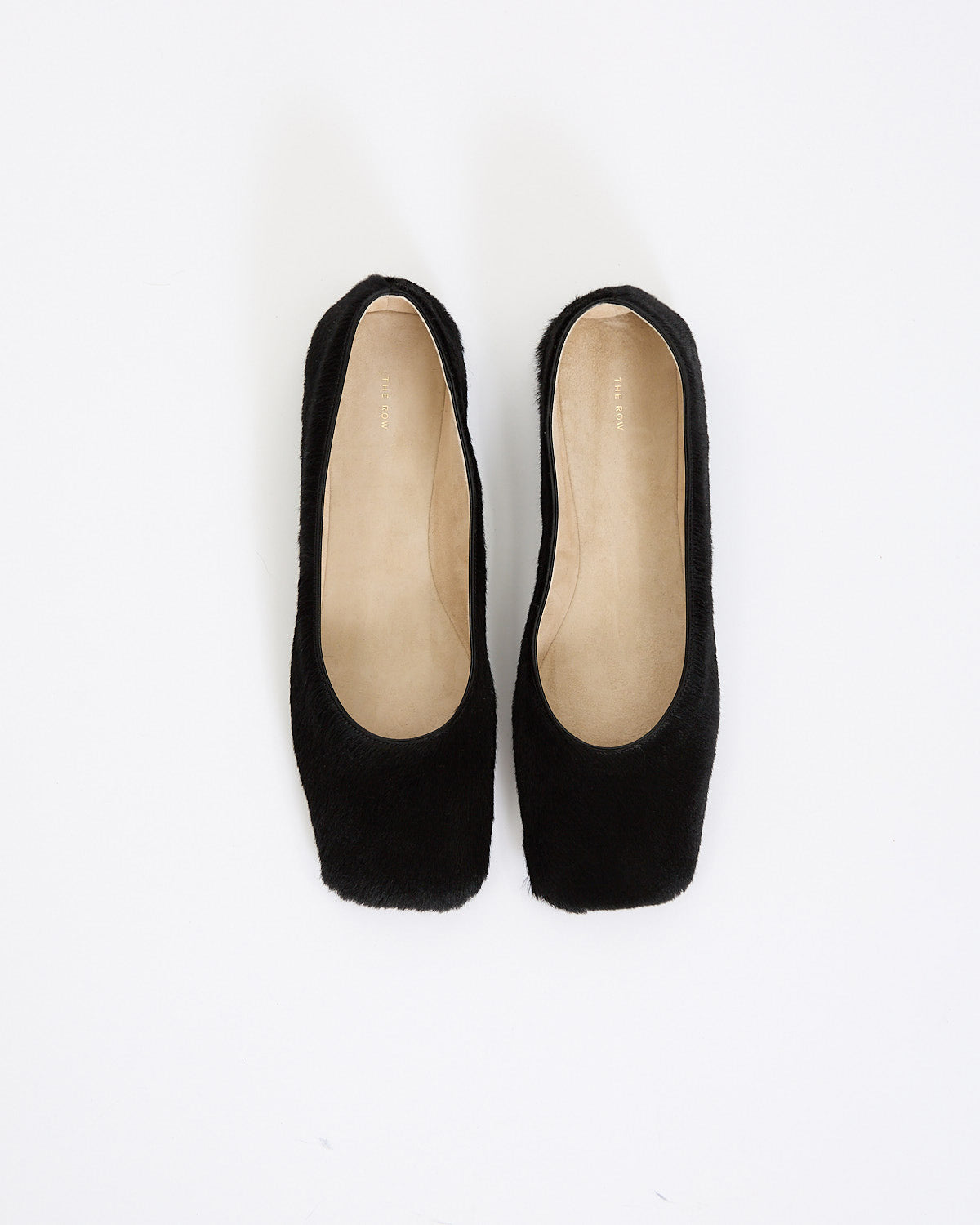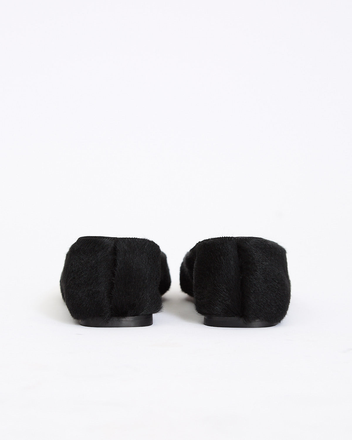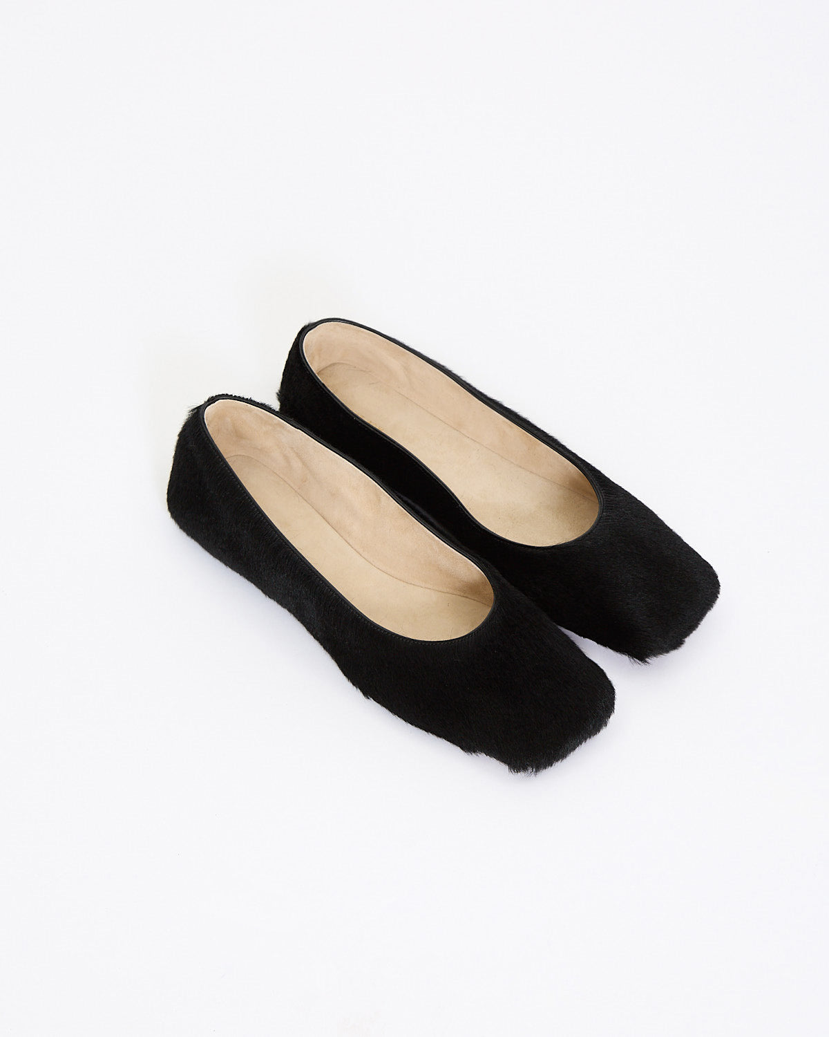 The Row Square Pony Ballet in black features a slip on design in a textured pony hair leather fabrication. Details include square toe and full leather construction.