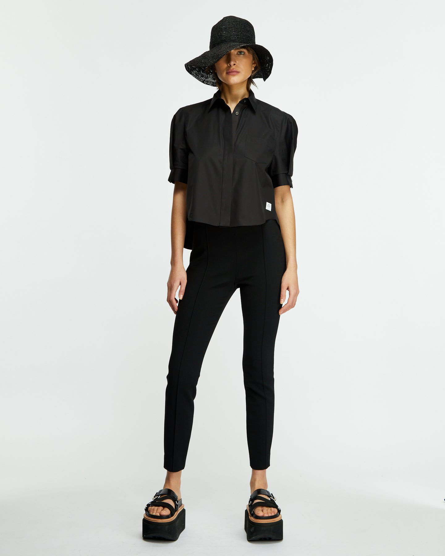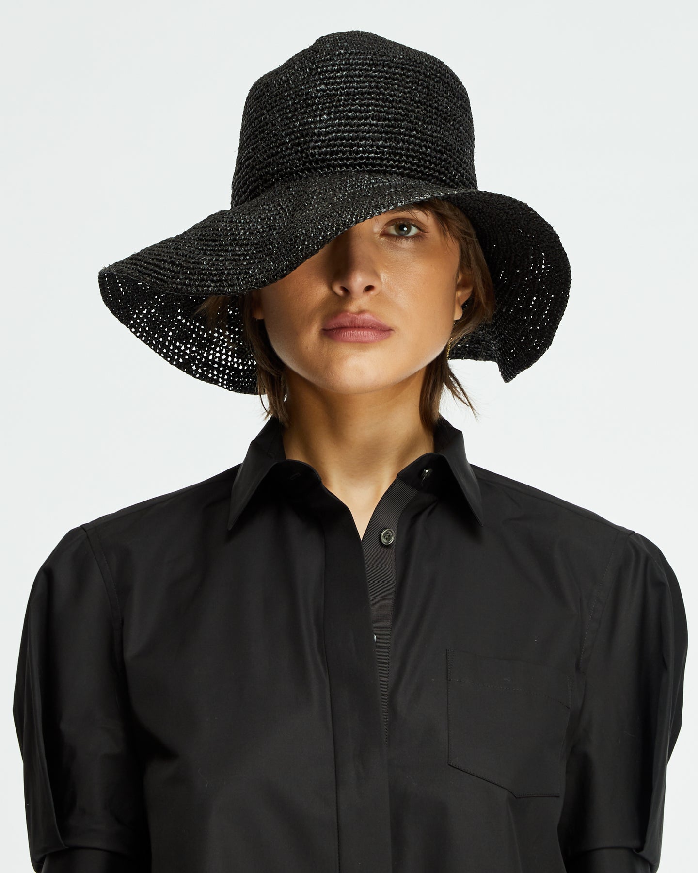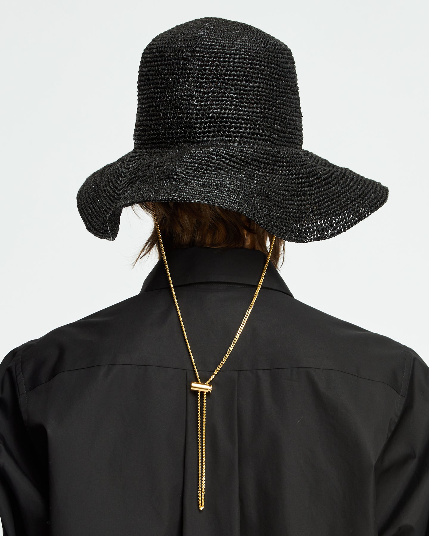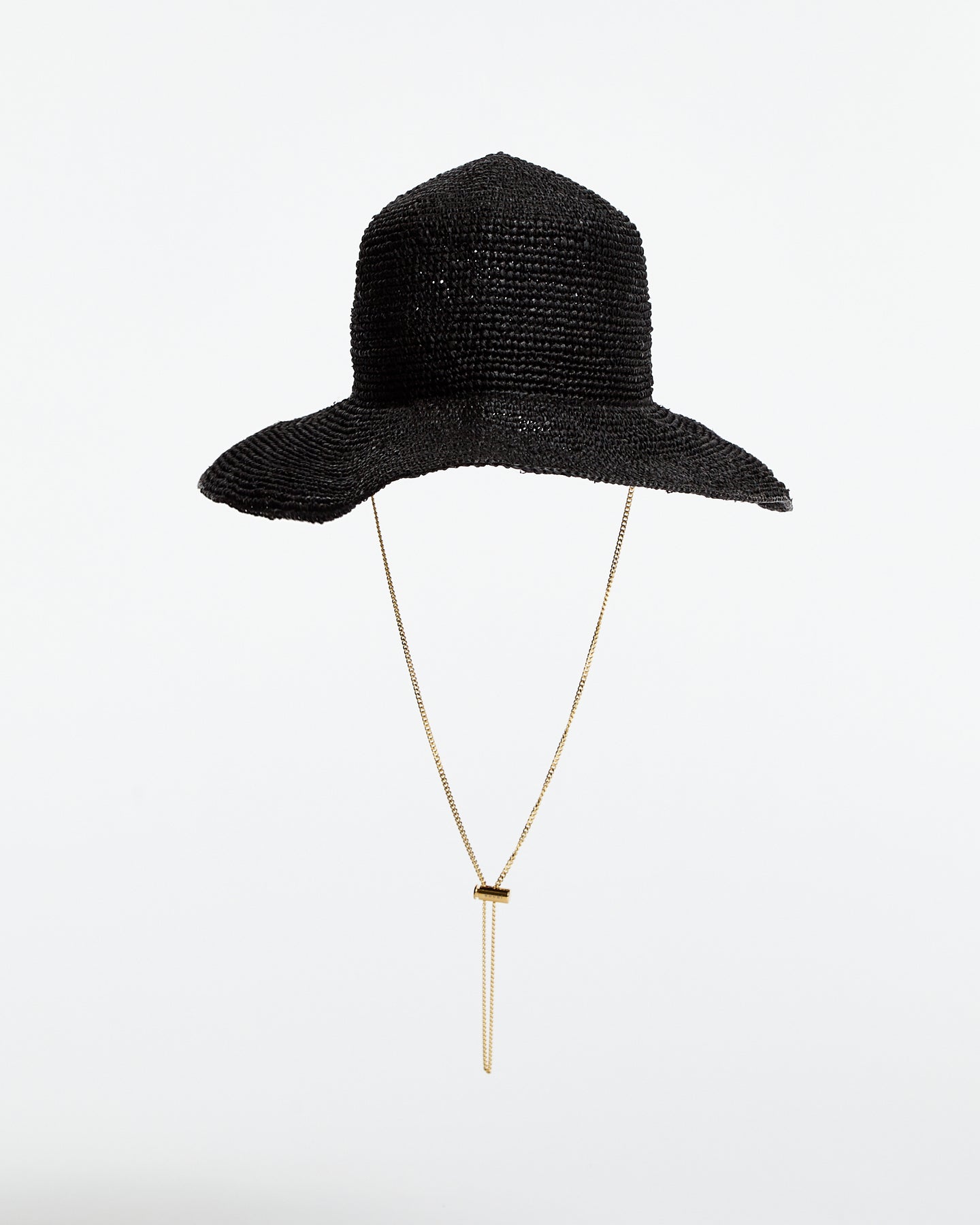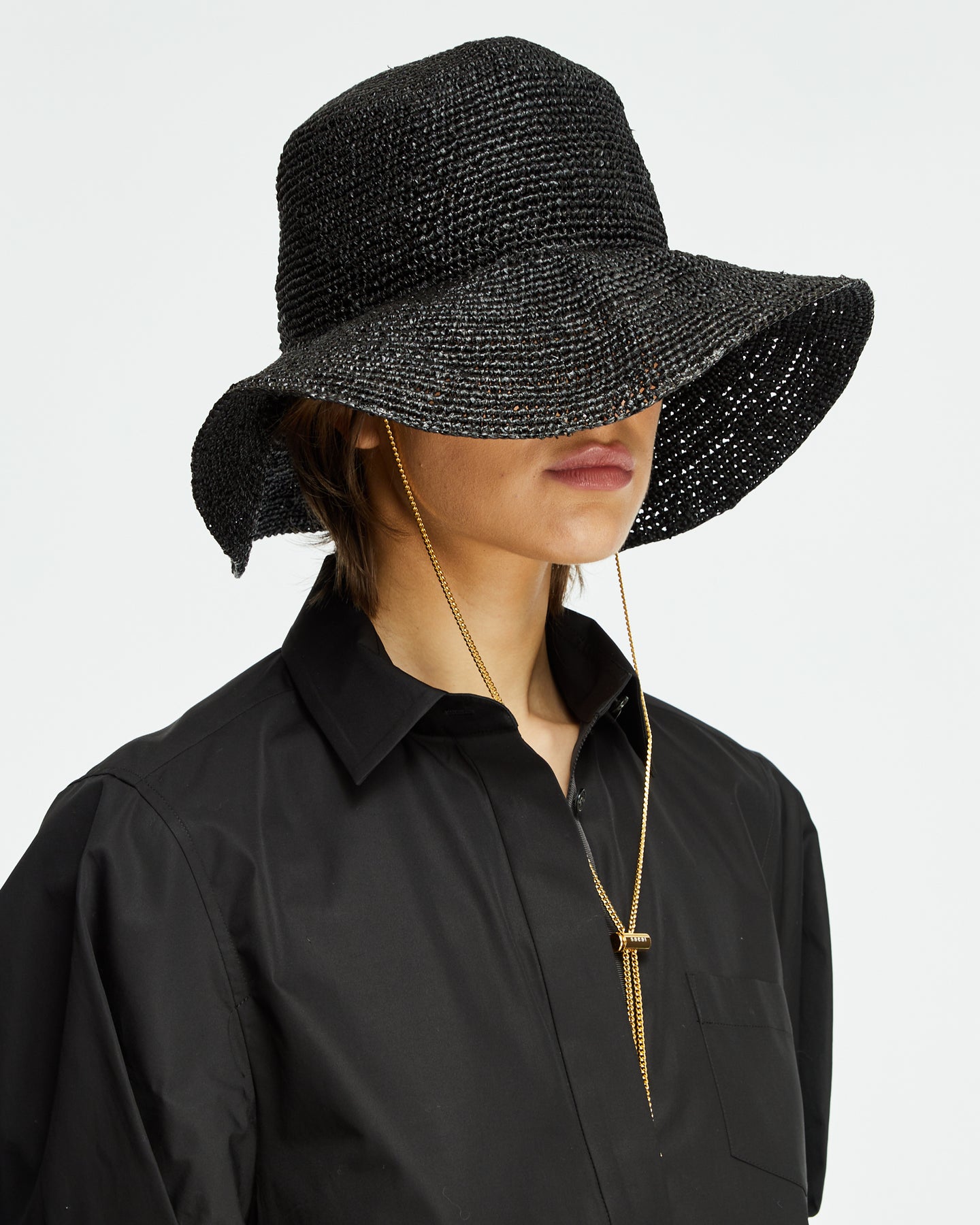 Sacai Straw Capeline in black features a classic straw floppy sunhat shape with adjustable gold chain neck strap.