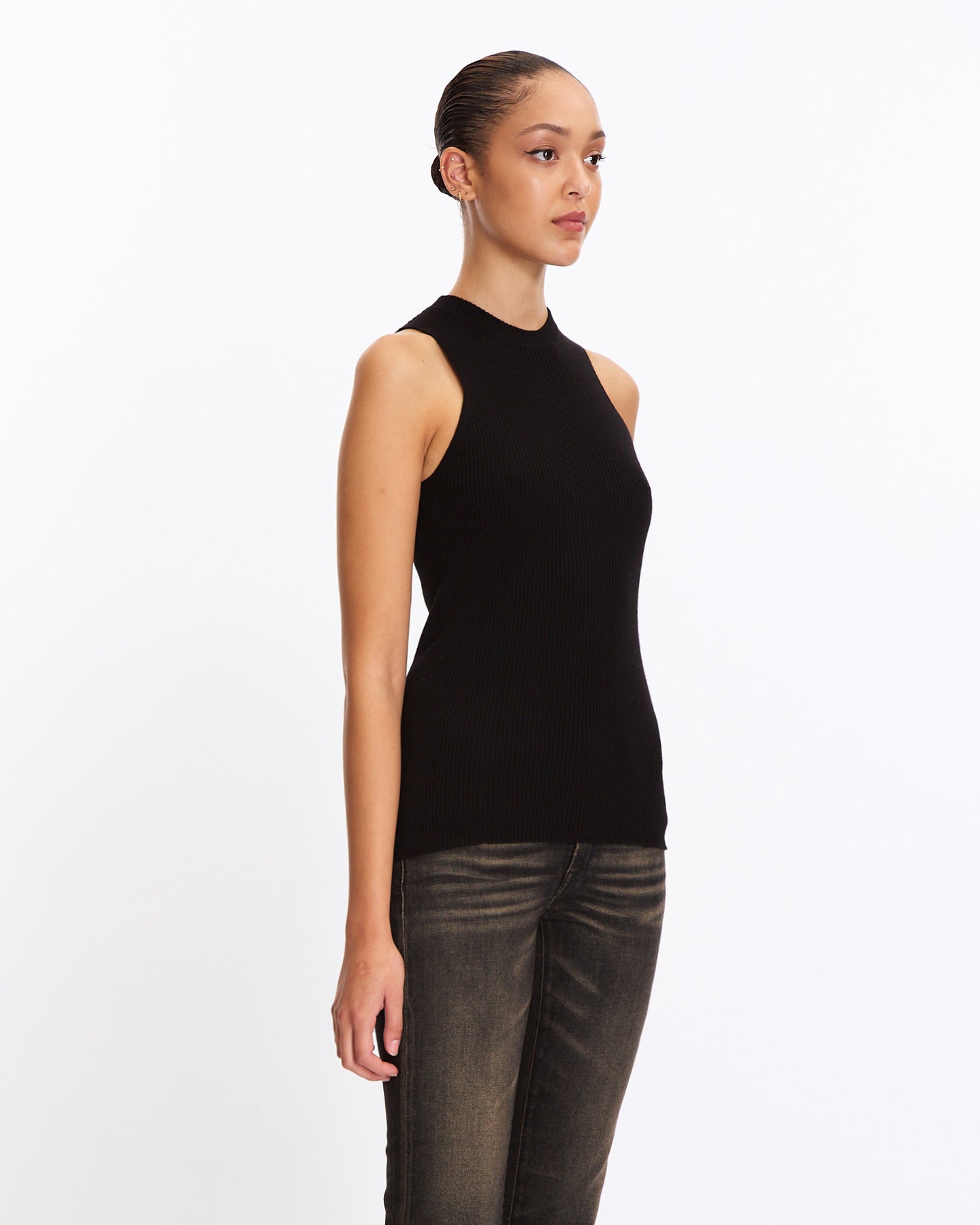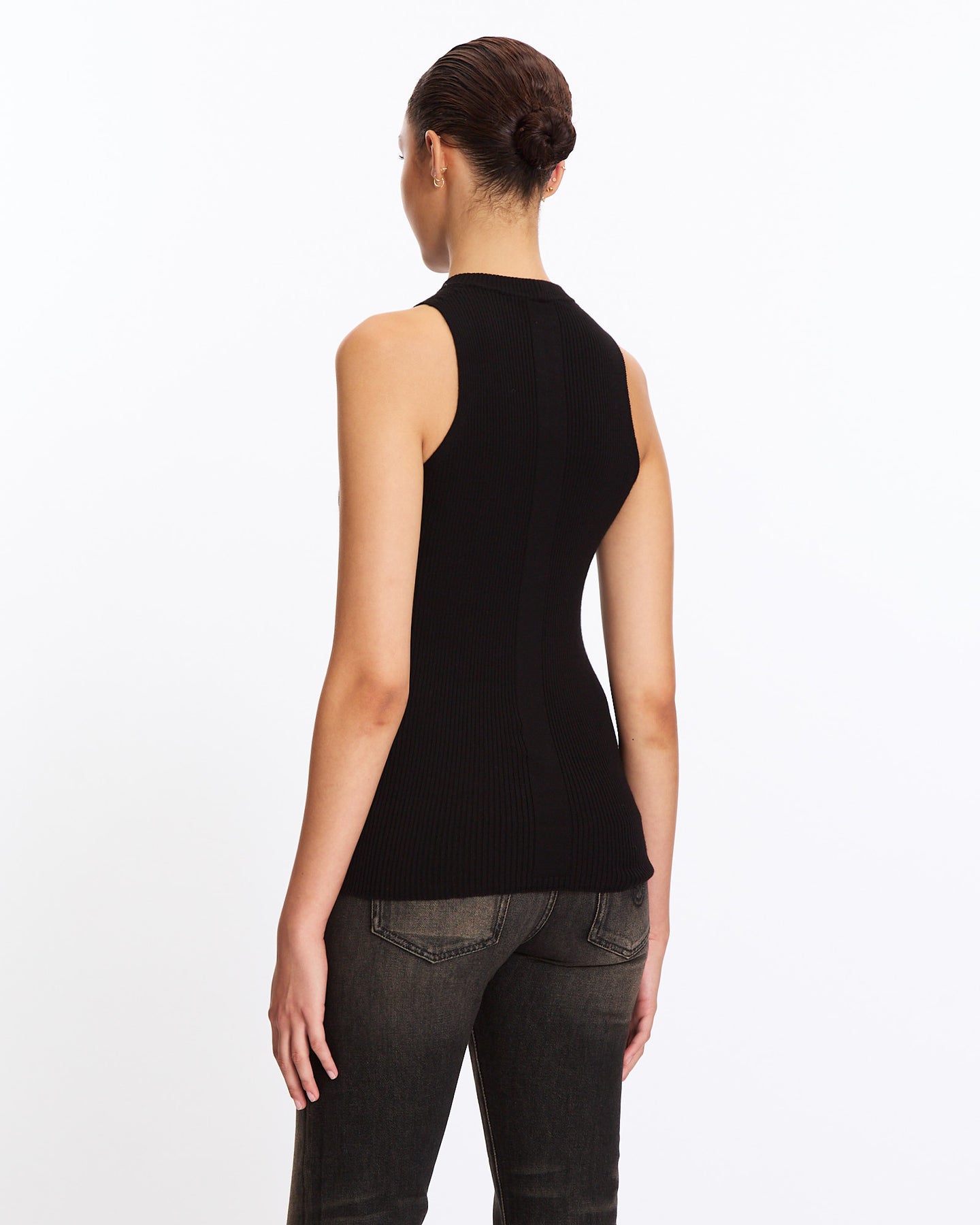 Rick Owens Tank in black features a fitted silhouette in lightweight ribbed knit. Details include rounded neckline with flat finish, signature knit channel running down centre back and lightweight wool fabrication.